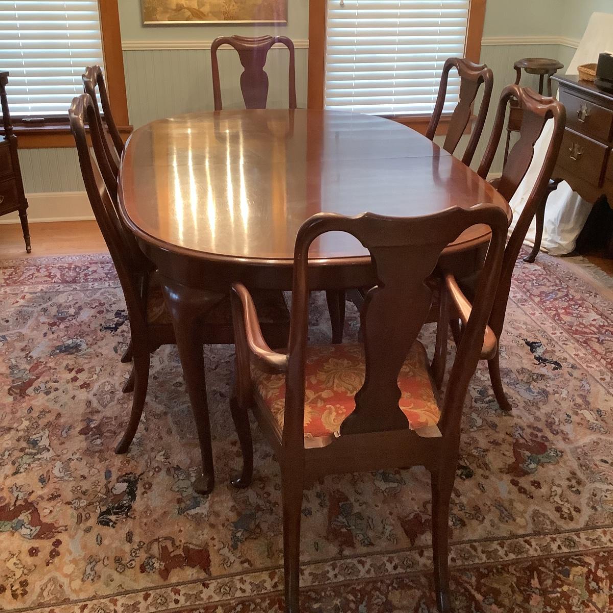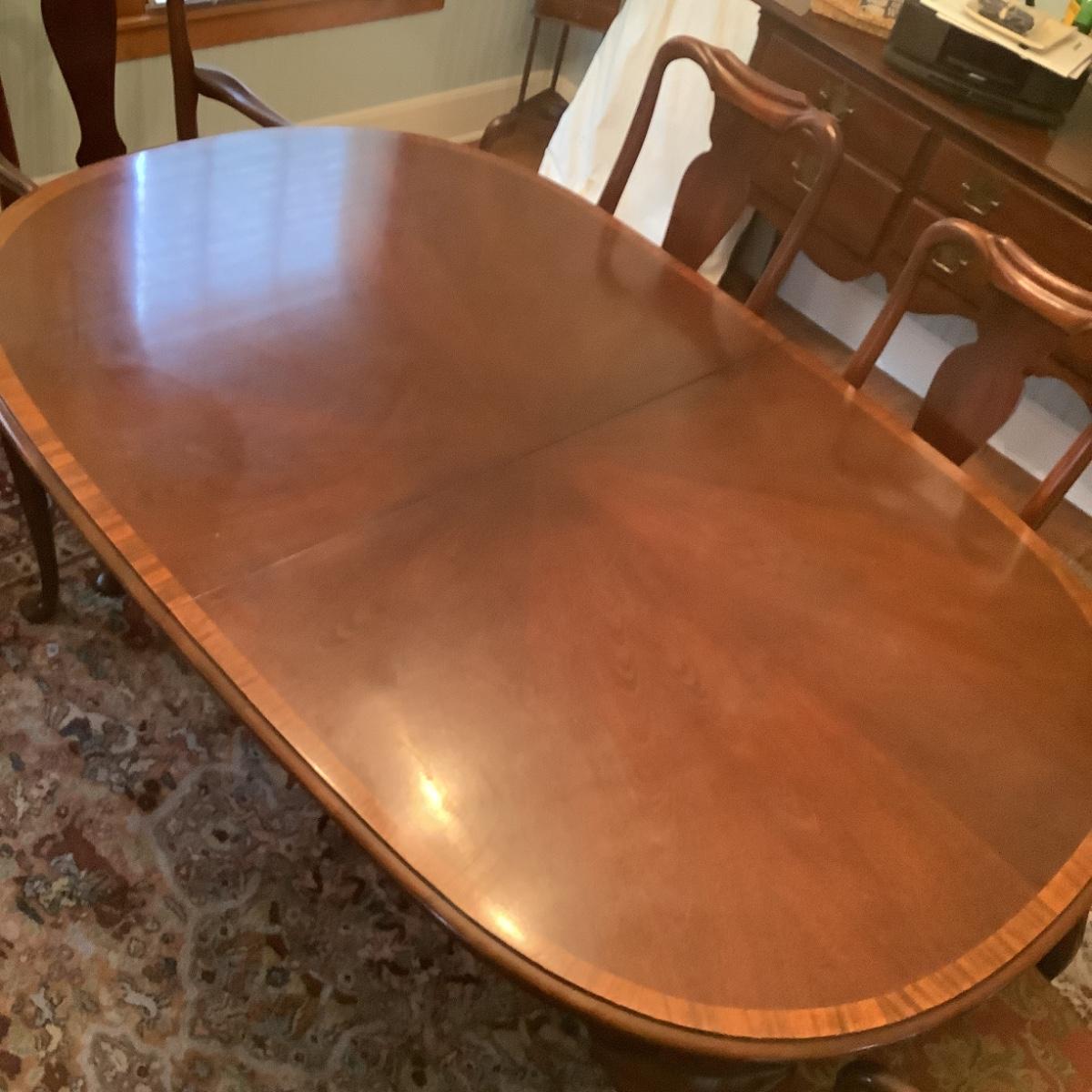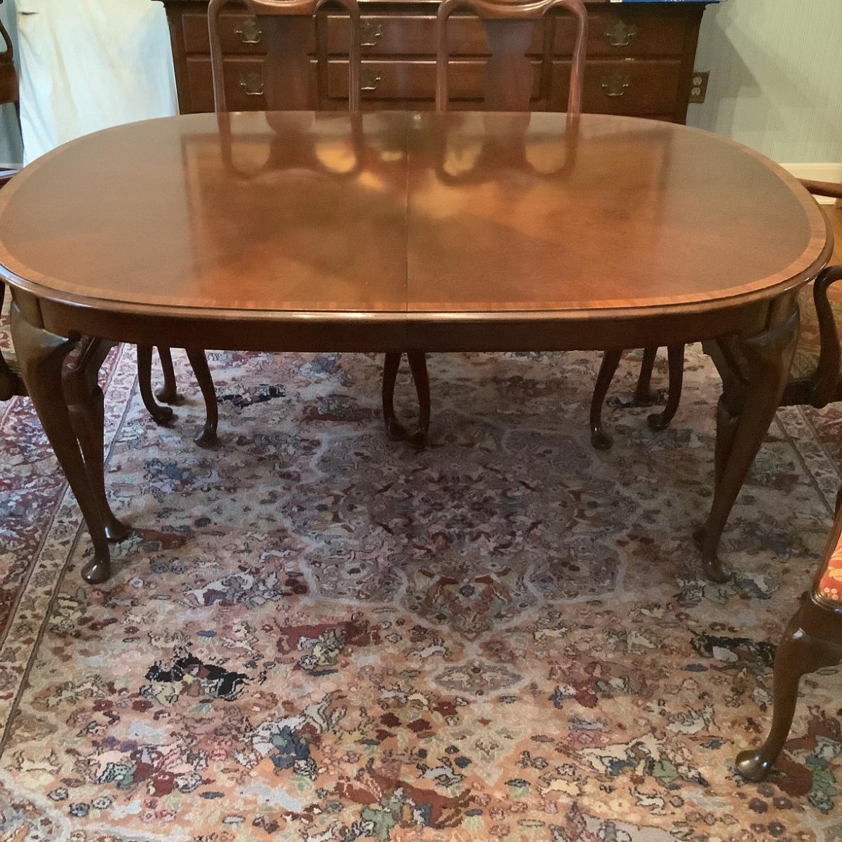 519 Vintage Hickory Chair Co. Queen Anne Style Mahogany Banded Dining Room Table with Leaves, Padding and 6 Chairs