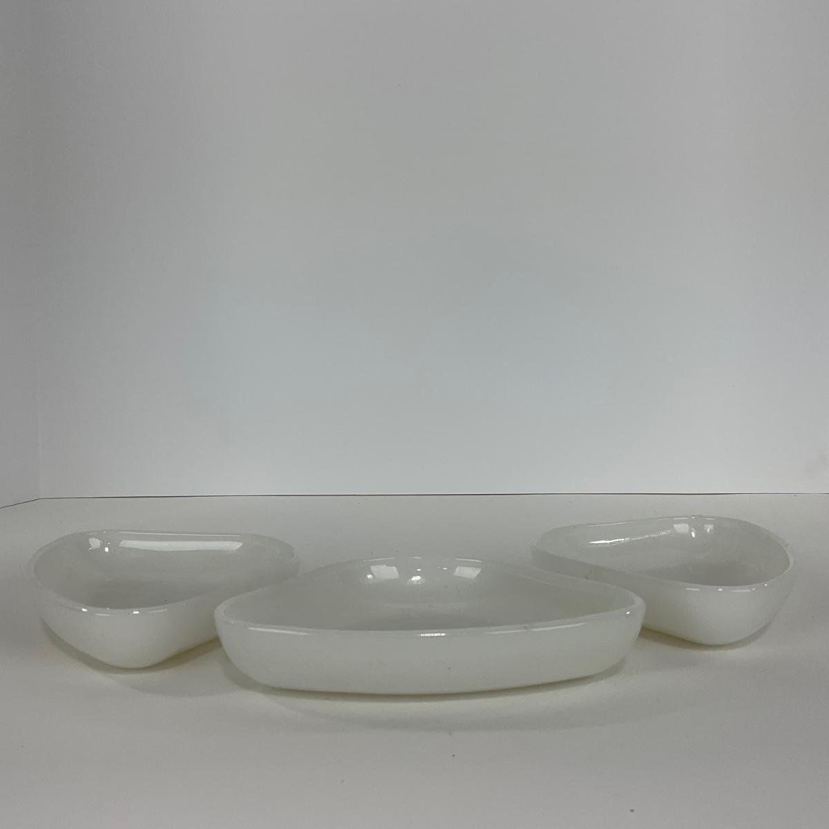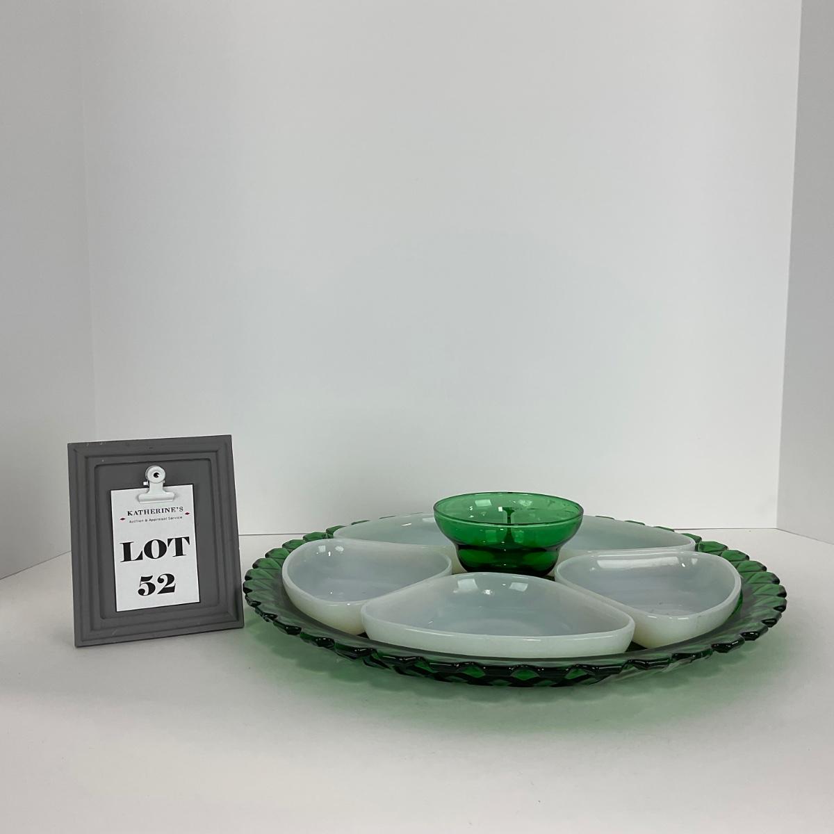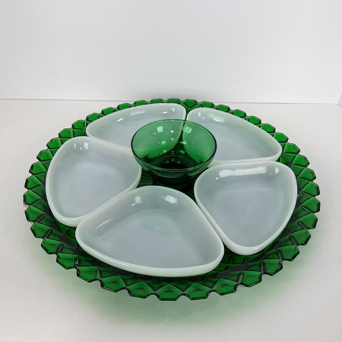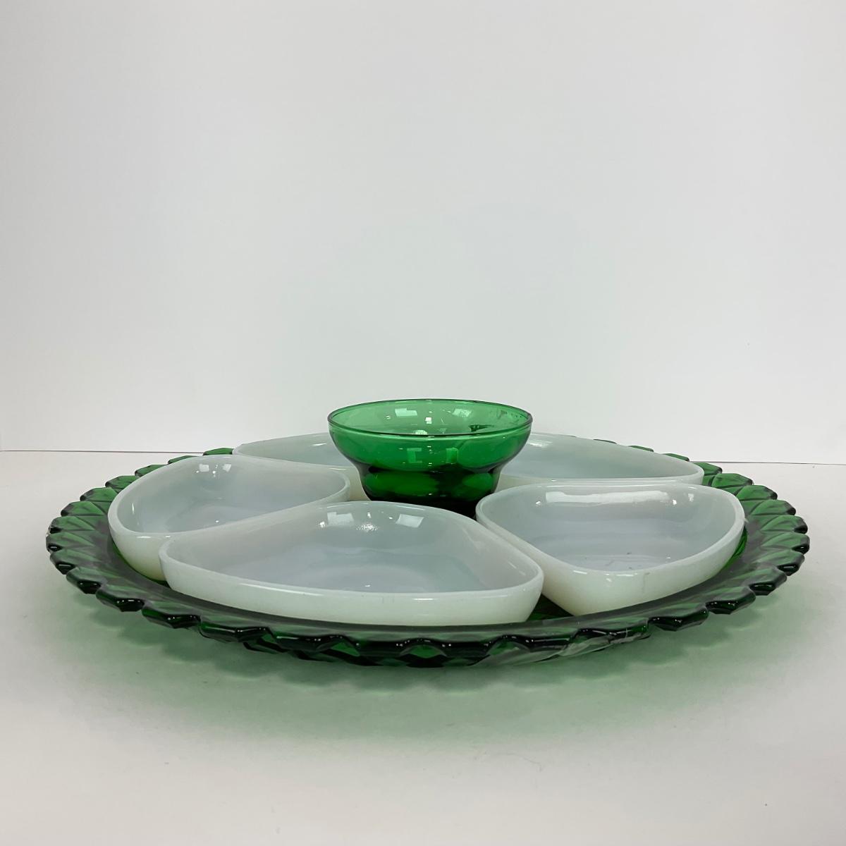 Seven piece set including a Forrest green Anchor Hocking Waterford Waffle Relish tray, five milk glass inserts, and small forrest green bowl. Please see photos for details and condition. ::: Shipping is available on this lot. If you require shipping you must let us know at the close of the auction. We will coordinate with you after the item has been won. Shipping fees will include insurance up to or exceeding the value of all items being mailed. If you have any questions regarding this lot please contact the auctioneer either via this website, by direct email or by phone. PICK UP TIMES and other important information can be found in the TERMS and DESCRIPTION of the auction. Please take a look for pertinent information. Thanks!