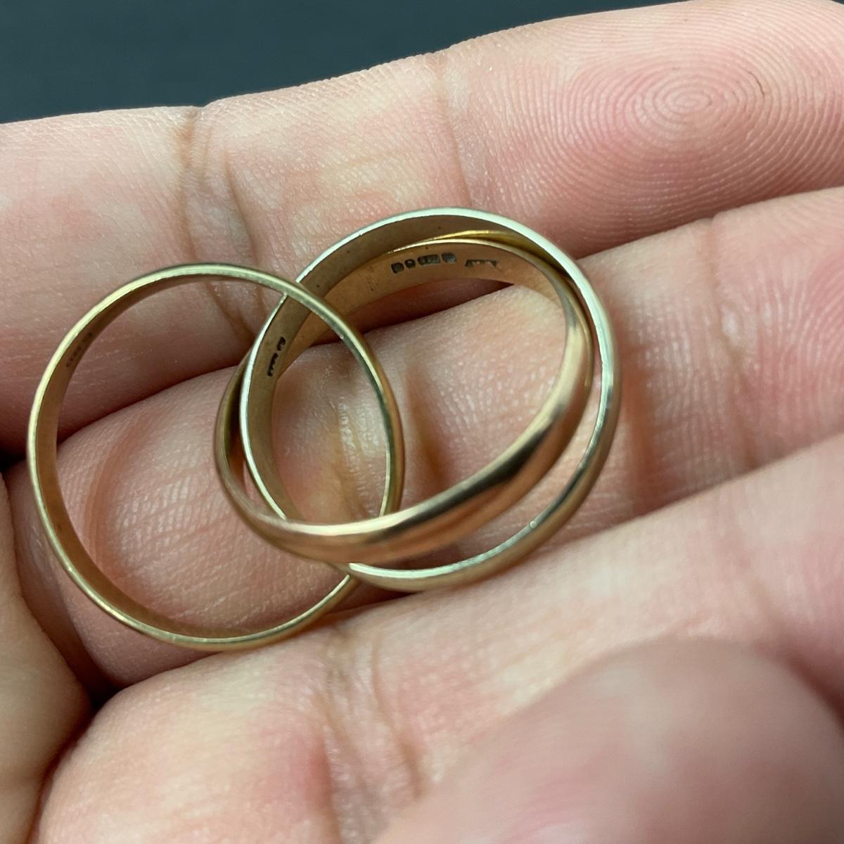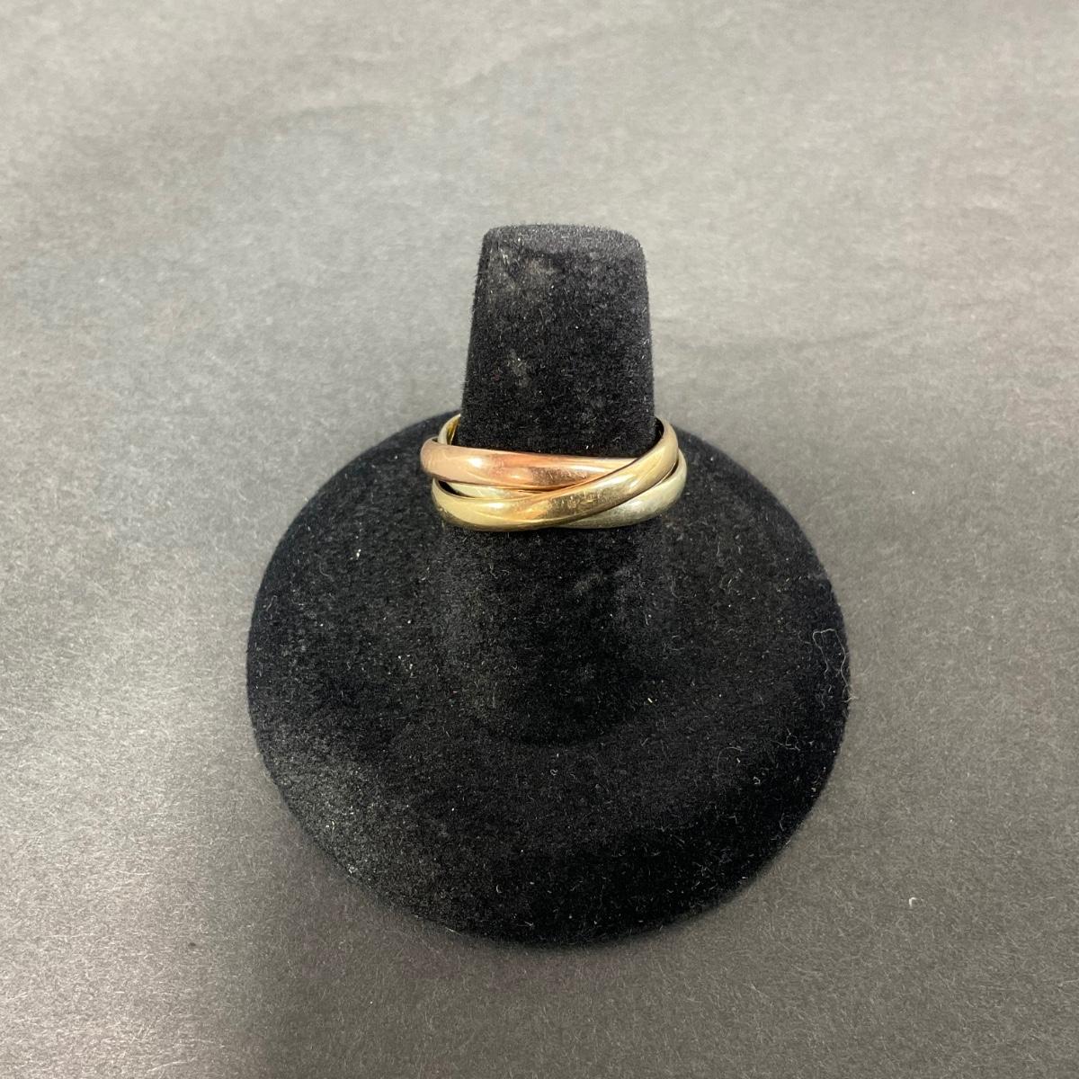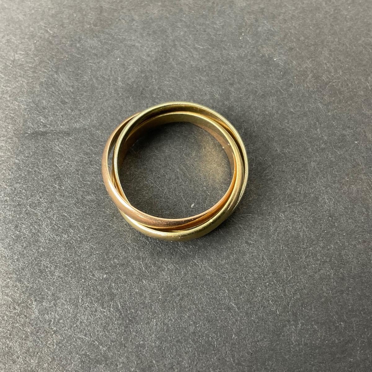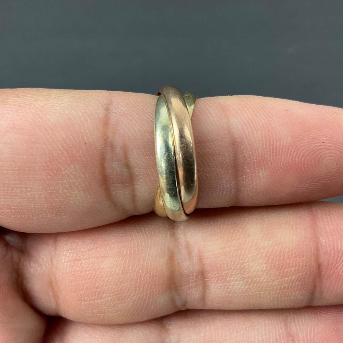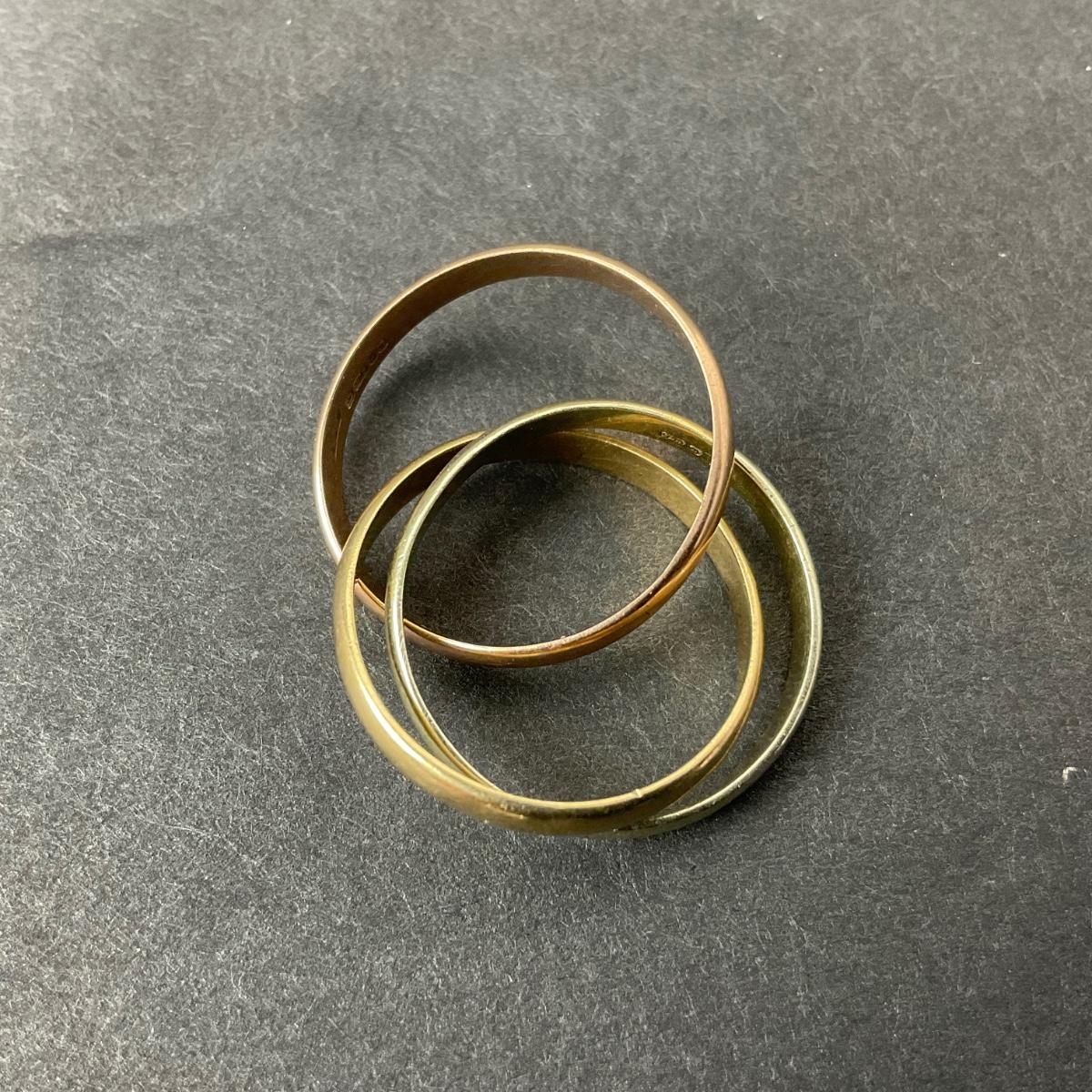 One tri ring marked 375 gold (9kt gold) with a total weight of 2.7 DWT. All three connected rings are marked and this ring is a size . Please see photos for details and condition. Any condition statement is given as a courtesy to a client, is an opinion, and should not be treated as a statement of fact. Reference to condition written, oral or within a condition report shall not be regarded as a full account of condition and may not include all defects, alterations, or restorations. Absence of a condition report does not imply a lot is flawless or lacking imperfections or damage. Katherine’s Auction & Appraisal Service shall have no responsibility for any error or omission. Returns shall not be accepted on the basis of condition. ::: Shipping is available on this lot. If you require shipping you must let us know at the close of the auction. We will coordinate with you after the item has been won. Shipping fees will include insurance up to or exceeding the value of all items being mailed. If you have any questions regarding this lot please contact the auctioneer either via this website, by direct email or by phone. PICK UP TIMES and other important information can be found in the TERMS and DESCRIPTION of the auction. Please take a look for pertinent information. Thanks!