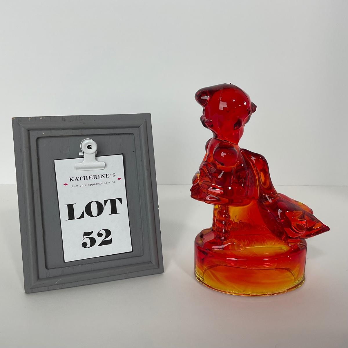 One LE Smith red Amberina goose and girl figure. 4 inches wide by 6 inches tall. This piece has no damage, and appears to be in great shape with no visable chips, cracks, or broken pieces. Please see photos for details and condition. Any condition statement is given as a courtesy to a client, is an opinion, and should not be treated as a statement of fact. Reference to condition written, oral or within a condition report shall not be regarded as a full account of condition and may not include all defects, alterations, or restorations. Absence of a condition report does not imply a lot is flawless or lacking imperfections or damage. Katherine’s Auction & Appraisal Service shall have no responsibility for any error or omission. Returns shall not be accepted on the basis of condition. ::: Shipping is available on this lot. If you require shipping you must let us know at the close of the auction. We will coordinate with you after the item has been won. Shipping fees will include insurance up to or exceeding the value of all items being mailed. If you have any questions regarding this lot please contact the auctioneer either via this website, by direct email or by phone. PICK UP TIMES and other important information can be found in the TERMS and DESCRIPTION of the auction. Please take a look for pertinent information. Thanks!