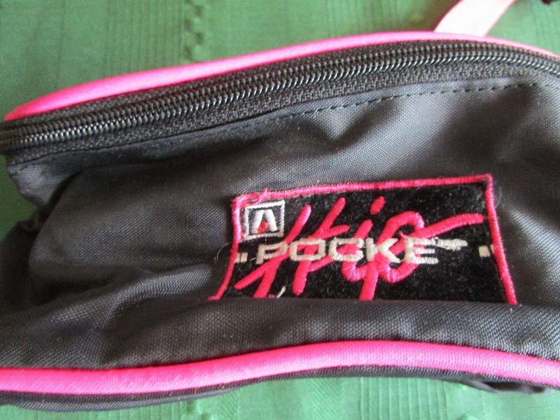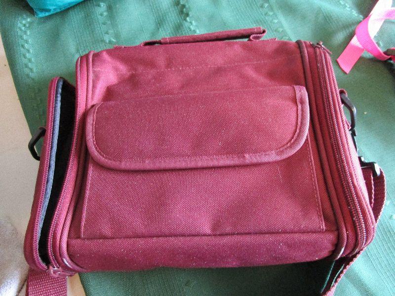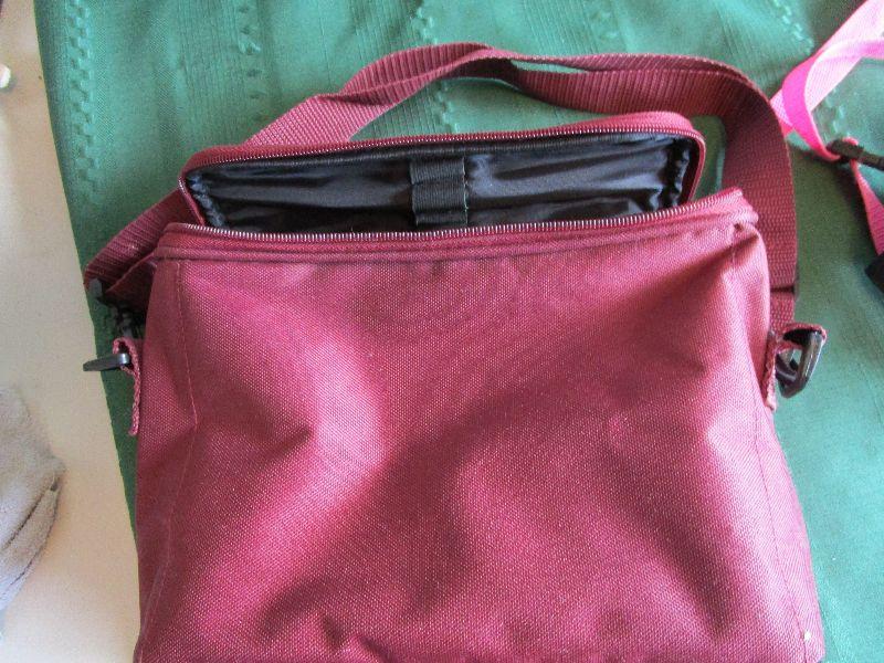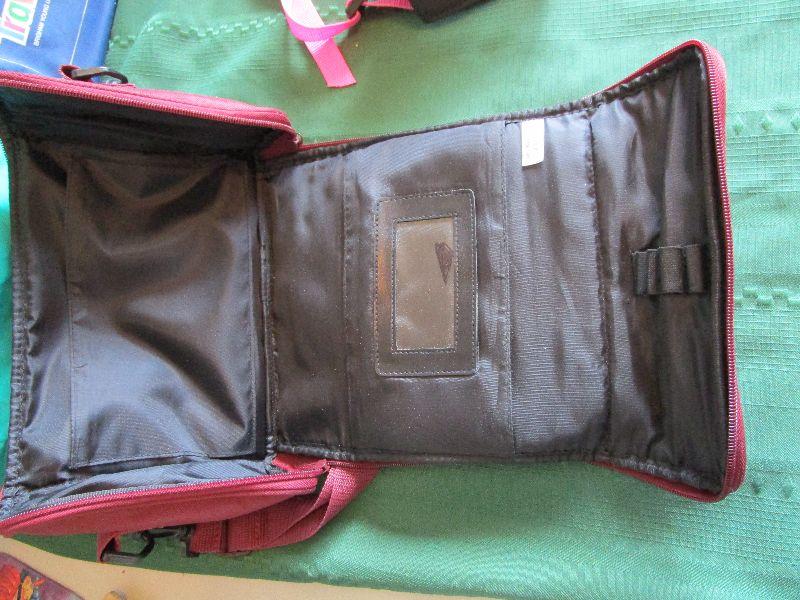 Teal and White Lunch bag 10" x 9" x 6", New Black and Pink Fanny pack 7 1/2" x 3" x 4", New Burgundy scripture bag9" x 7" x 3 1/2"; Blue travel bag 11" x 12" x 5"