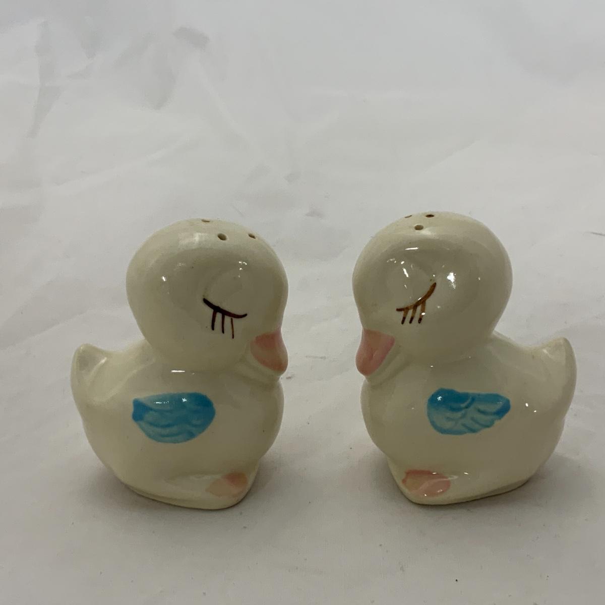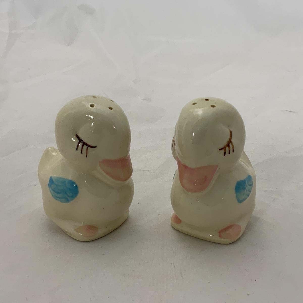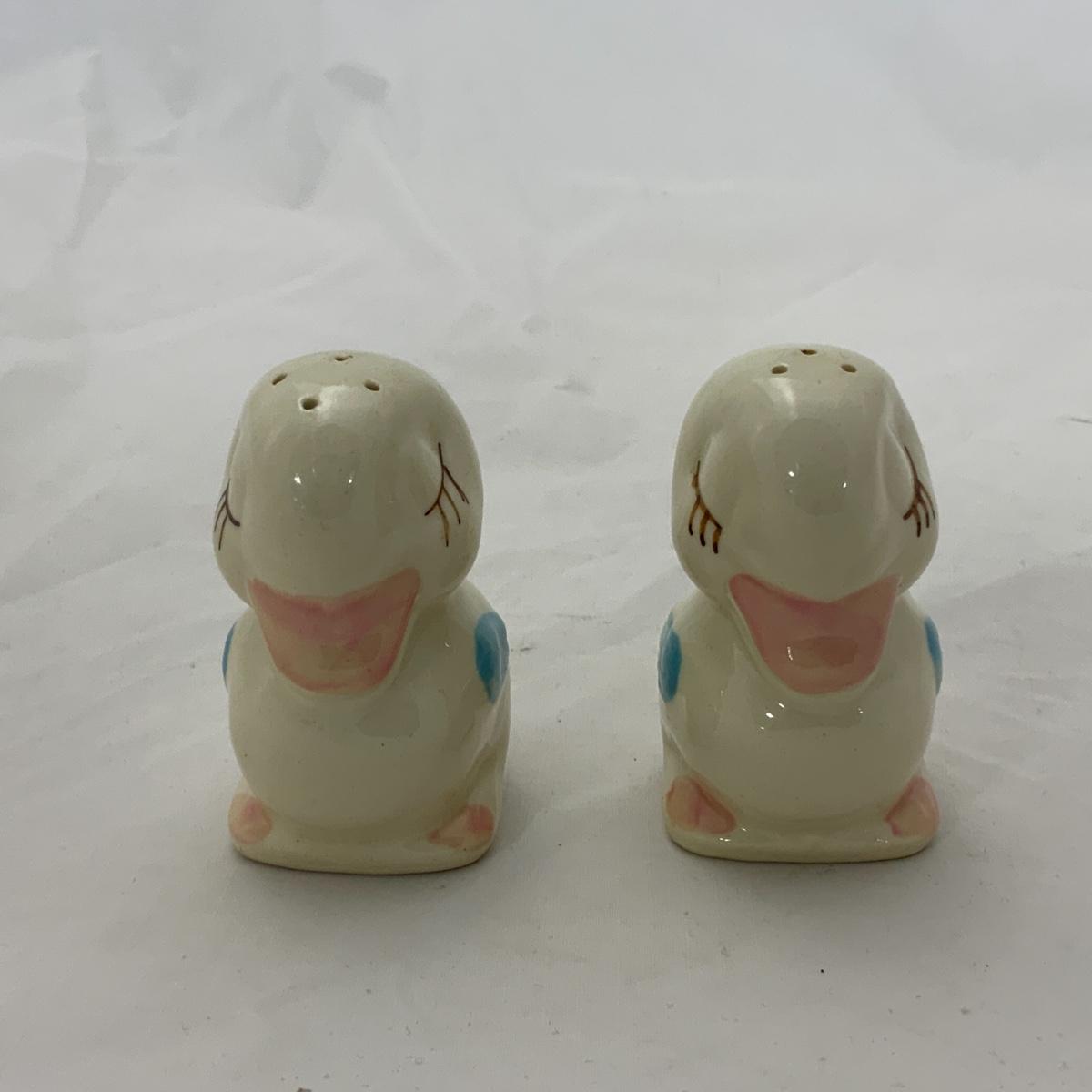 From the Estate of Peter and Alice Radovanovich: Precious set of Duck Salt and Pepper Shakers from Shawnee Pottery. Both are in exceptional vintage condition with no issues noted. Please see photos for details and condition. ::: Shipping is available on this lot. If you require shipping you must let us know at the close of the auction. We will coordinate with you after the item has been won. Shipping fees will include insurance up to or exceeding the value of all items being mailed. If you have any questions regarding this lot please contact the auctioneer either via this website, by direct email or by phone. PICK UP TIMES and other important information can be found in the TERMS and DESCRIPTION of the auction. Please take a look for pertinent information. Thanks!
