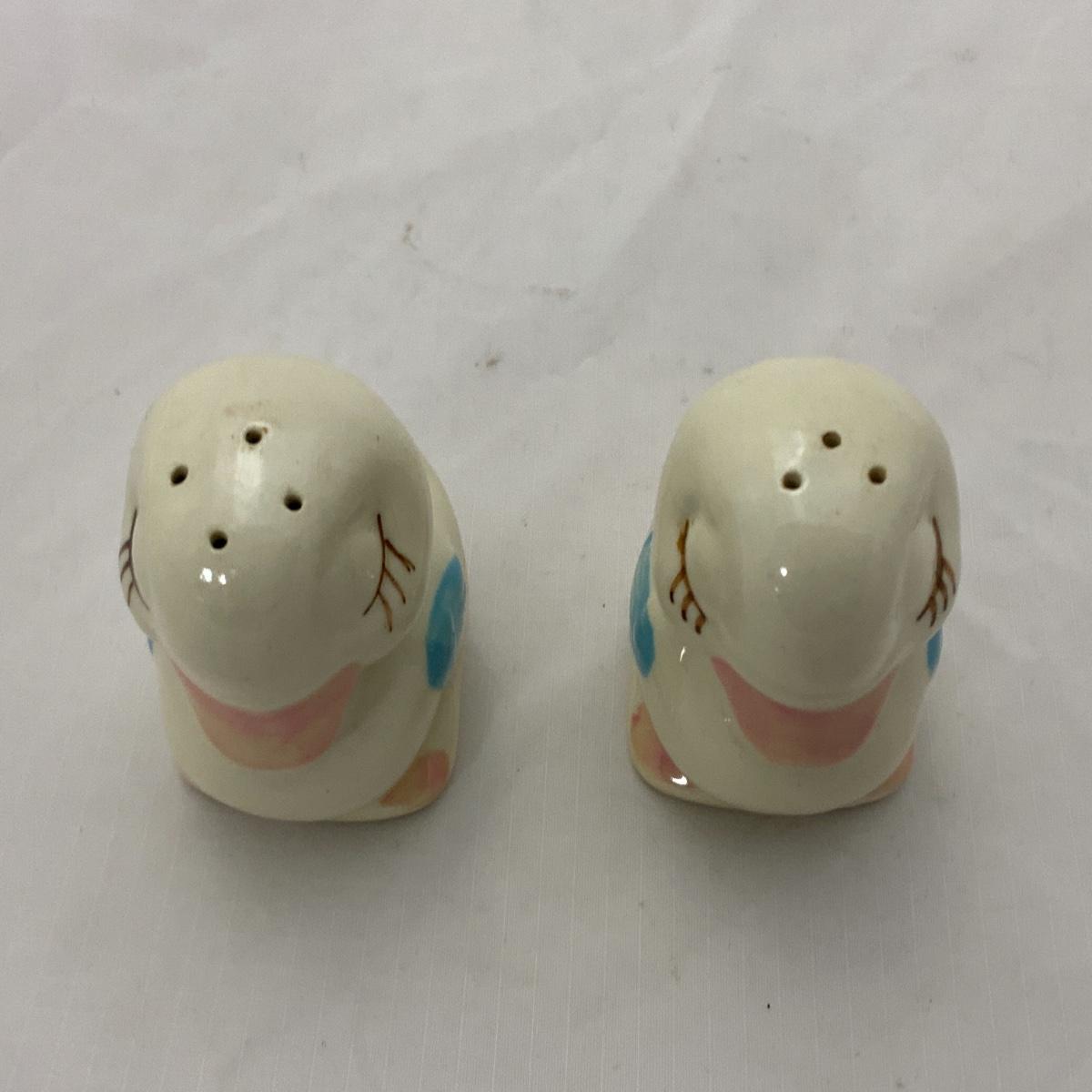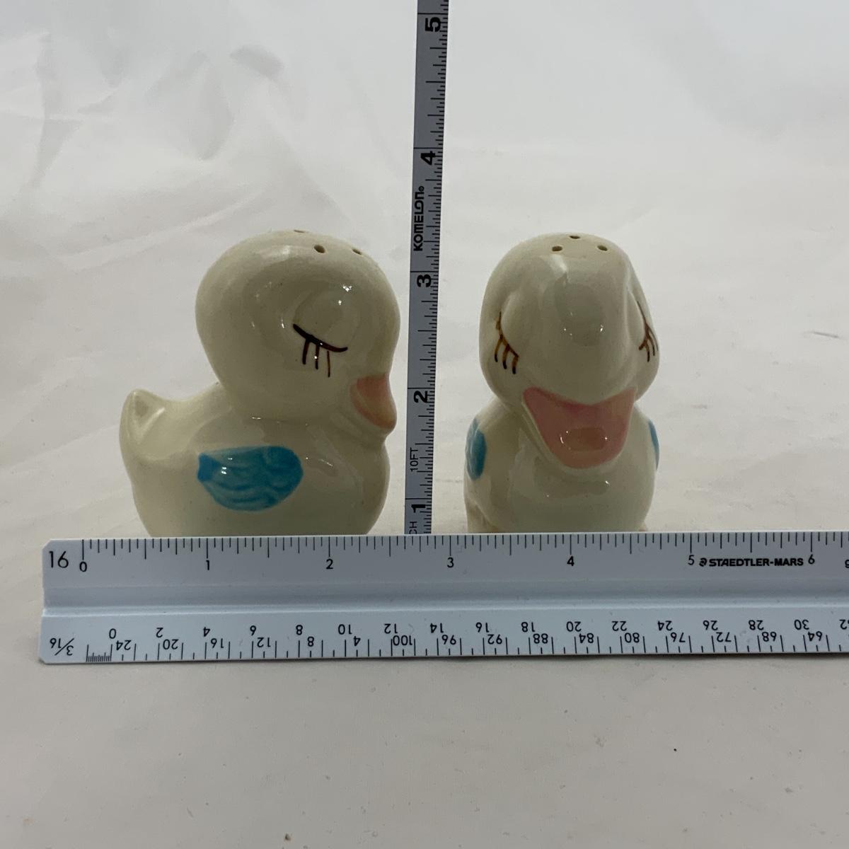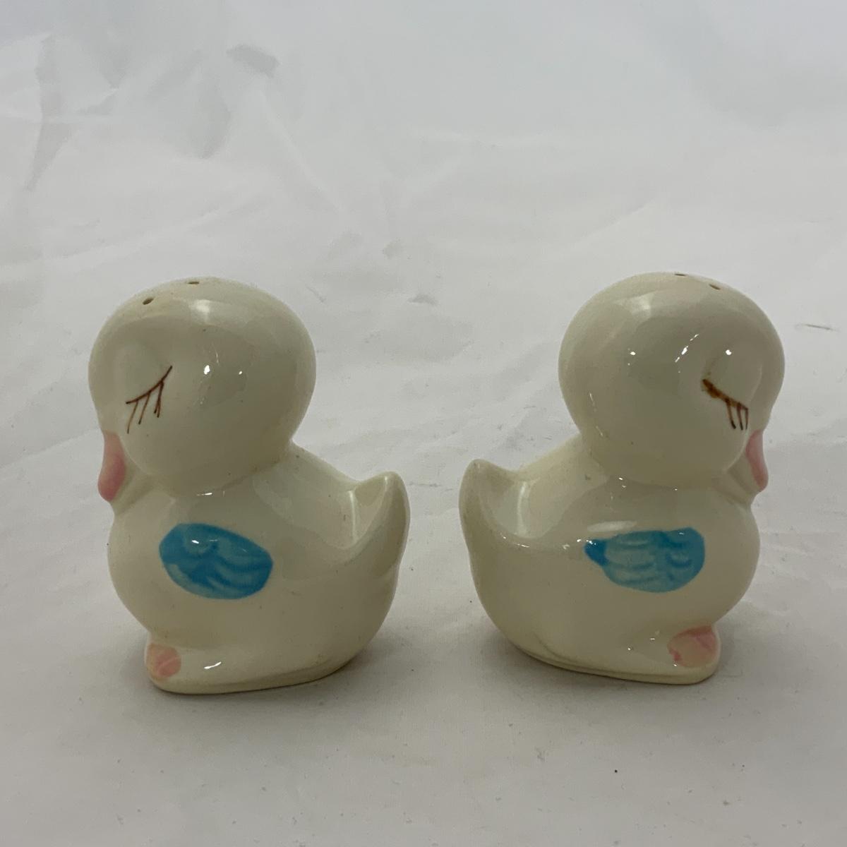 From the Estate of Peter and Alice Radovanovich: Precious set of Duck Salt and Pepper Shakers from Shawnee Pottery. Both are in exceptional vintage condition with no issues noted. Please see photos for details and condition. ::: Shipping is available on this lot. If you require shipping you must let us know at the close of the auction. We will coordinate with you after the item has been won. Shipping fees will include insurance up to or exceeding the value of all items being mailed. If you have any questions regarding this lot please contact the auctioneer either via this website, by direct email or by phone. PICK UP TIMES and other important information can be found in the TERMS and DESCRIPTION of the auction. Please take a look for pertinent information. Thanks!