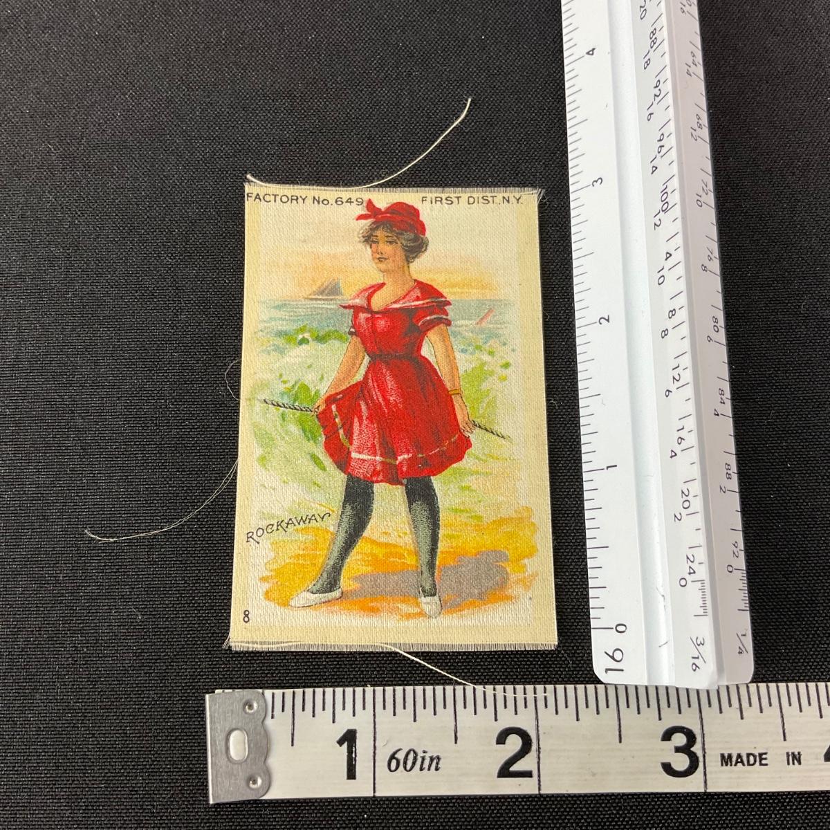 One antique Edwardian bathing beauty tobacco silk. #8 Rockaway Silk. Please see photos for details and condition. Any condition statement is given as a courtesy to a client, is an opinion, and should not be treated as a statement of fact. Reference to condition written, oral or within a condition report shall not be regarded as a full account of condition and may not include all defects, alterations, or restorations. Absence of a condition report does not imply a lot is flawless or lacking imperfections or damage. Katherine’s Auction & Appraisal Service shall have no responsibility for any error or omission. Returns shall not be accepted on the basis of condition. ::: Shipping is available on this lot. If you require shipping you must let us know at the close of the auction. We will coordinate with you after the item has been won. Shipping fees will include insurance up to or exceeding the value of all items being mailed. If you have any questions regarding this lot please contact the auctioneer either via this website, by direct email or by phone. PICK UP TIMES and other important information can be found in the TERMS and DESCRIPTION of the auction. Please take a look for pertinent information. Thanks!