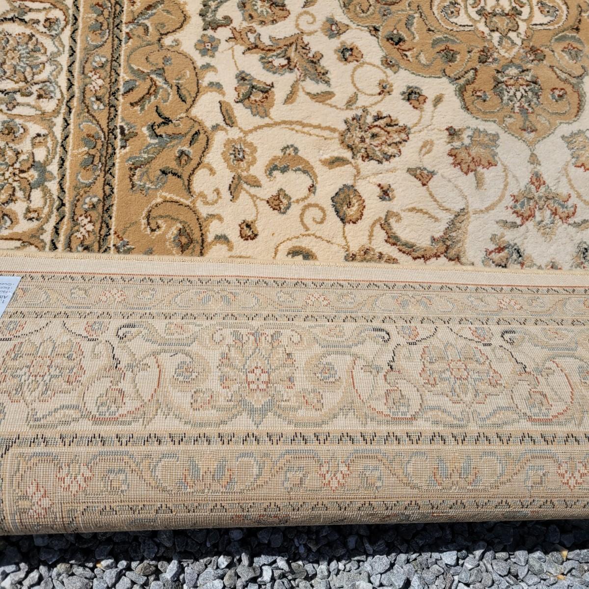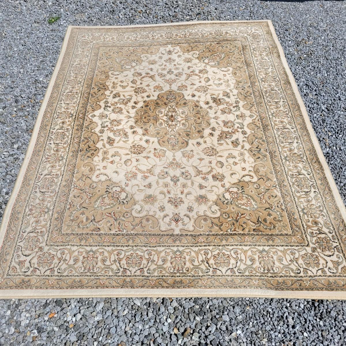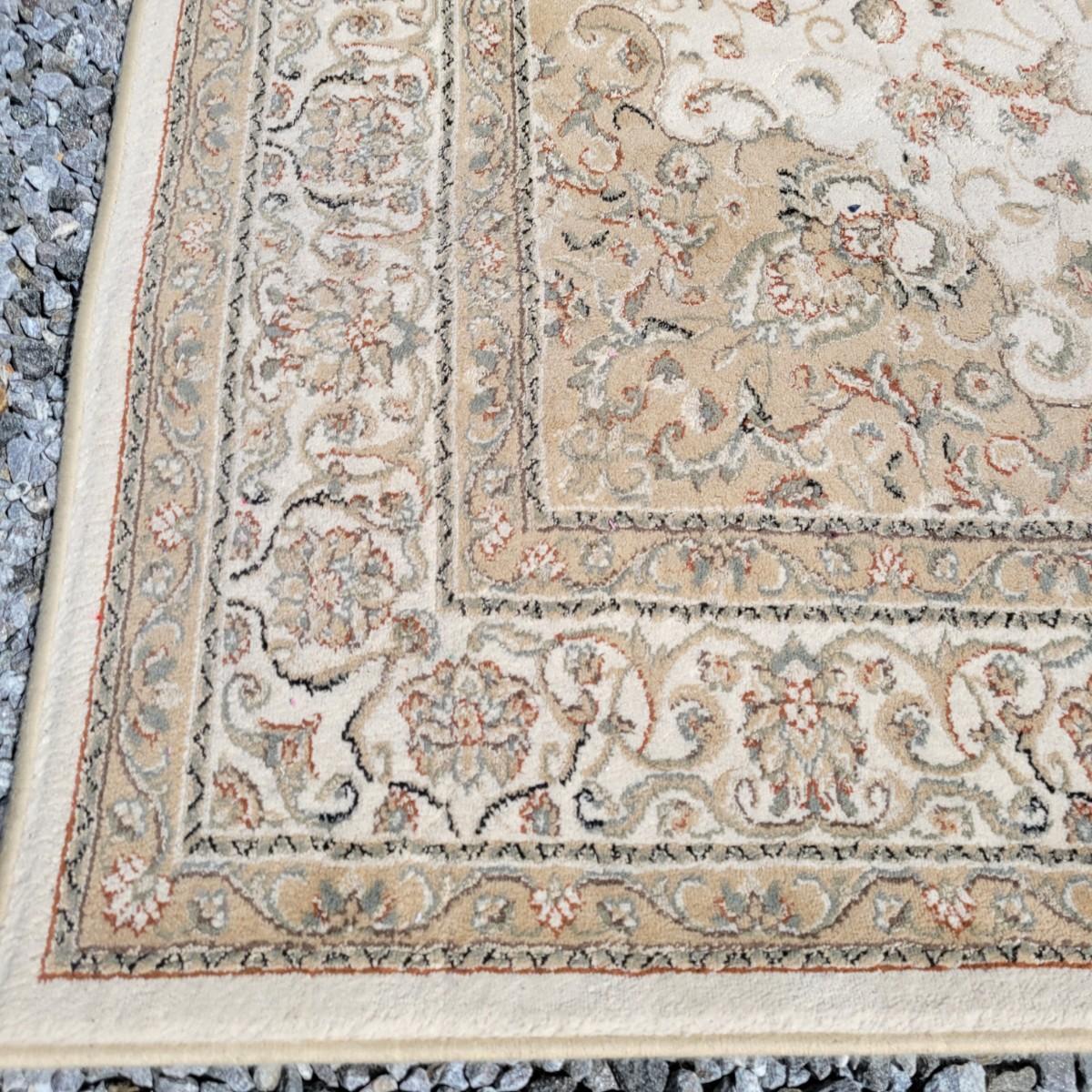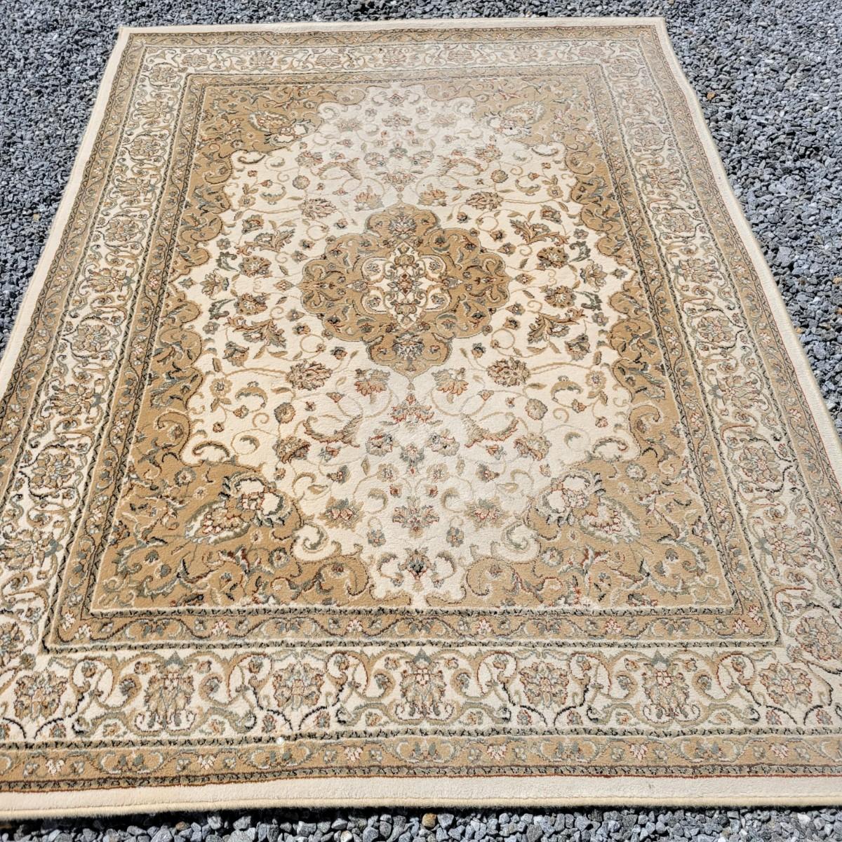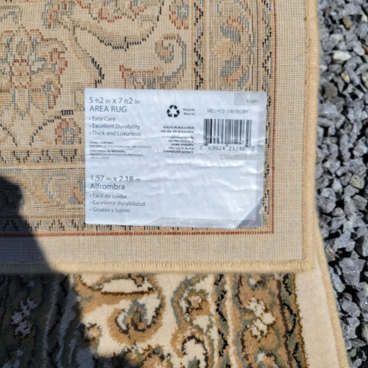 An area rug that measures 5'2" x 7'2" that is beige and cream with black, orange and green accents. Local pickup only