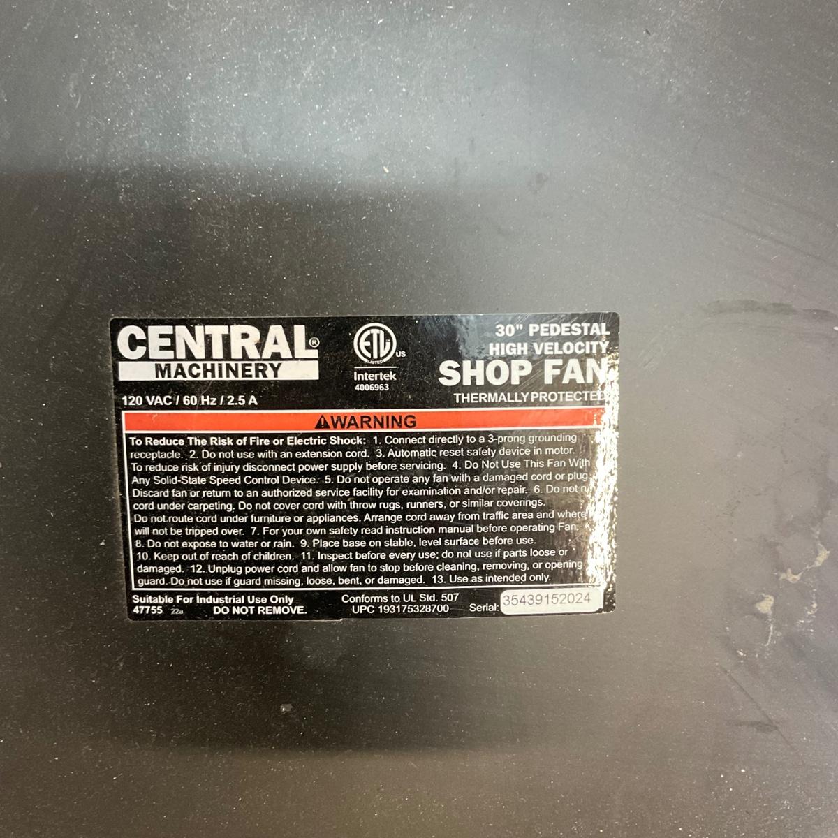 520 Central Machinery 30" Pedestal High Velocity Fan