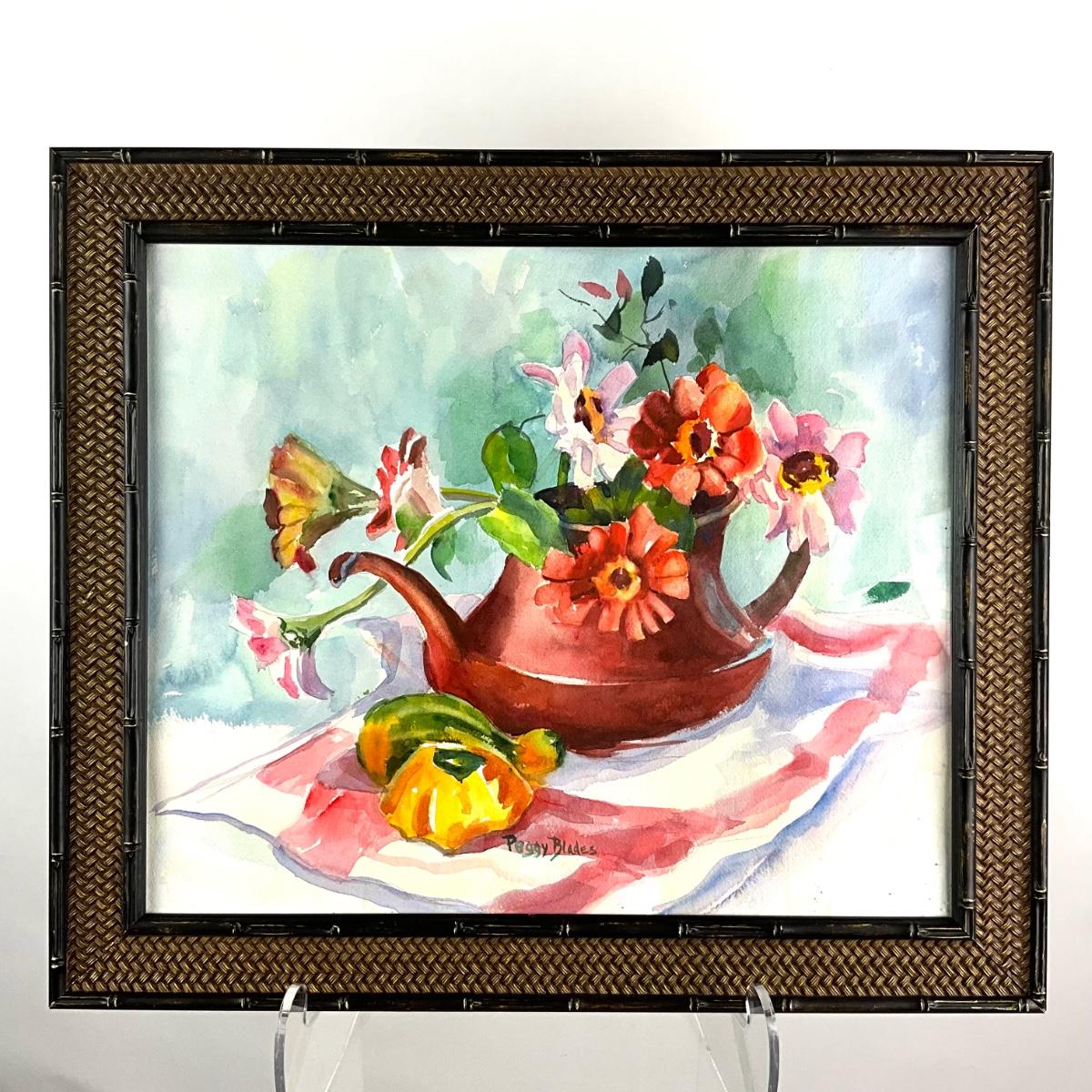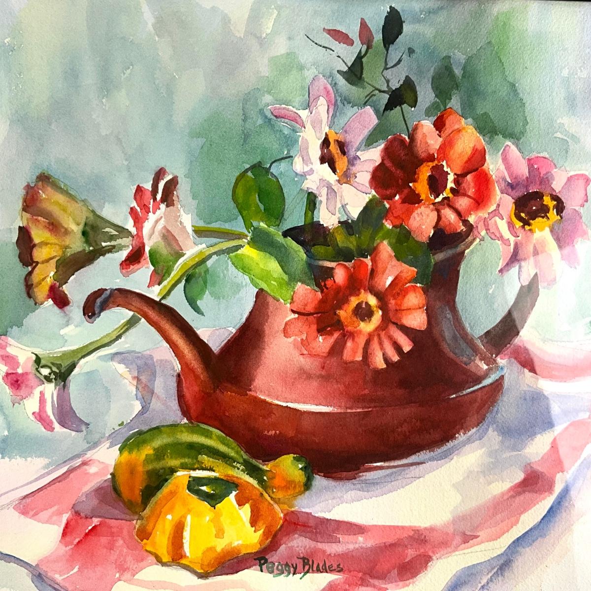 522 Original Watercolor of Teapot and Zinnias by Peggy Blades