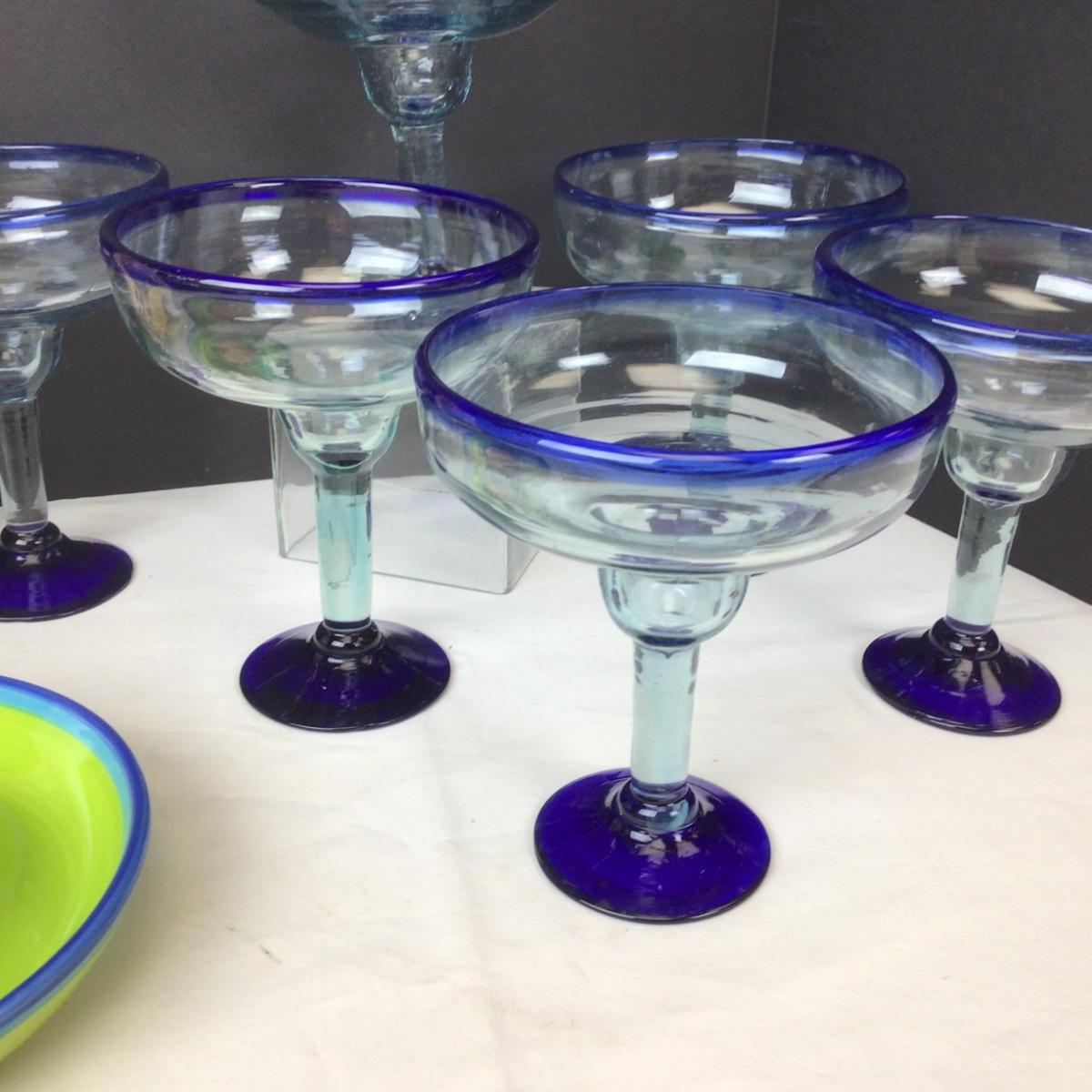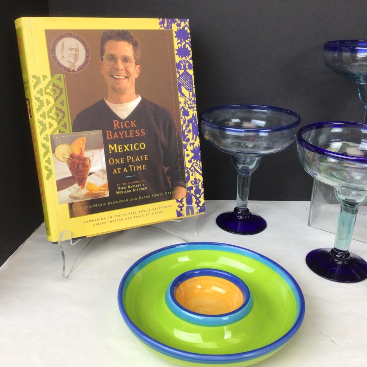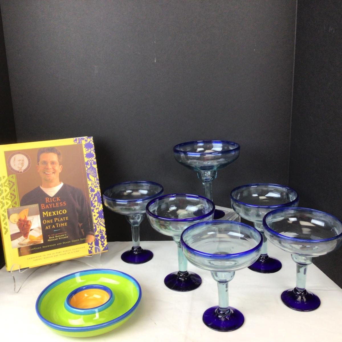 Lot contains 6 Pier One margarita glasses, dish for salting the rims and a cookbook with Mexico One Plate at a Time.