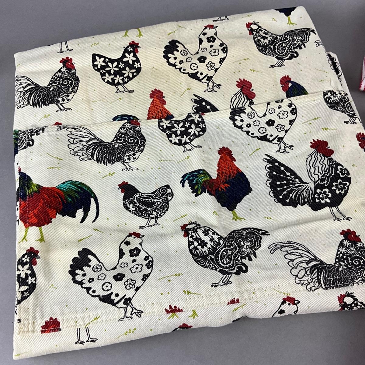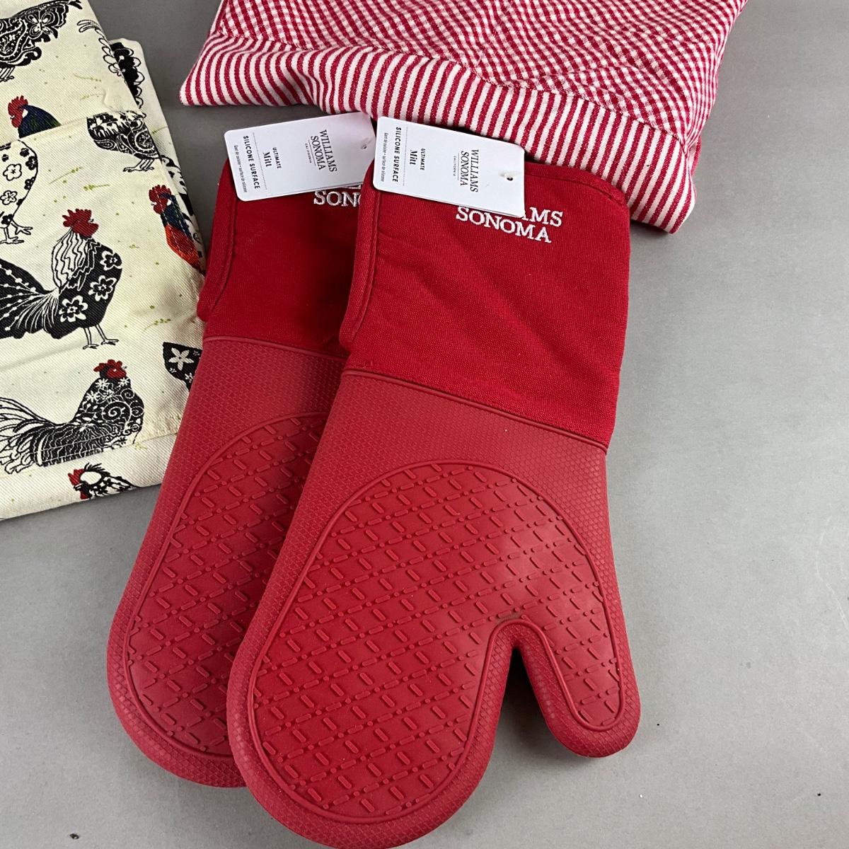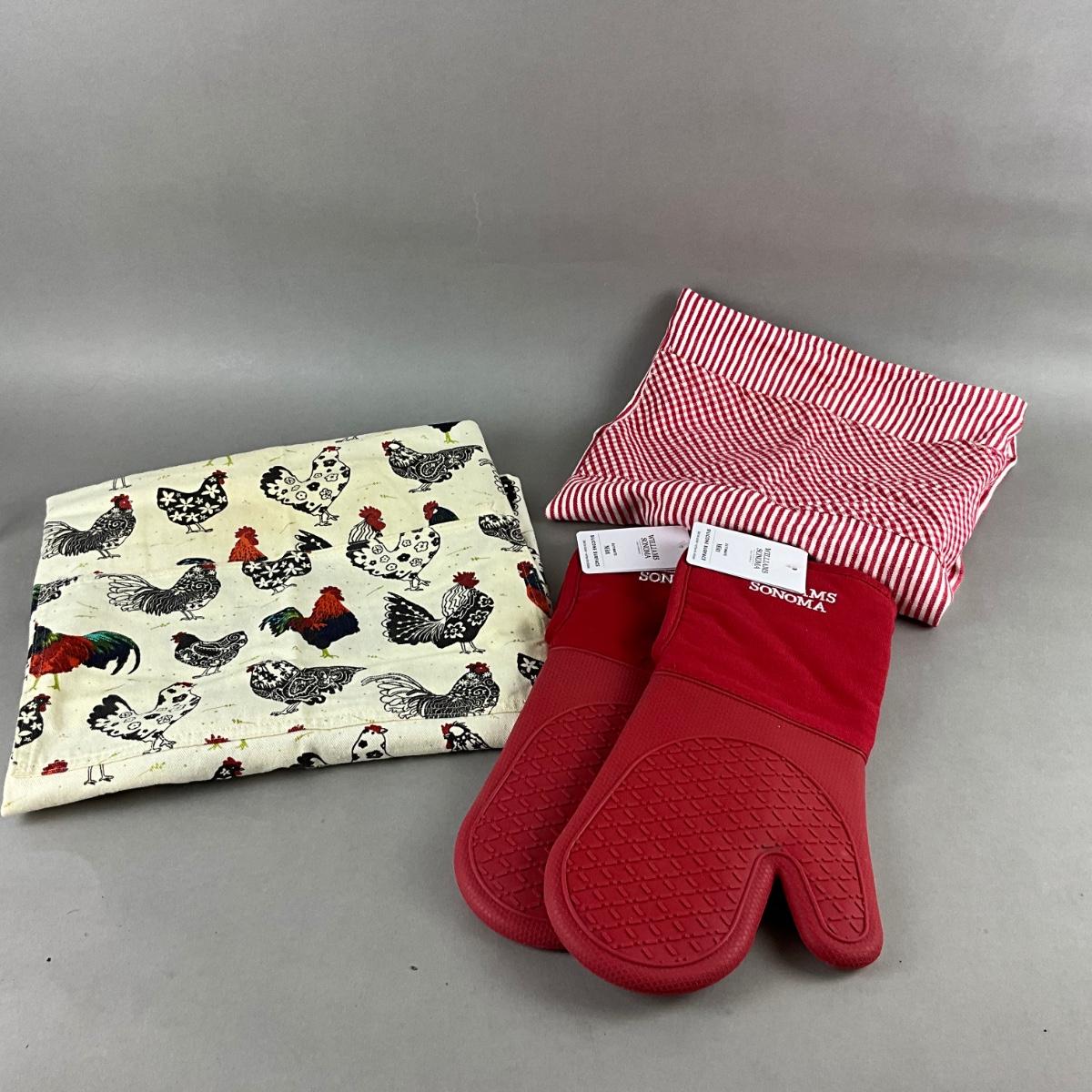 Rooster apron is by ulster weavers, with new william sonoma oven mitts
