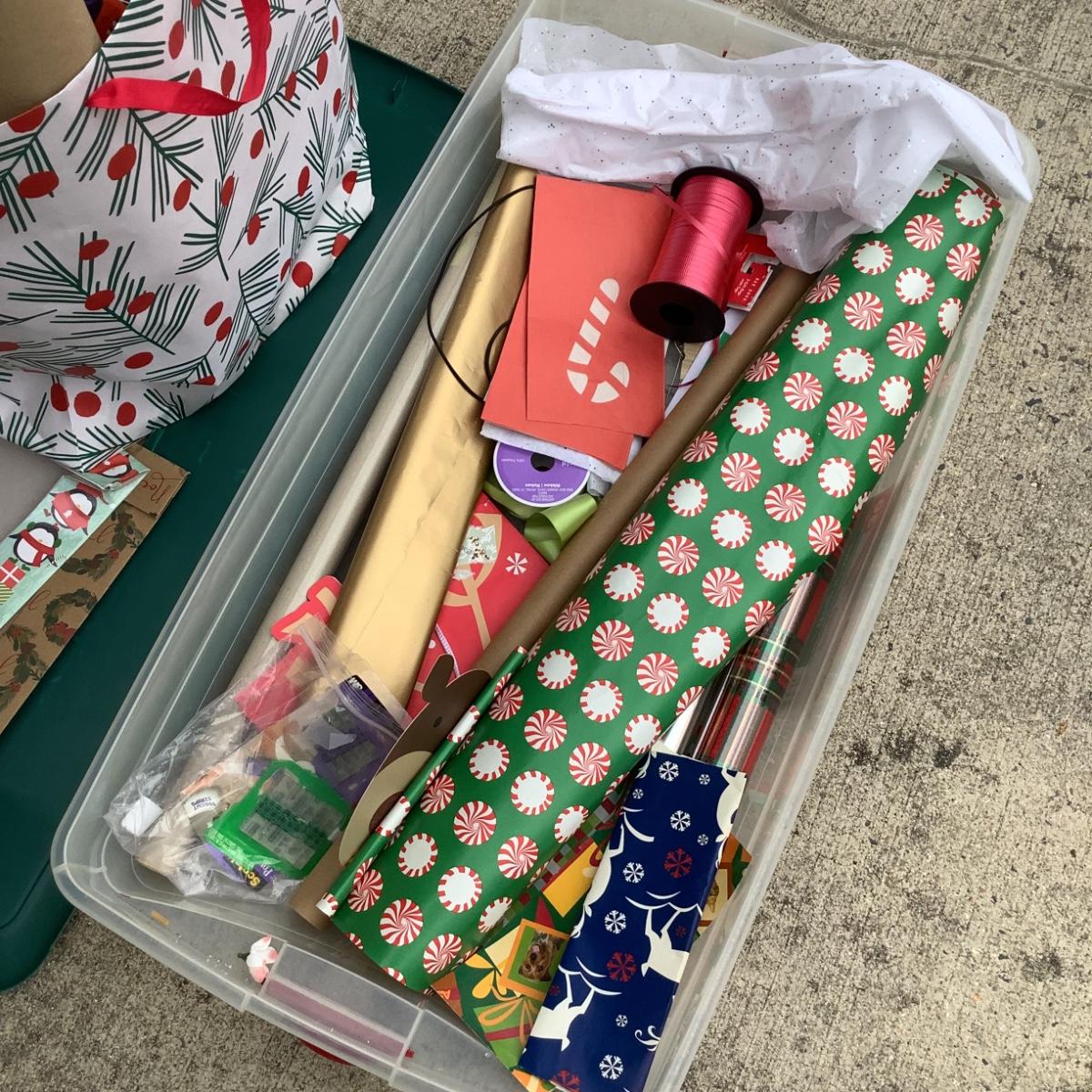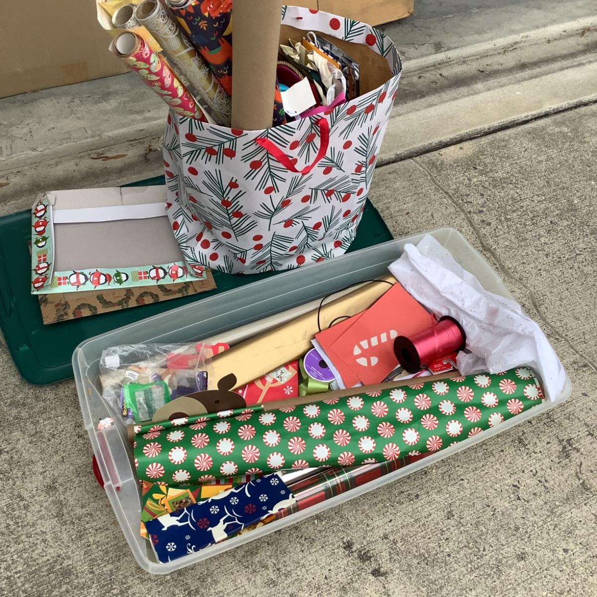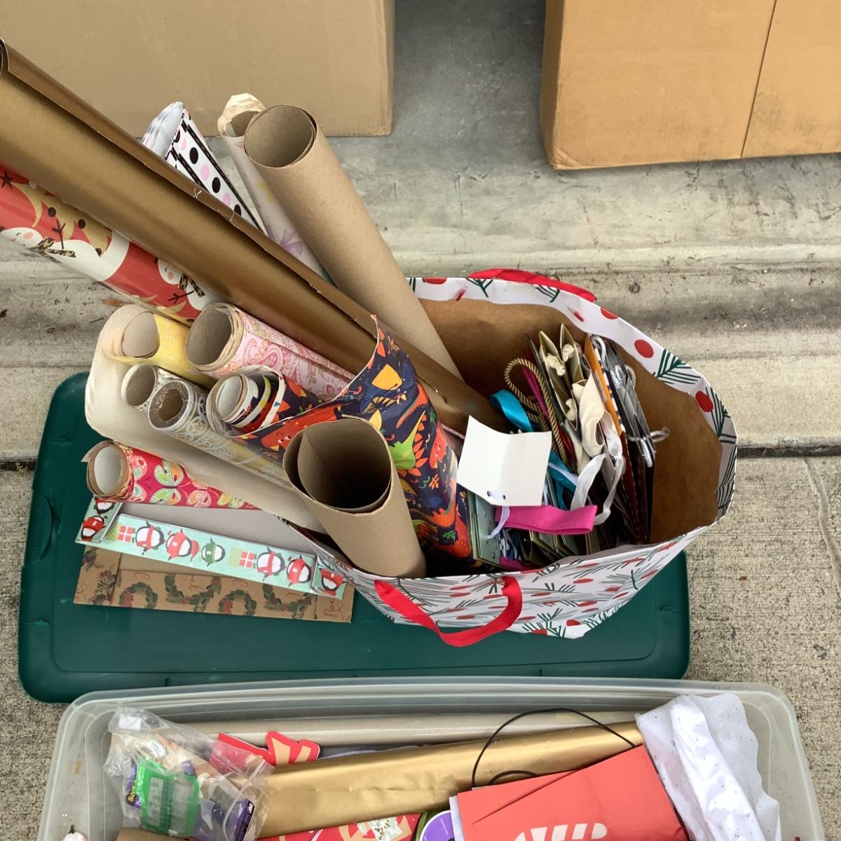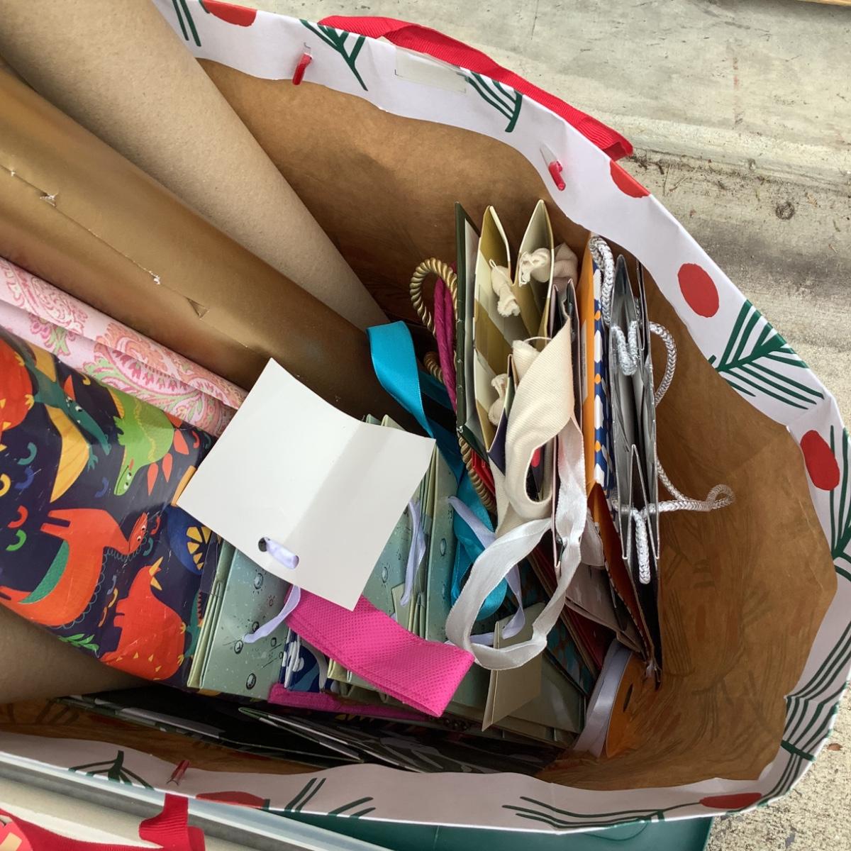 assortment of wine gift bags, wrapping paper, tissue paper and a few clothes gift boxes