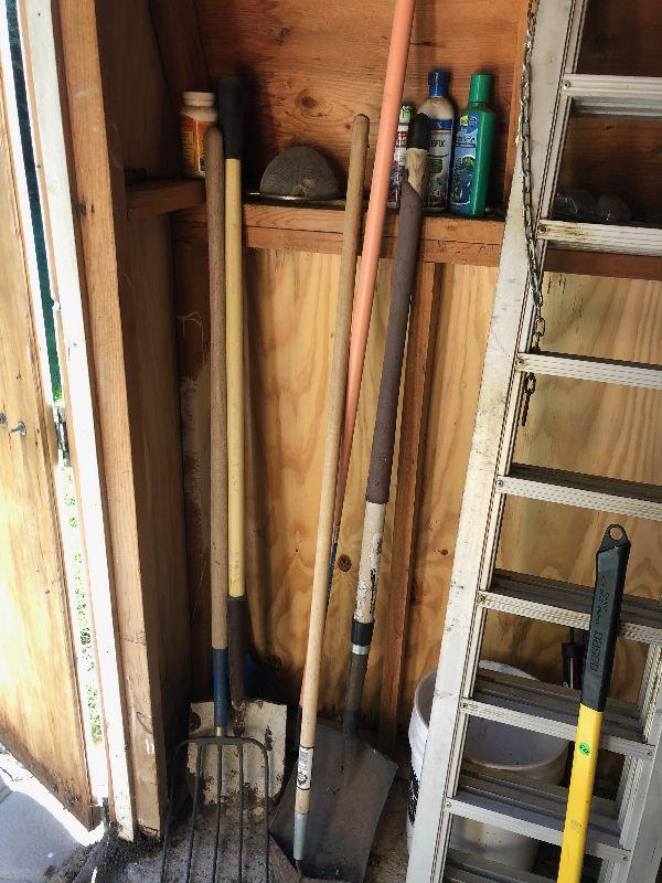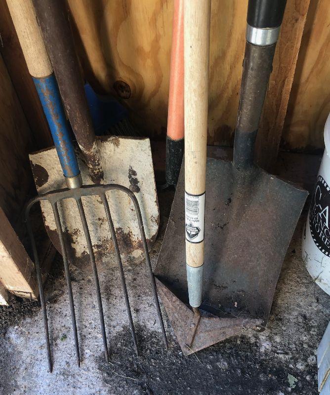 #523 5 Tools Pitch fork, shovels round & Square  - rack and hoe