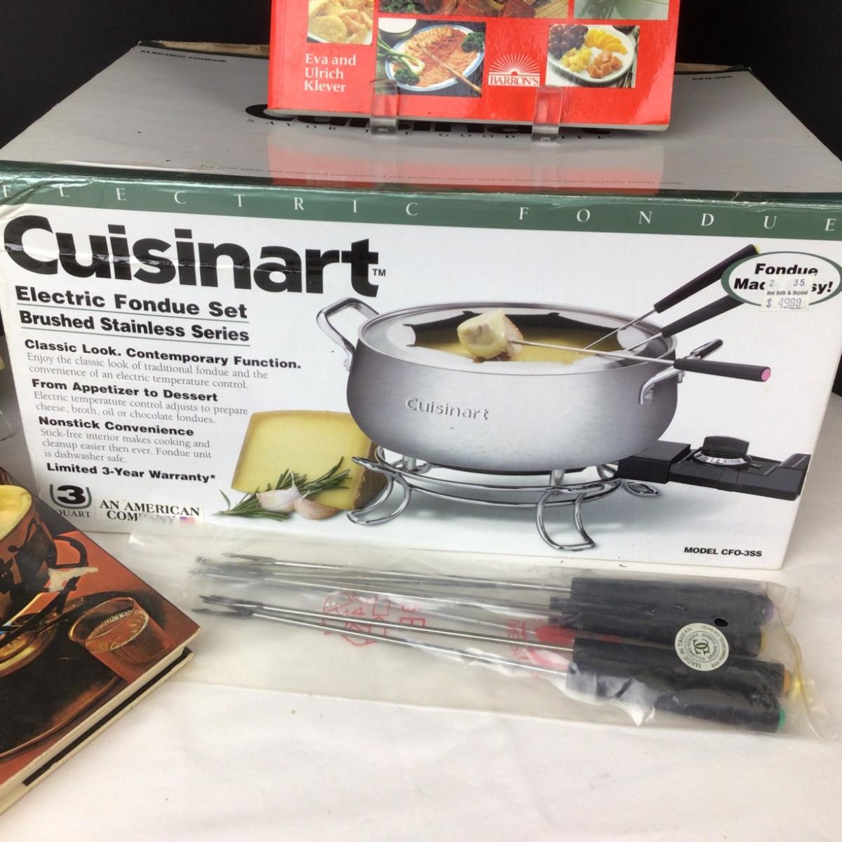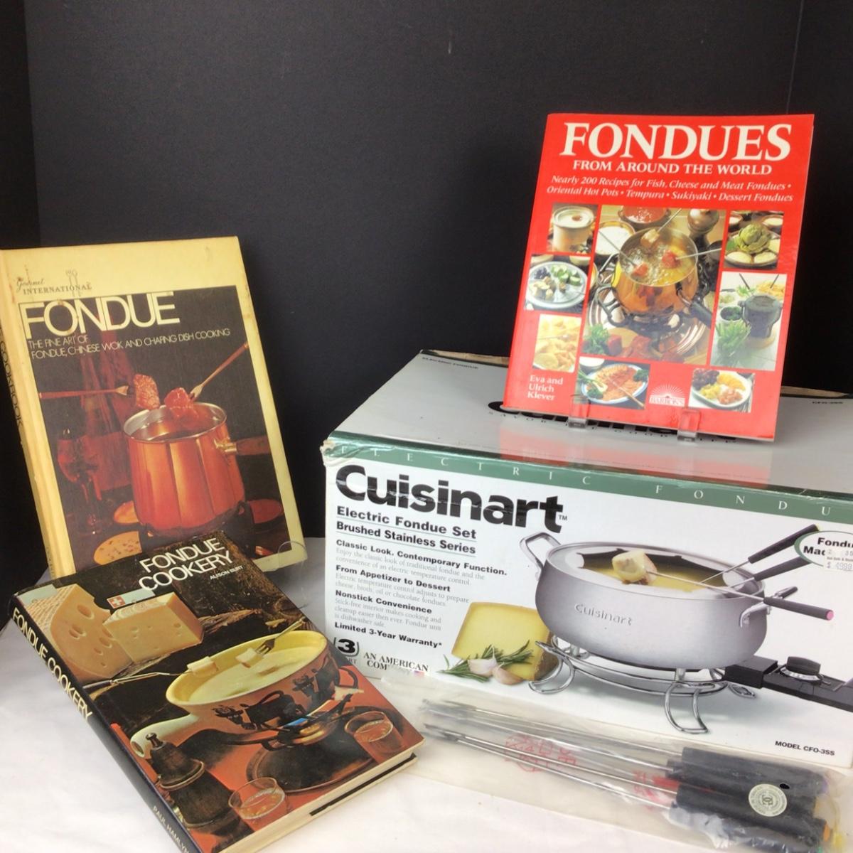 Cuisinart set like new in box, new fondue forks from Williams Sonoma, 3 vintage fondue cookbooks.