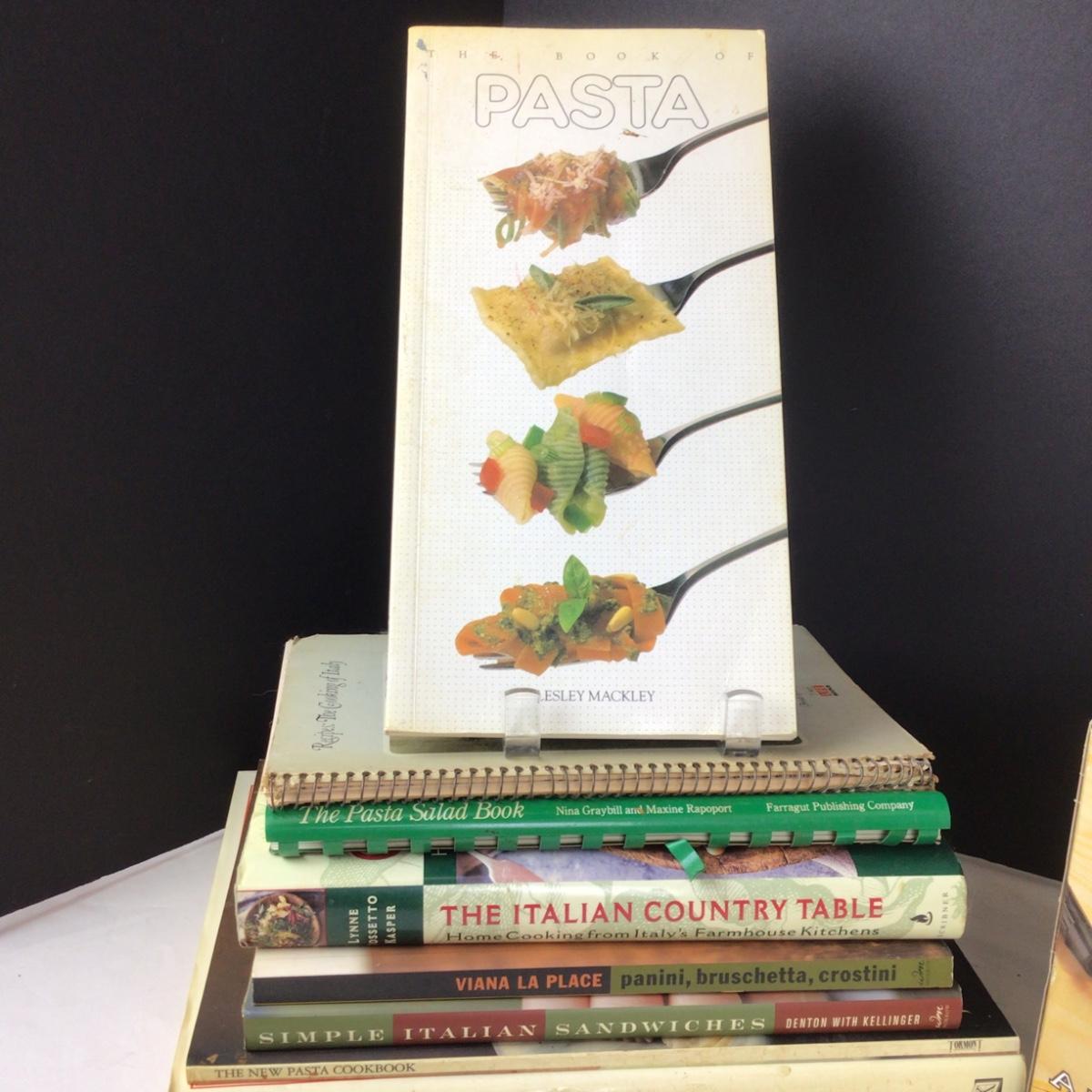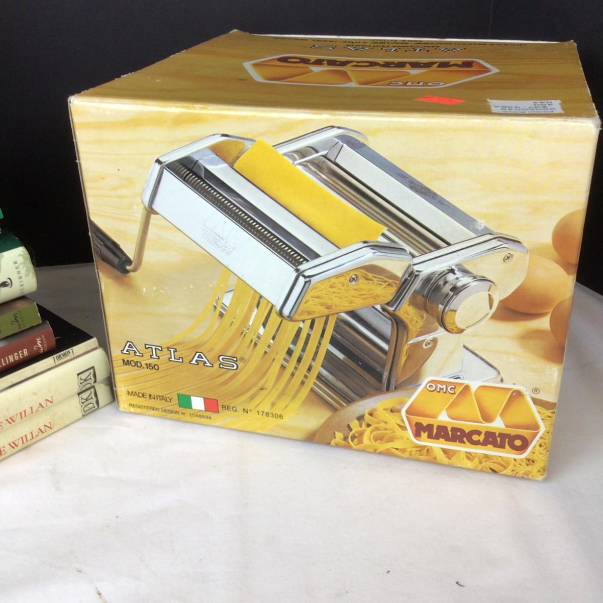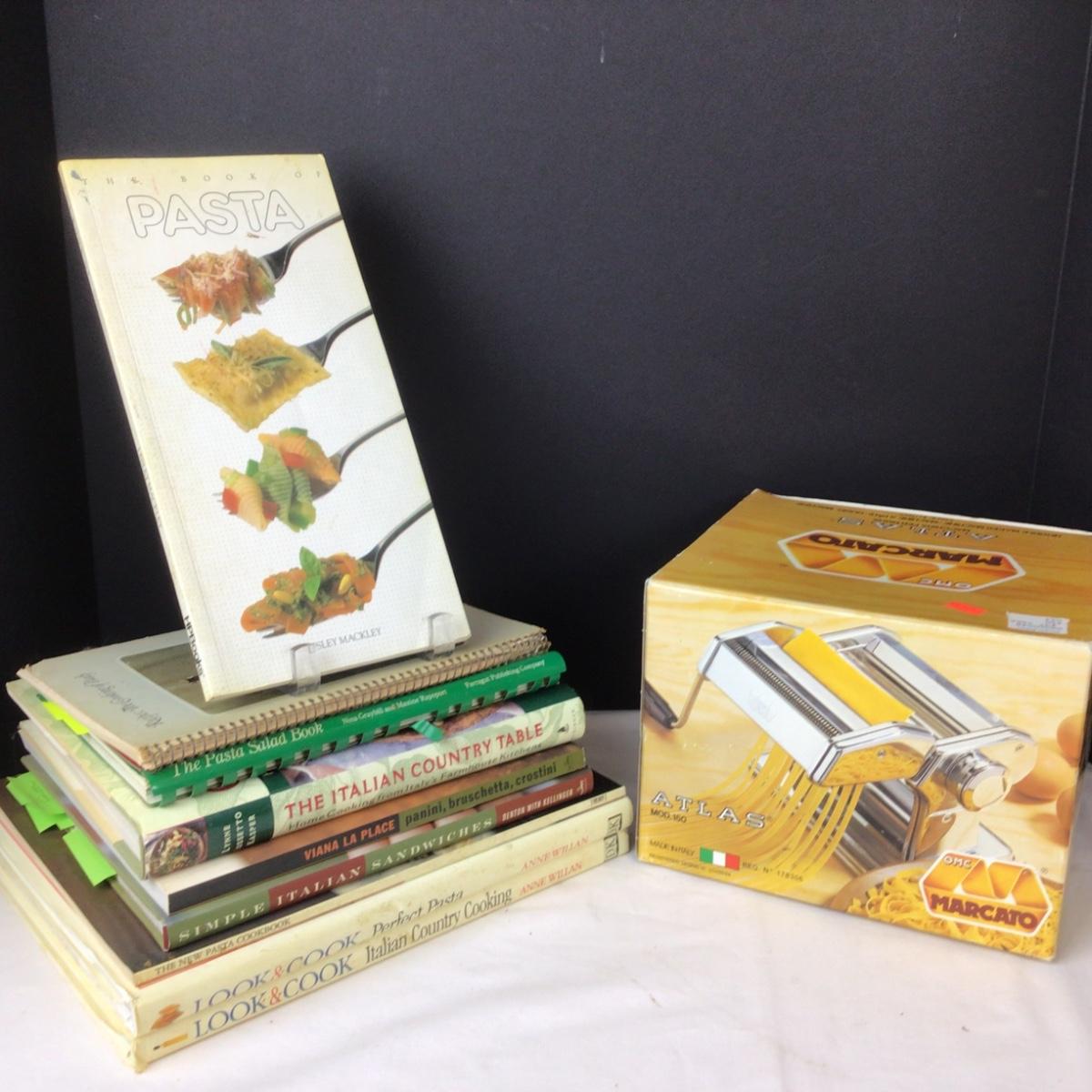 Atlas pasta maker in like new condition, assorted pasta an Italian cookbooks.