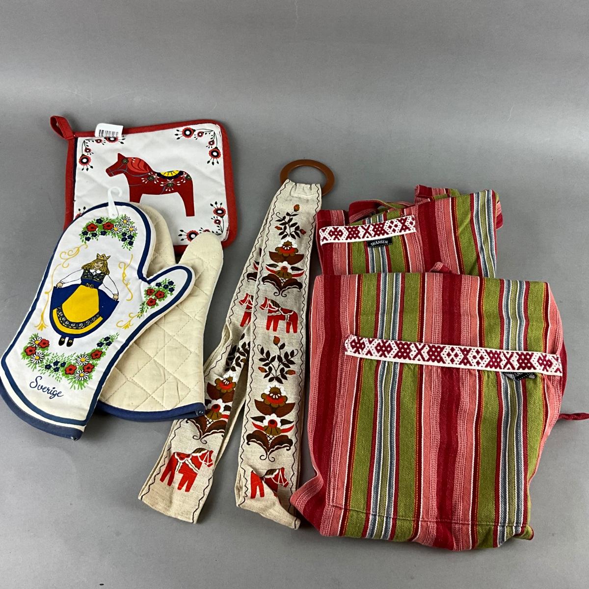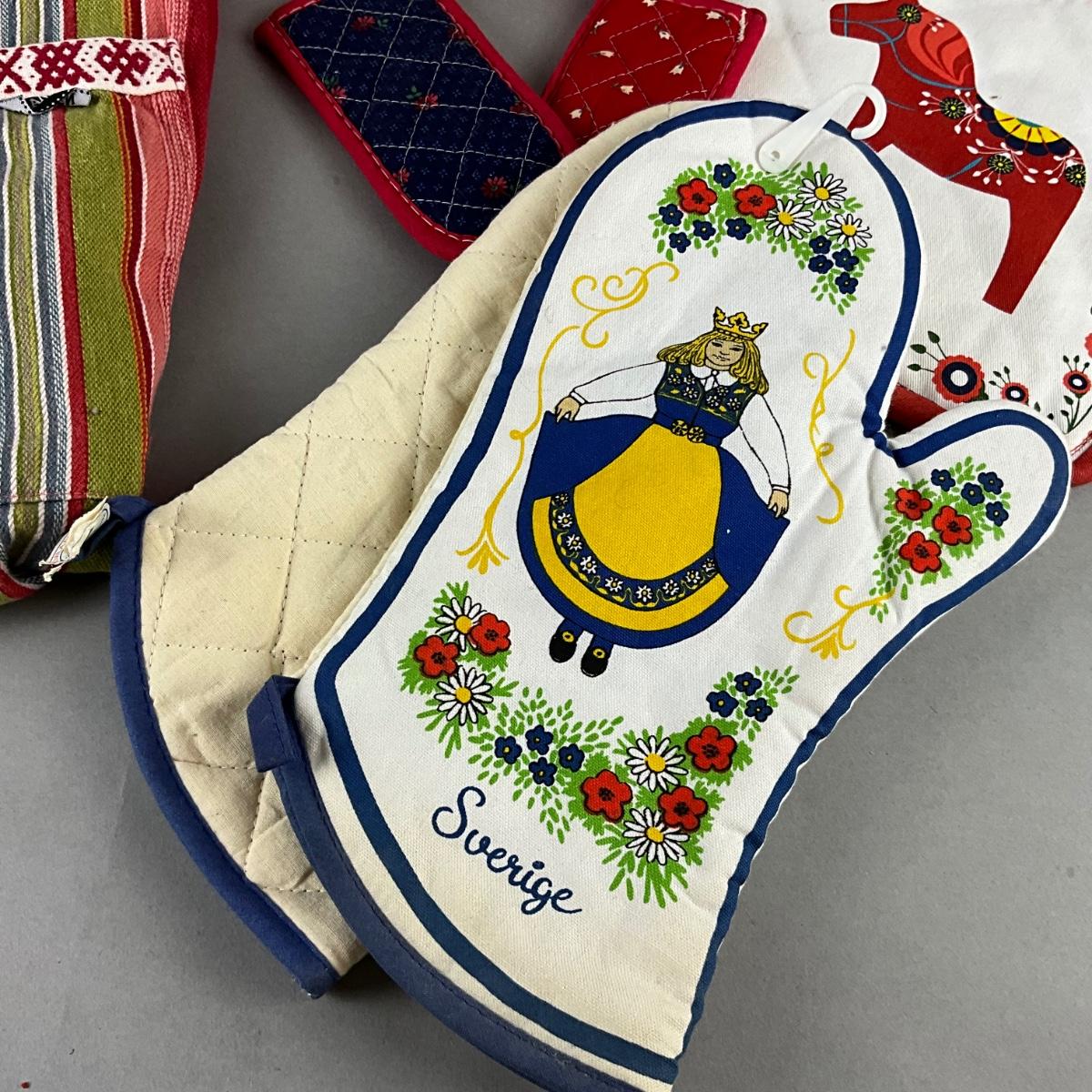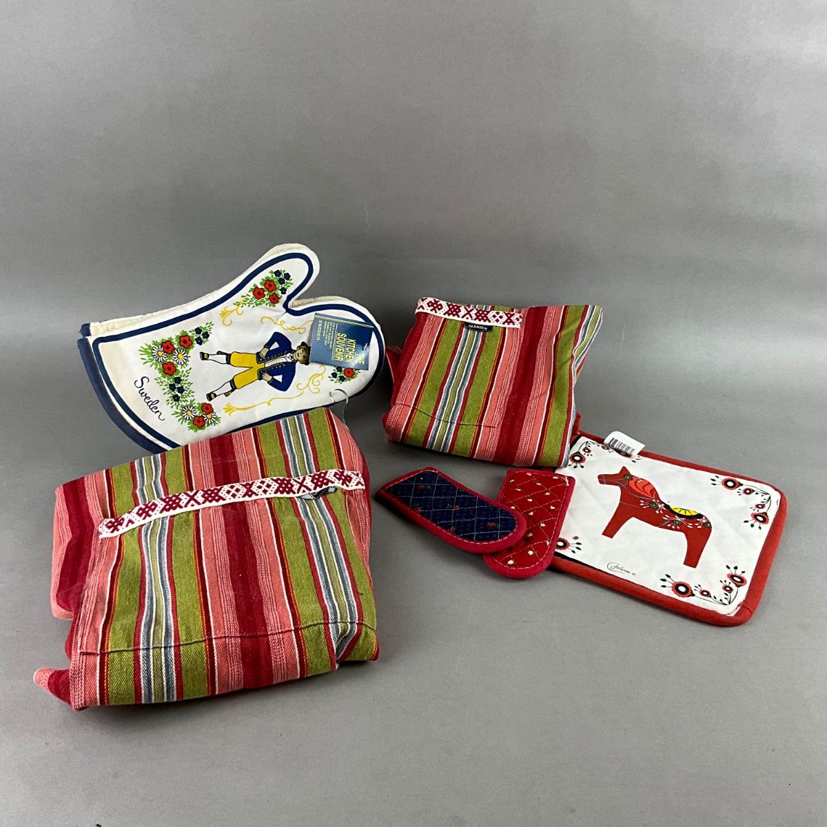 Oven mitts are new with pot holder, handle covers , apron and tea towel