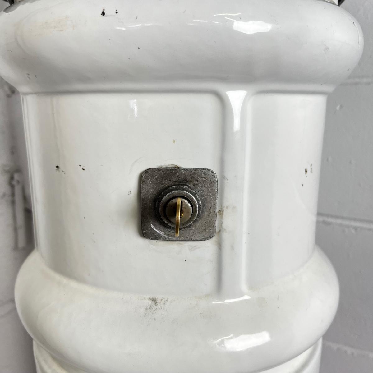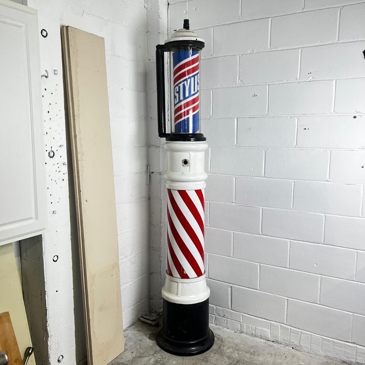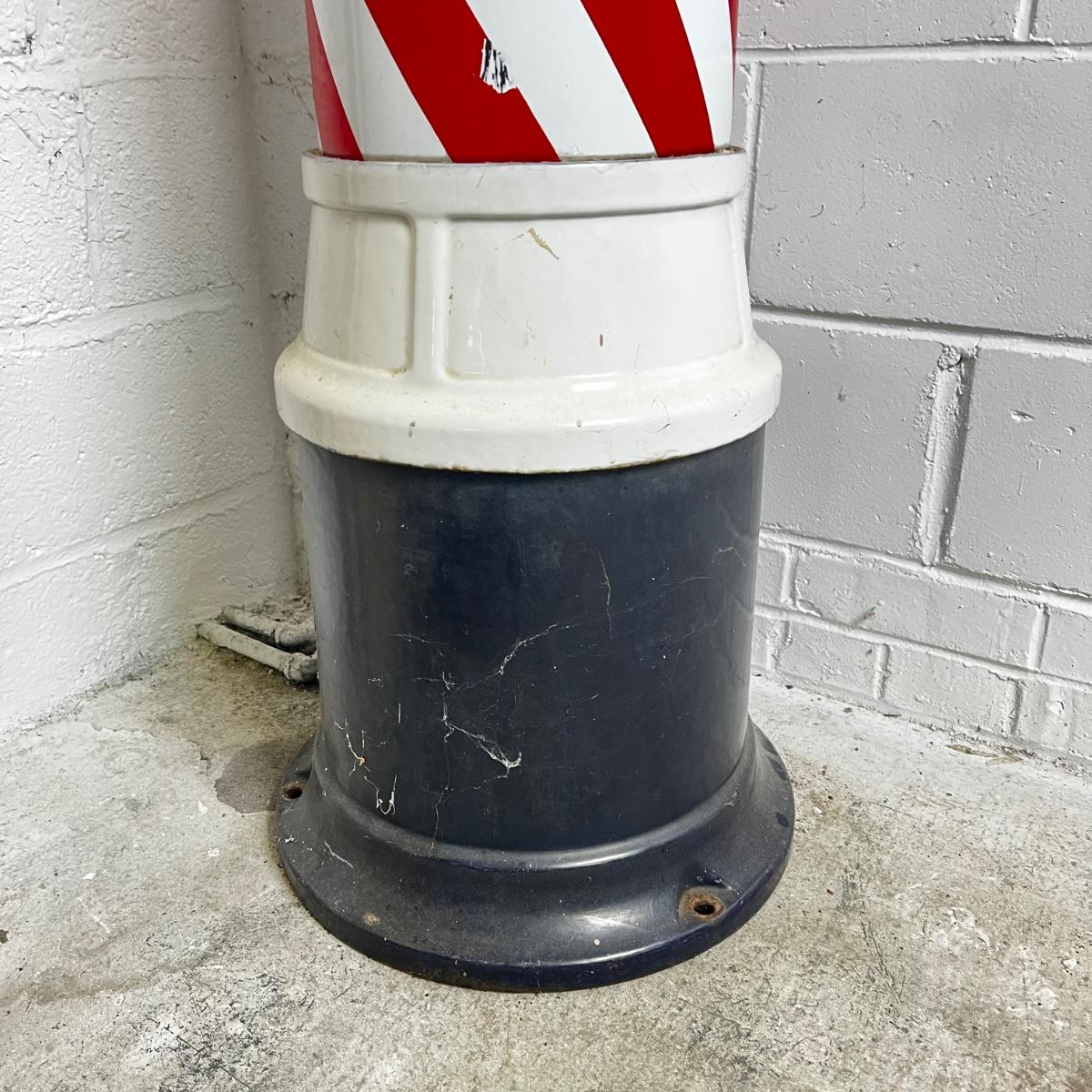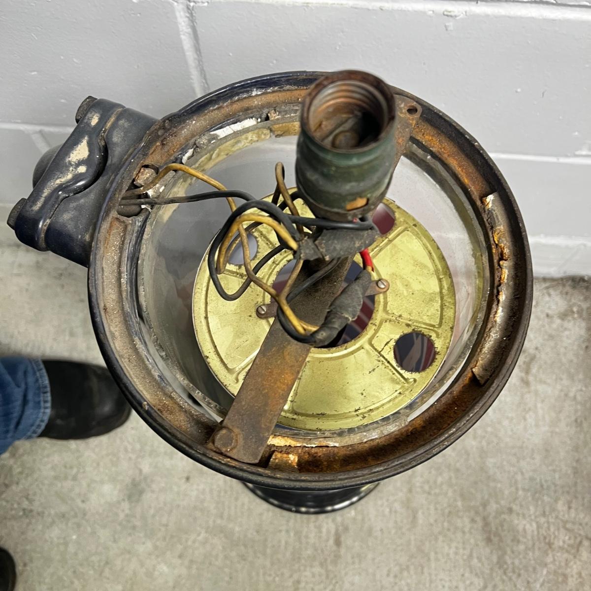 enameled iron base with glass column (cracked) key that turns the cylinder, motor is not working. needs a globe replacement base diameter measuring 4”, glass cylinder is cracked top to bottom. Needs restoration. Pole is 7’ft high, 16” diameter base