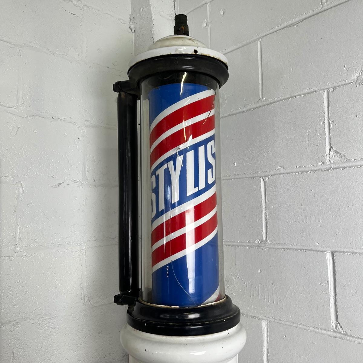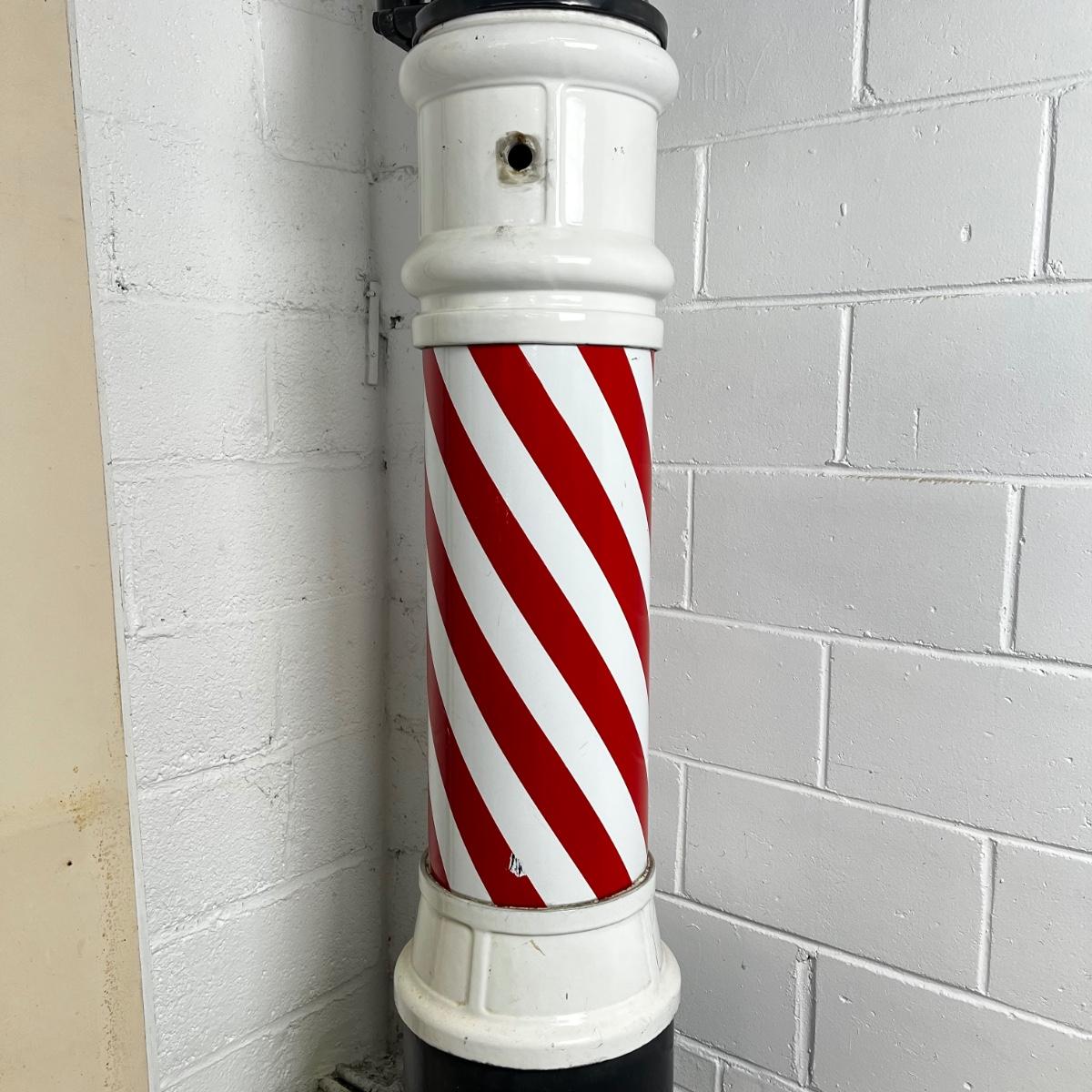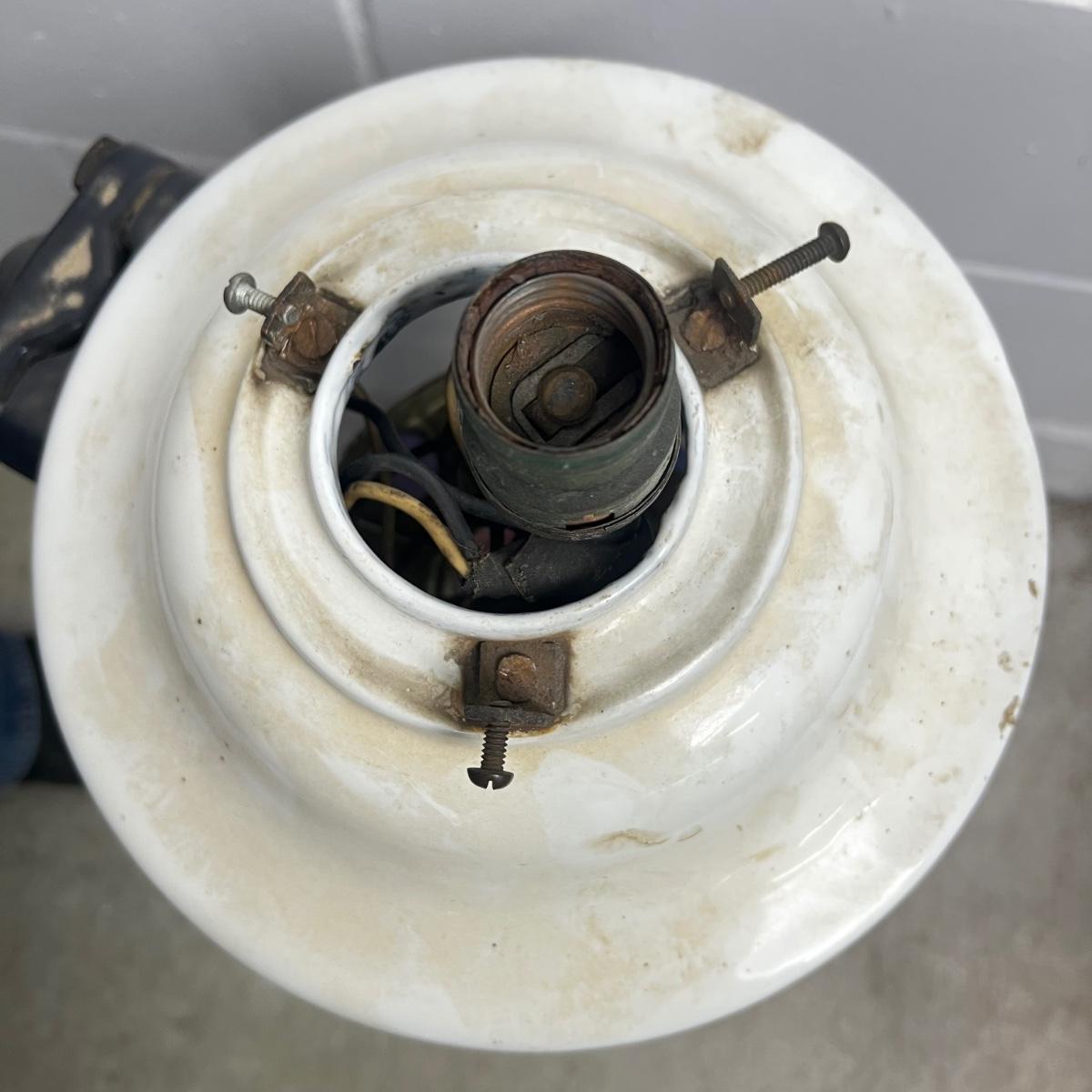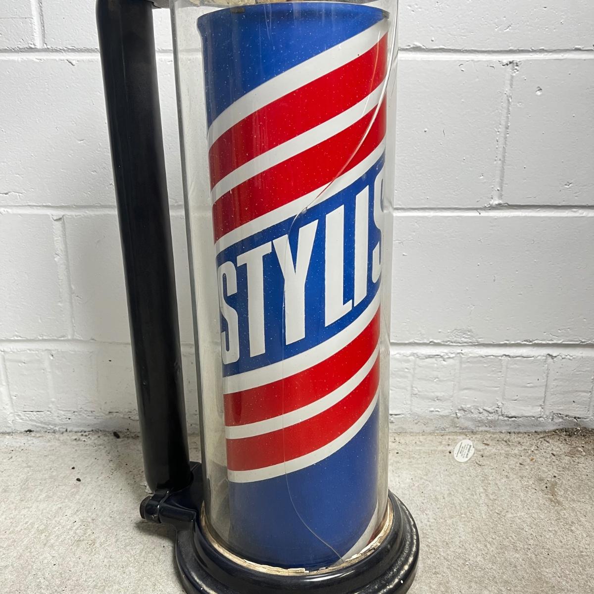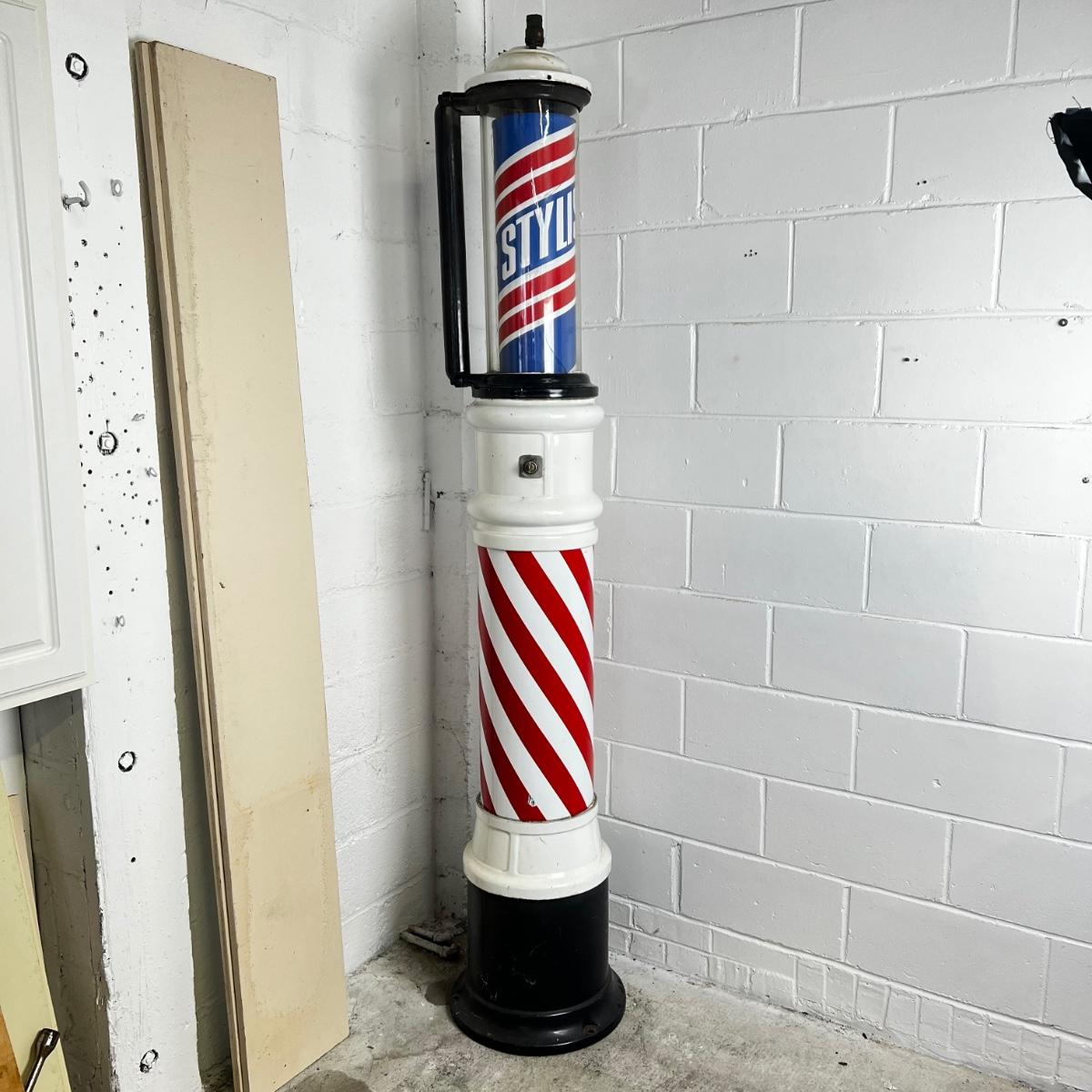enameled iron base with glass column (cracked) key that turns the cylinder, motor is not working. needs a globe replacement base diameter measuring 4”, glass cylinder is cracked top to bottom. Needs restoration. Pole is 7’ft high, 16” diameter base