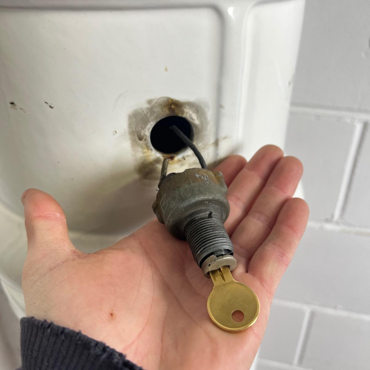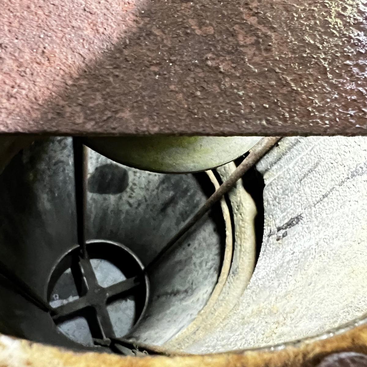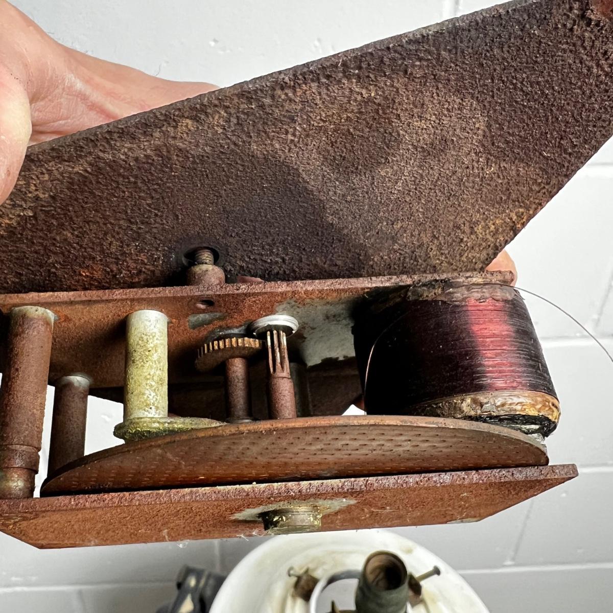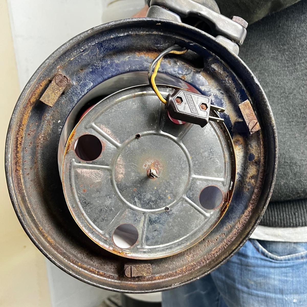 enameled iron base with glass column (cracked) key that turns the cylinder, motor is not working. needs a globe replacement base diameter measuring 4”, glass cylinder is cracked top to bottom. Needs restoration. Pole is 7’ft high, 16” diameter base
