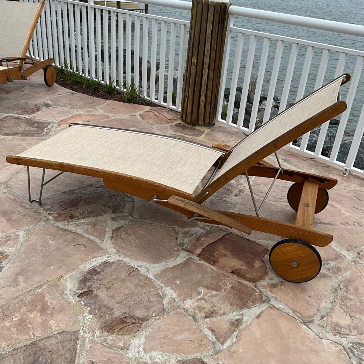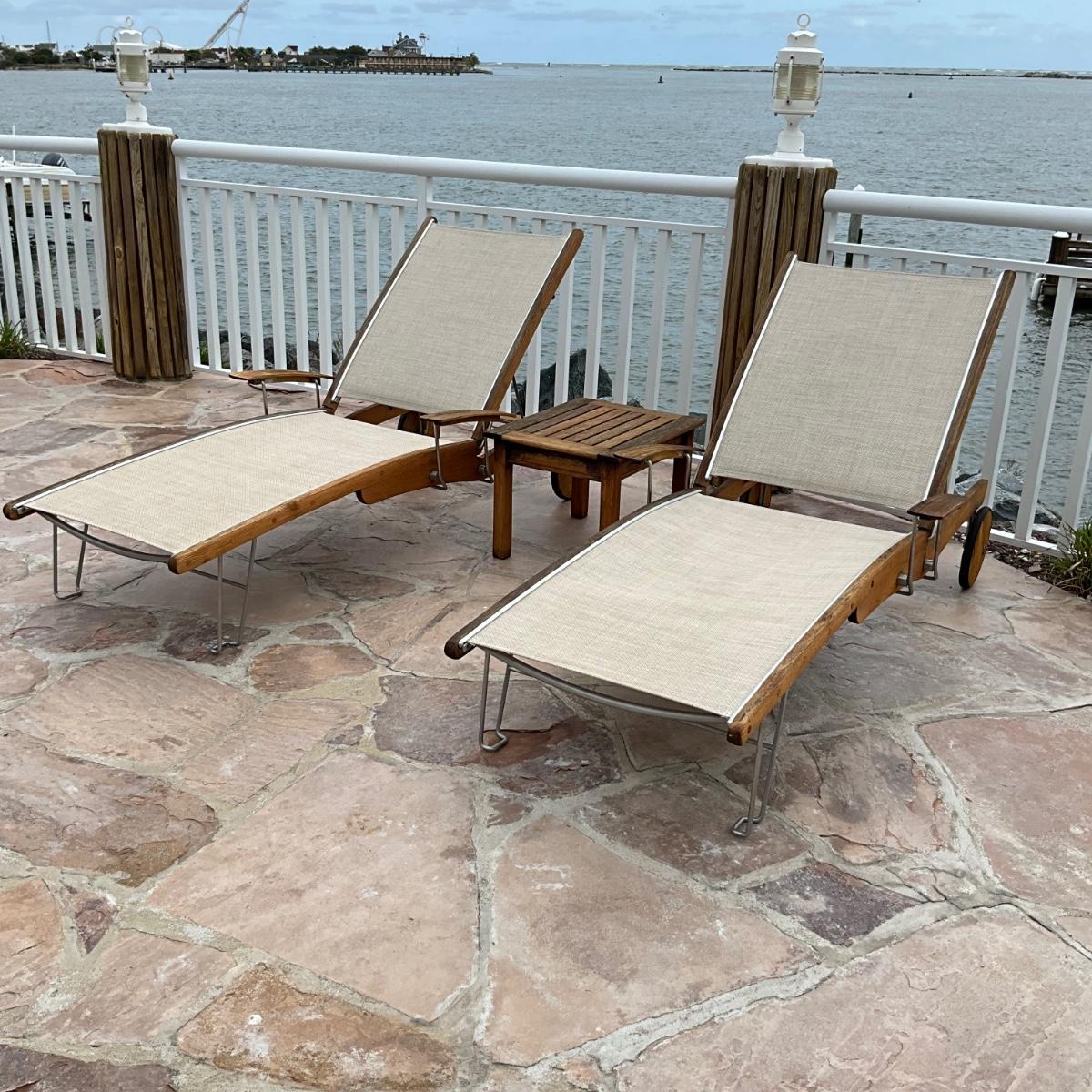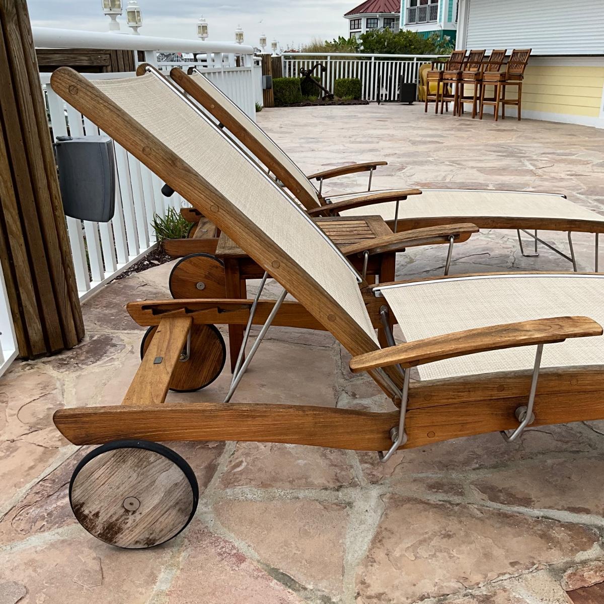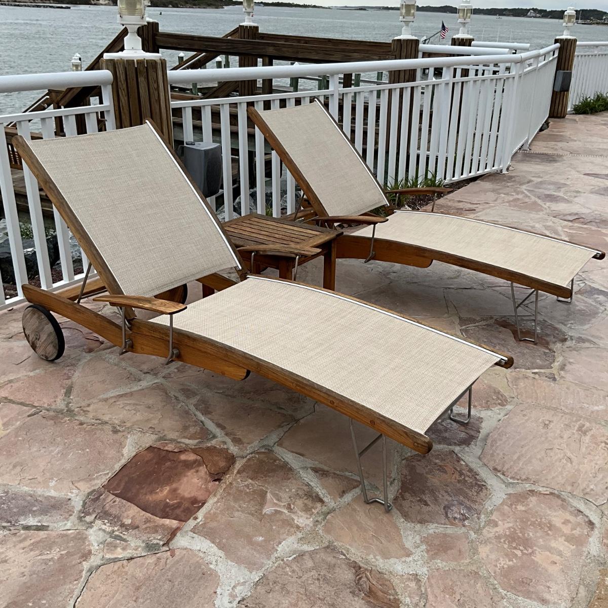 Chairs are a mesh with teak sides and metal legs with collapsible arms