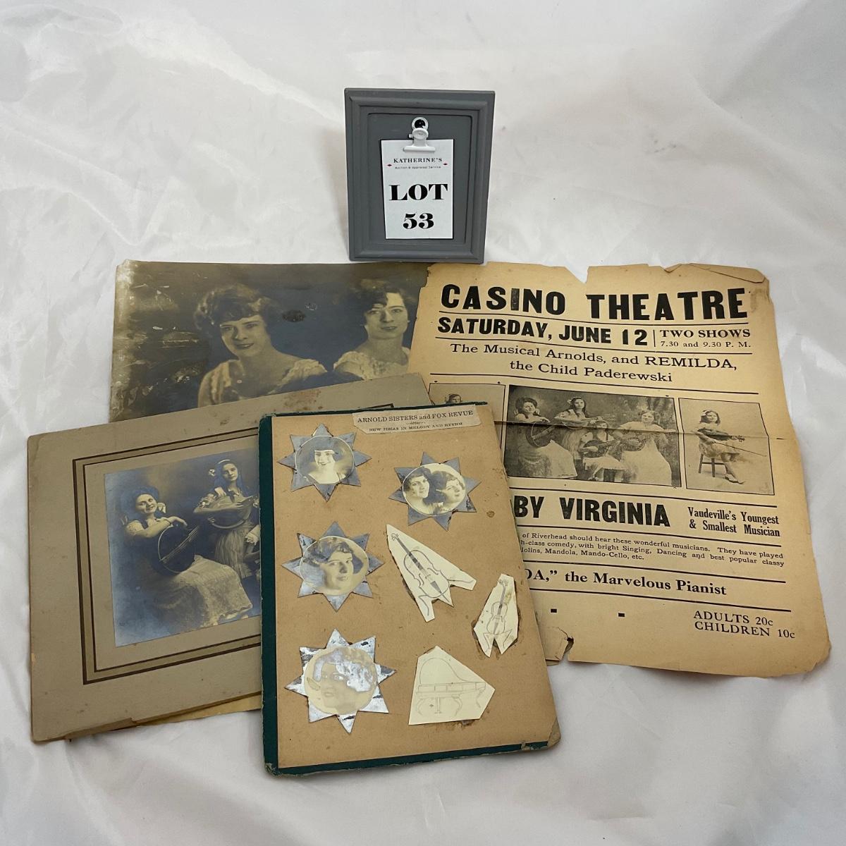 Early 1900’s Arnold Sisters photos and poster lot. In fought shape, there is damage. Please see photos for details and condition. ::: Shipping is available on this lot. If you require shipping you must let us know at the close of the auction. We will coordinate with you after the item has been won. Shipping fees will include insurance up to or exceeding the value of all items being mailed. If you have any questions regarding this lot please contact the auctioneer either via this website, by direct email or by phone. PICK UP TIMES and other important information can be found in the TERMS and DESCRIPTION of the auction. Please take a look for pertinent information. Thanks!