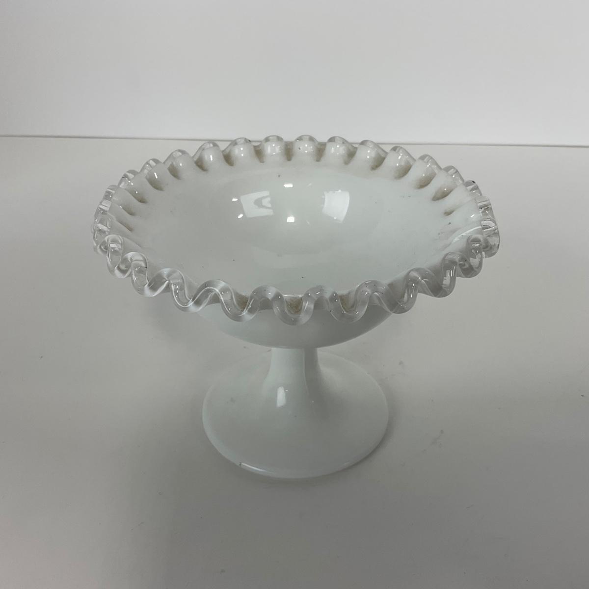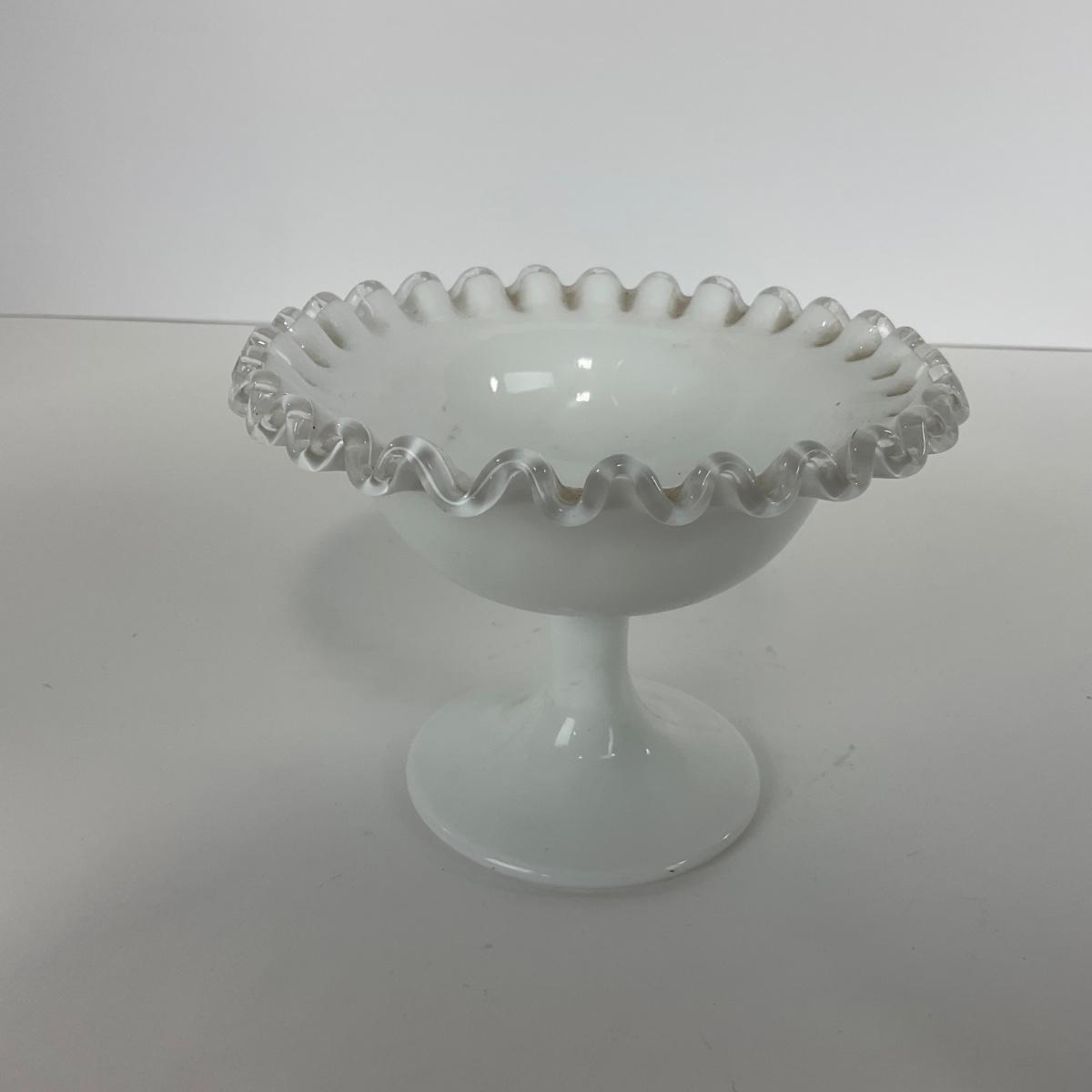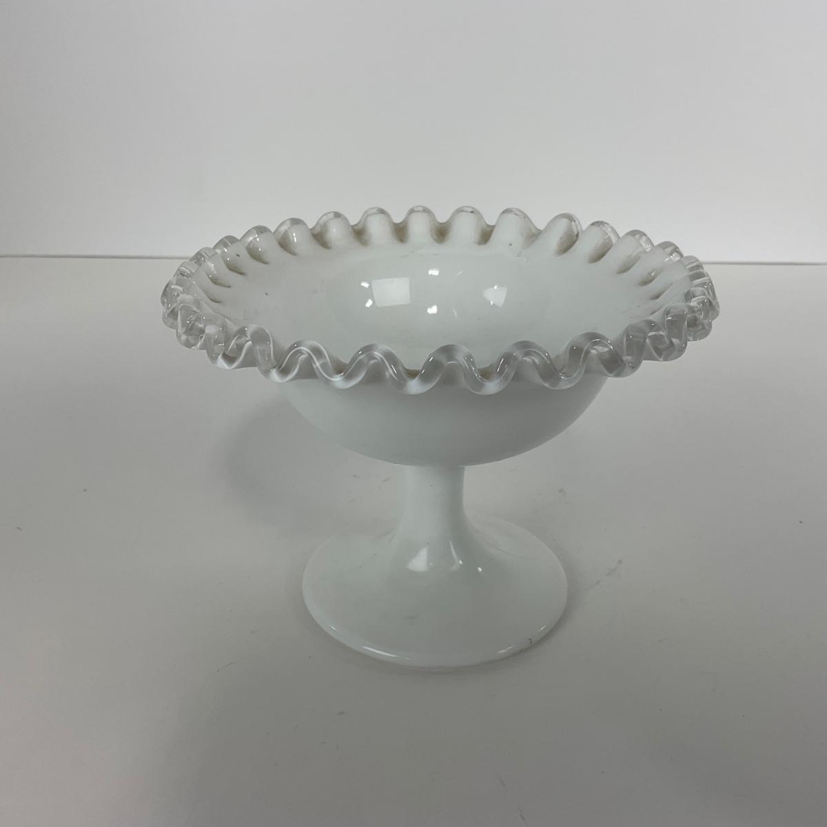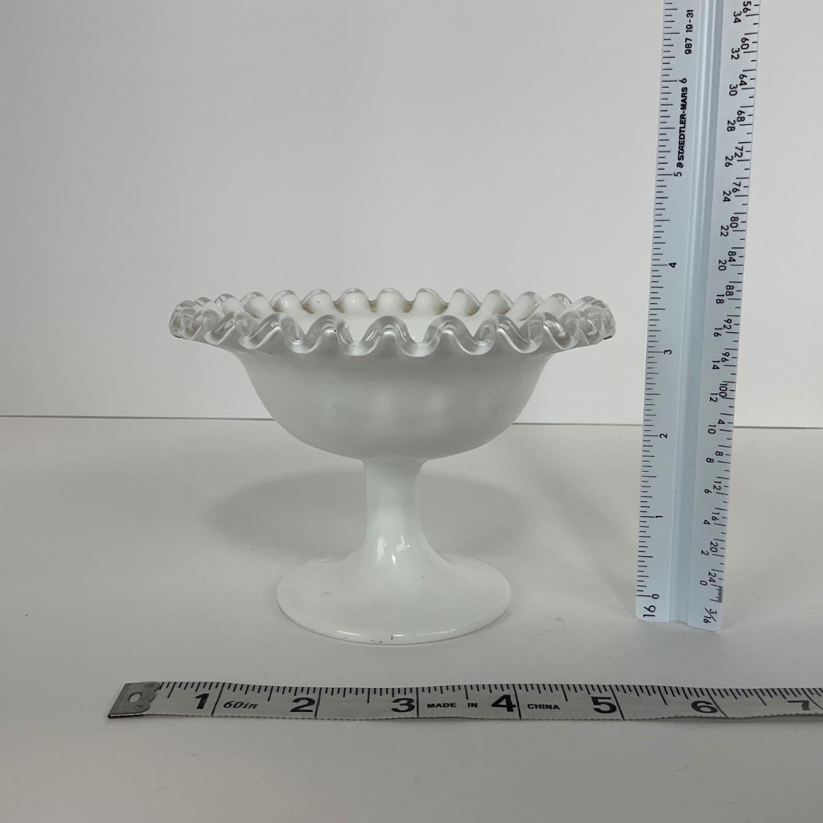 White wave edge compote small. Fenton SilverCrest Compote. Believed to be unmarked Fenton - pre-1970. Please see photos for details and condition. ::: Shipping is available on this lot. If you require shipping you must let us know at the close of the auction. We will coordinate with you after the item has been won. Shipping fees will include insurance up to or exceeding the value of all items being mailed. If you have any questions regarding this lot please contact the auctioneer either via this website, by direct email or by phone. PICK UP TIMES and other important information can be found in the TERMS and DESCRIPTION of the auction. Please take a look for pertinent information. Thanks!