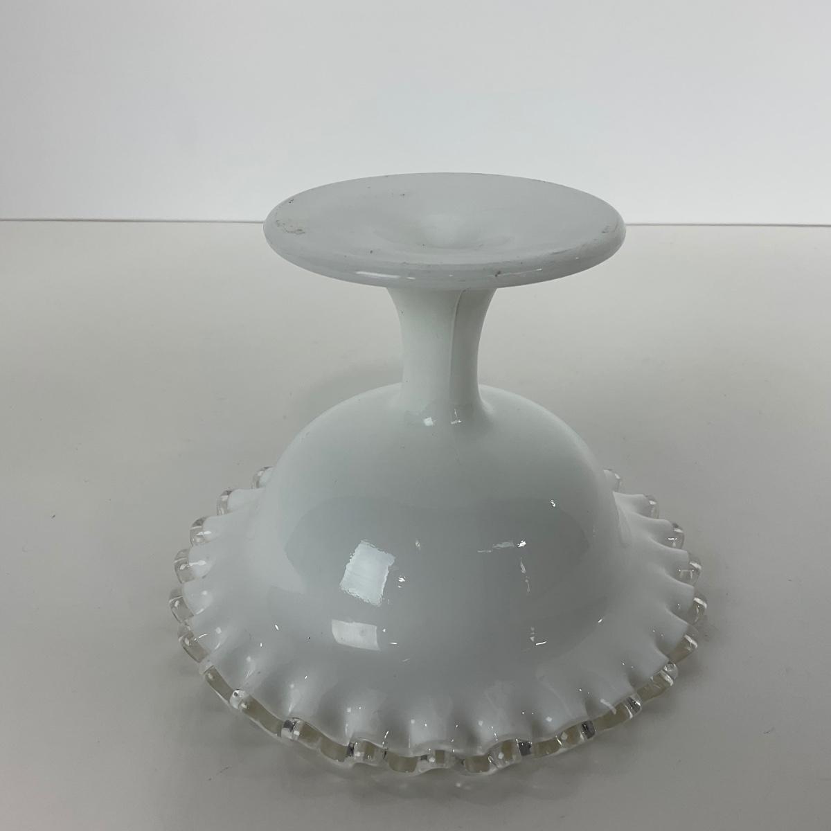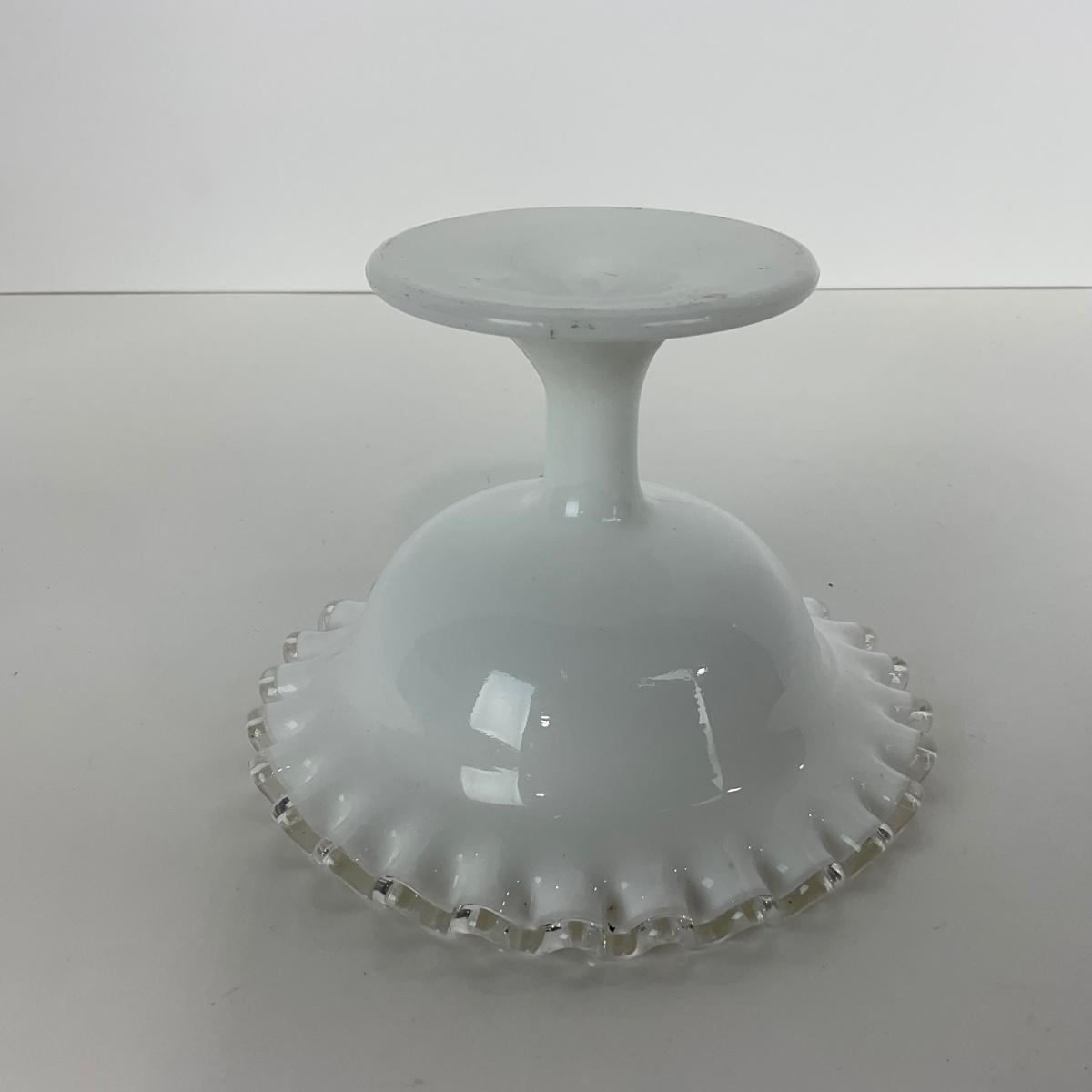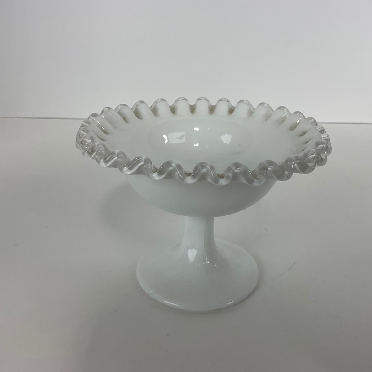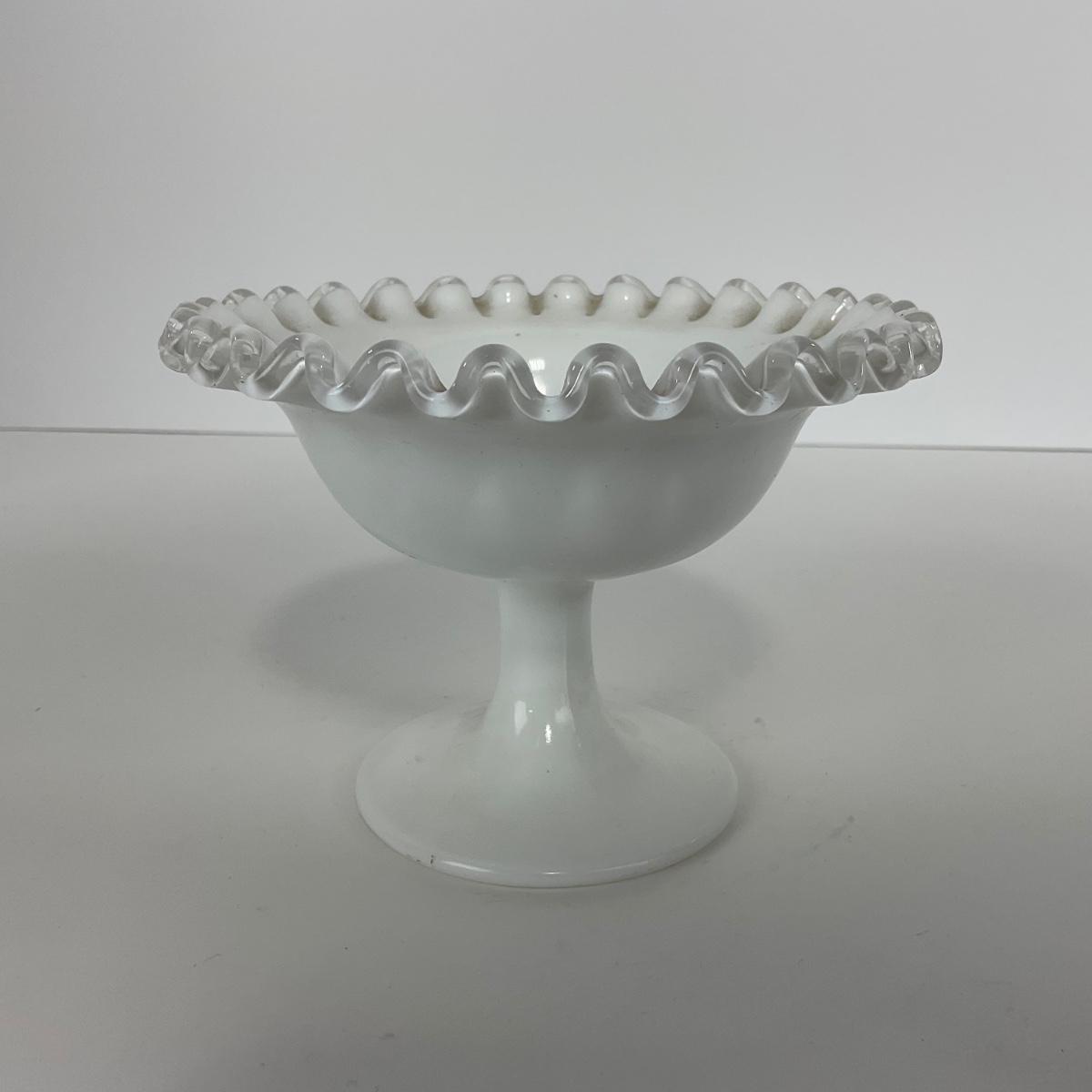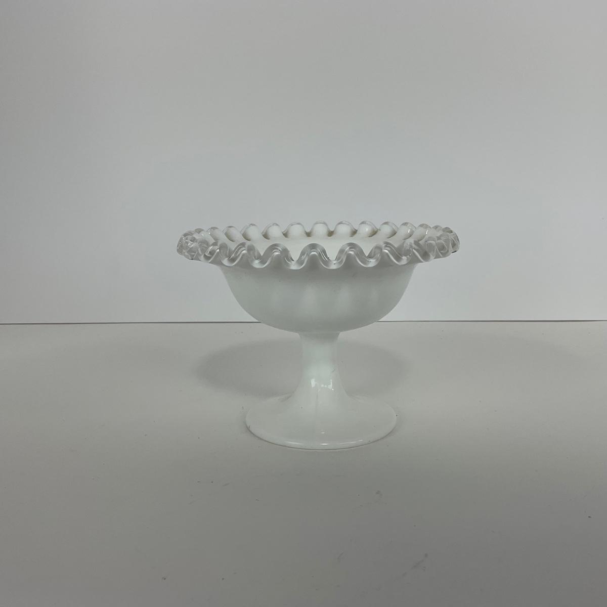 White wave edge compote small. Fenton SilverCrest Compote. Believed to be unmarked Fenton - pre-1970. Please see photos for details and condition. ::: Shipping is available on this lot. If you require shipping you must let us know at the close of the auction. We will coordinate with you after the item has been won. Shipping fees will include insurance up to or exceeding the value of all items being mailed. If you have any questions regarding this lot please contact the auctioneer either via this website, by direct email or by phone. PICK UP TIMES and other important information can be found in the TERMS and DESCRIPTION of the auction. Please take a look for pertinent information. Thanks!