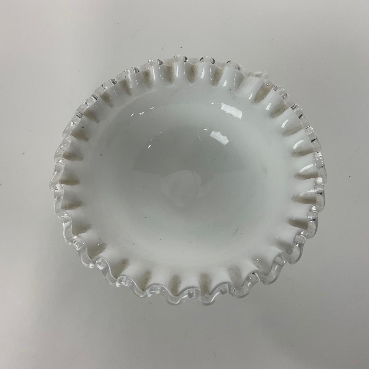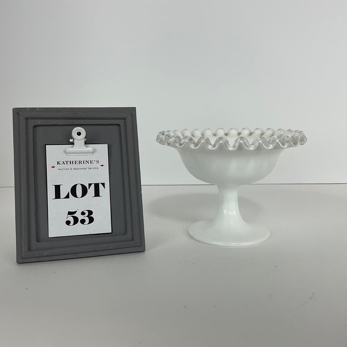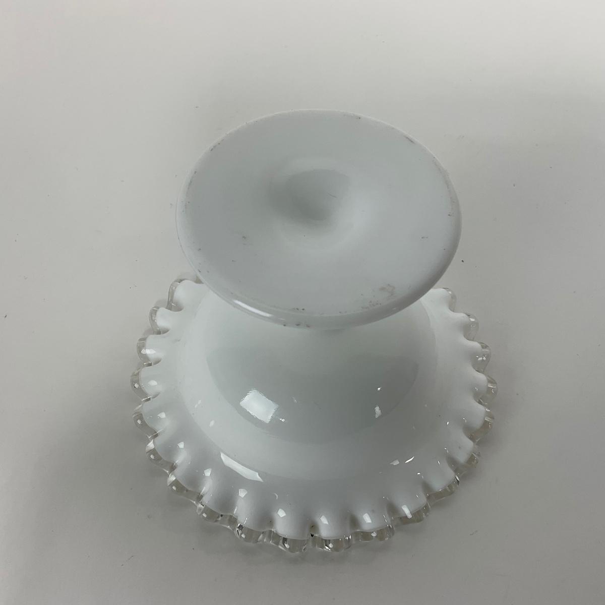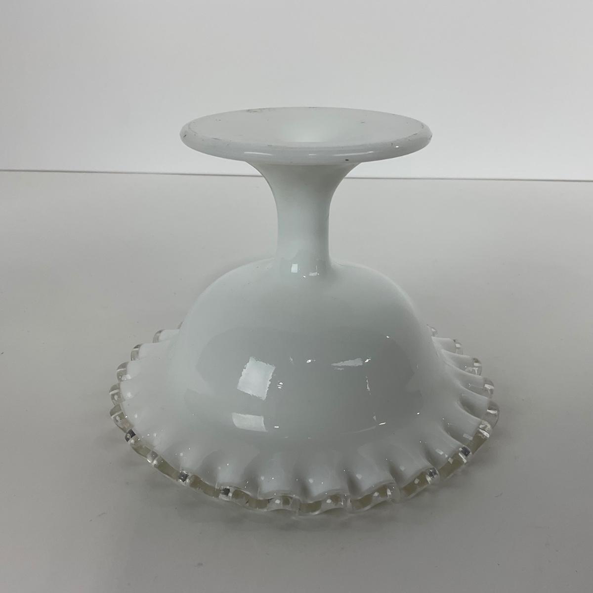 White wave edge compote small. Fenton SilverCrest Compote. Believed to be unmarked Fenton - pre-1970. Please see photos for details and condition. ::: Shipping is available on this lot. If you require shipping you must let us know at the close of the auction. We will coordinate with you after the item has been won. Shipping fees will include insurance up to or exceeding the value of all items being mailed. If you have any questions regarding this lot please contact the auctioneer either via this website, by direct email or by phone. PICK UP TIMES and other important information can be found in the TERMS and DESCRIPTION of the auction. Please take a look for pertinent information. Thanks!