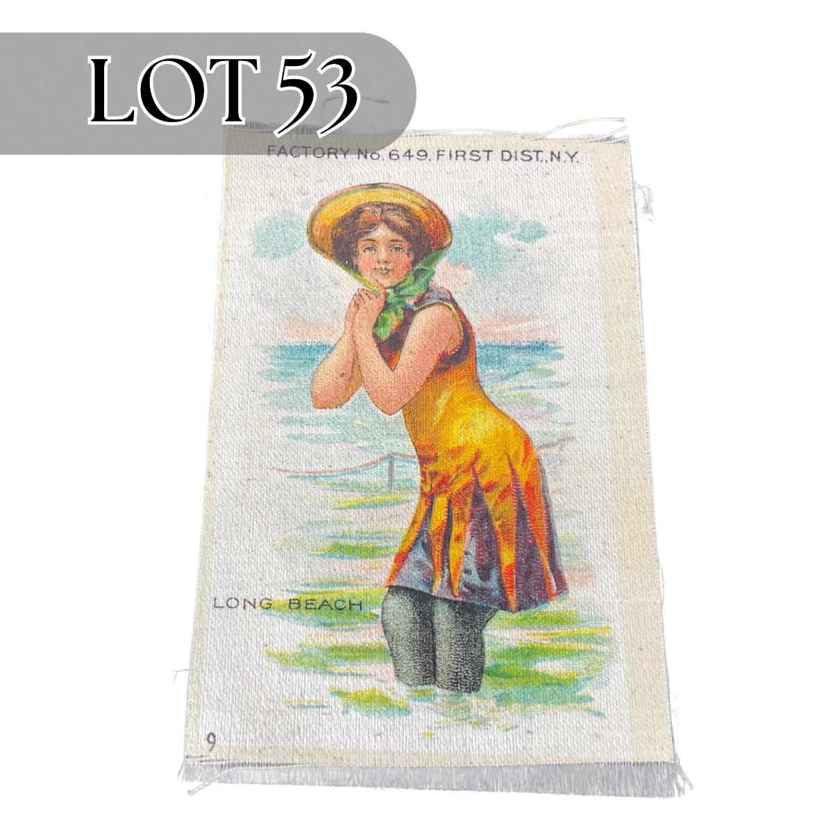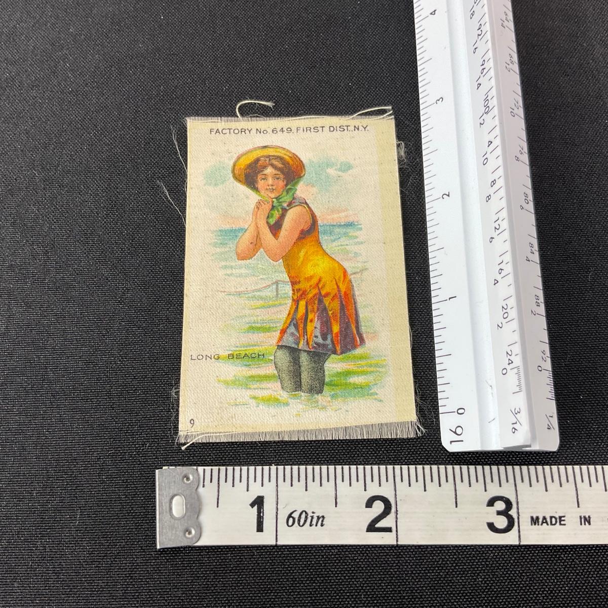 One antique Edwardian bathing beauty tobacco silk. #9 Long Beach Silk. Please see photos for details and condition. Any condition statement is given as a courtesy to a client, is an opinion, and should not be treated as a statement of fact. Reference to condition written, oral or within a condition report shall not be regarded as a full account of condition and may not include all defects, alterations, or restorations. Absence of a condition report does not imply a lot is flawless or lacking imperfections or damage. Katherine’s Auction & Appraisal Service shall have no responsibility for any error or omission. Returns shall not be accepted on the basis of condition. ::: Shipping is available on this lot. If you require shipping you must let us know at the close of the auction. We will coordinate with you after the item has been won. Shipping fees will include insurance up to or exceeding the value of all items being mailed. If you have any questions regarding this lot please contact the auctioneer either via this website, by direct email or by phone. PICK UP TIMES and other important information can be found in the TERMS and DESCRIPTION of the auction. Please take a look for pertinent information. Thanks!