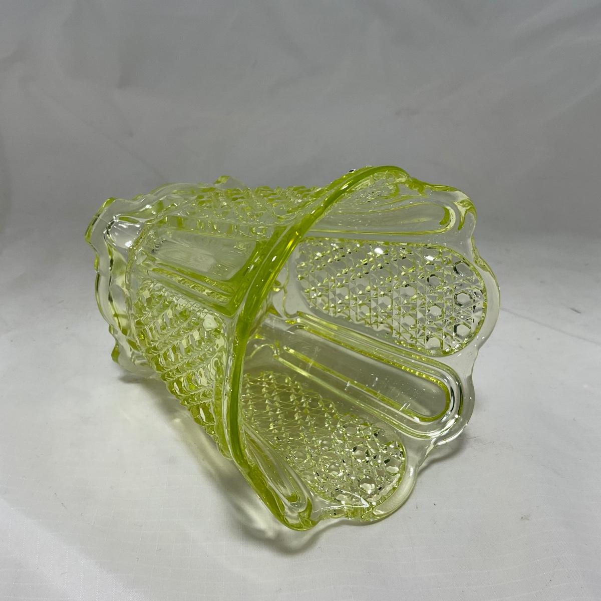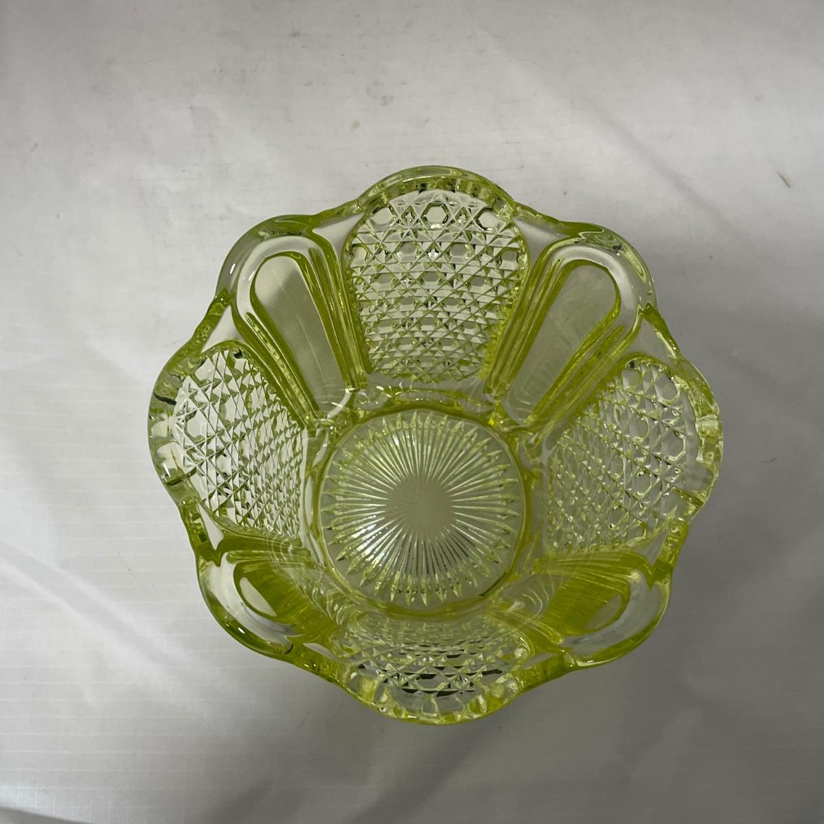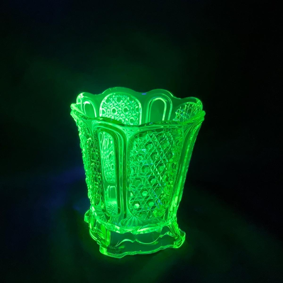 One in beautiful condition yellow Vaseline or uranium glass vase. This piece has an amazing glow due to the uranium under a black light. Please see photos for details and condition. ::: Shipping is available on this lot. If you require shipping you must let us know at the close of the auction. We will coordinate with you after the item has been won. Shipping fees will include insurance up to or exceeding the value of all items being mailed. If you have any questions regarding this lot please contact the auctioneer either via this website, by direct email or by phone. PICK UP TIMES and other important information can be found in the TERMS and DESCRIPTION of the auction. Please take a look for pertinent information. Thanks!