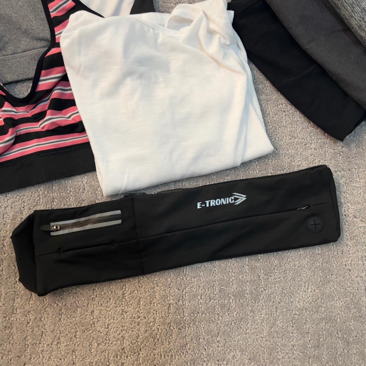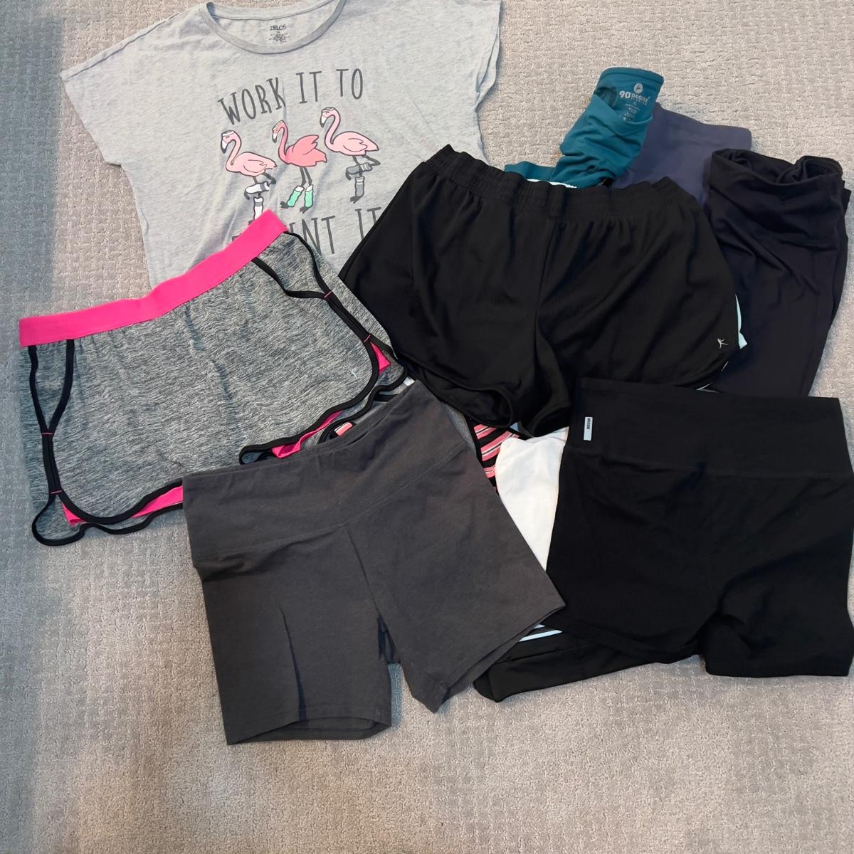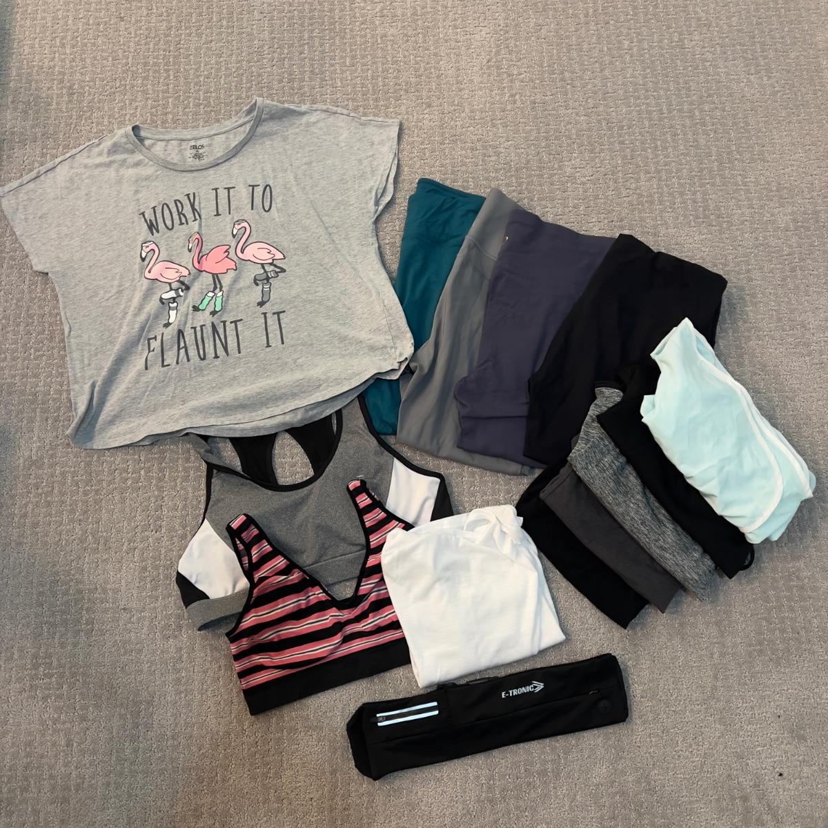 5x shorts, 1 x tank top, 4x leggings, 2x sportsbras, E tronic belt , 1x flamingo t-shirt