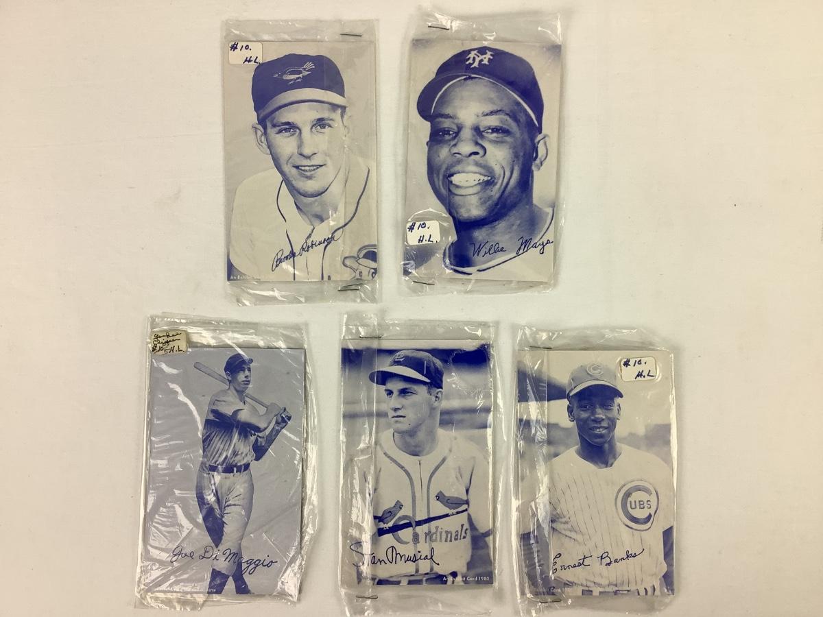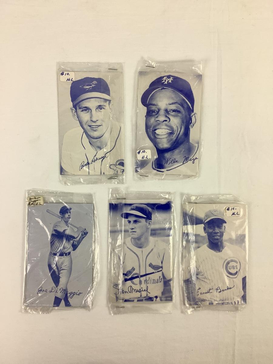 1980 Exhibit Cards featuring Joe DiMaggio, Willie Mays, Brooks Robinson, Ernest Banks & Stan Musial. Set of 5.