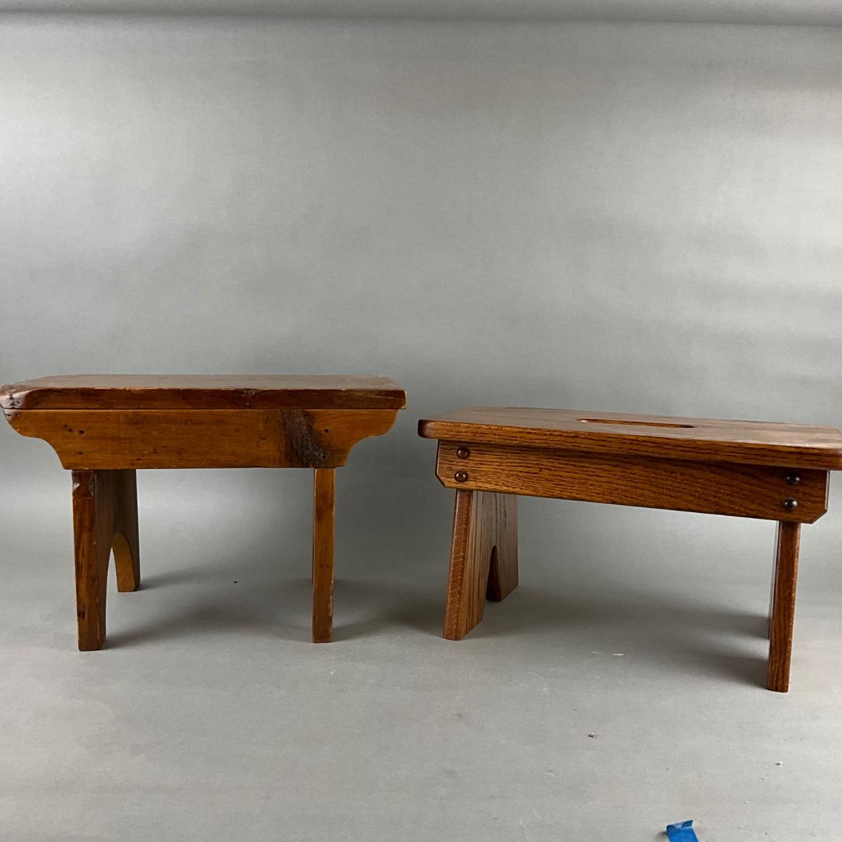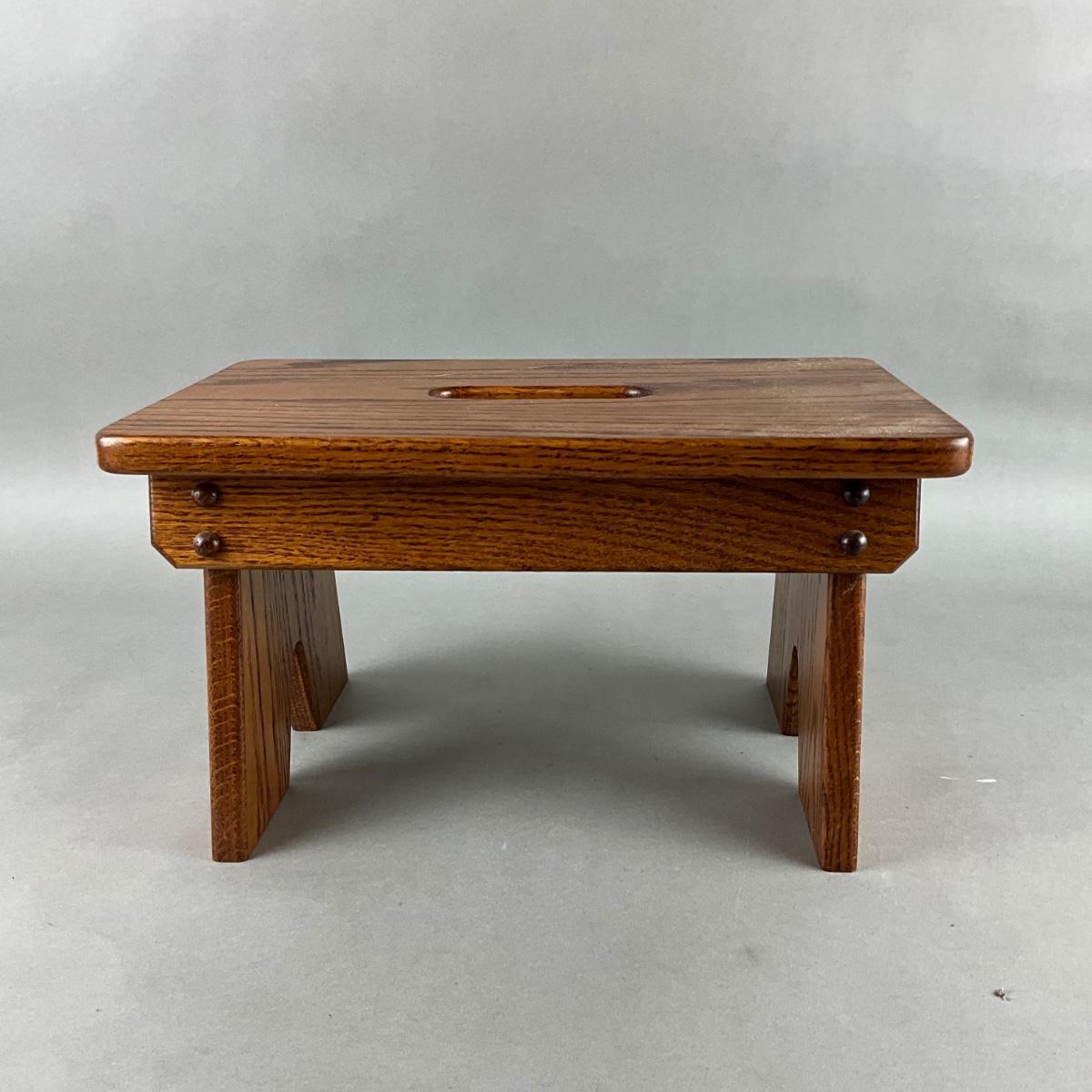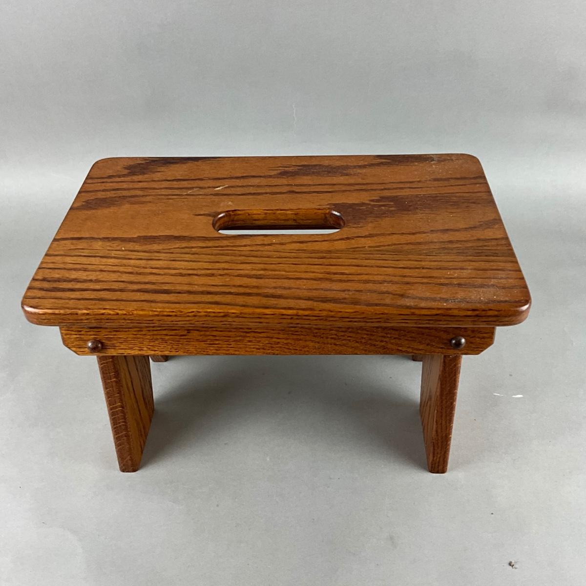 Oak stool measures 10" deep x 16" wide x 9.25" high