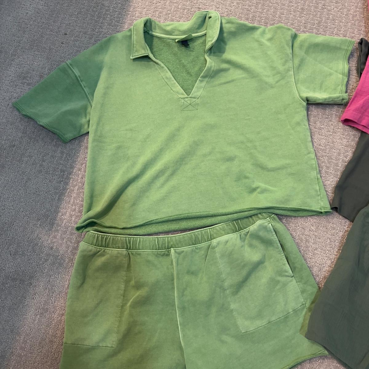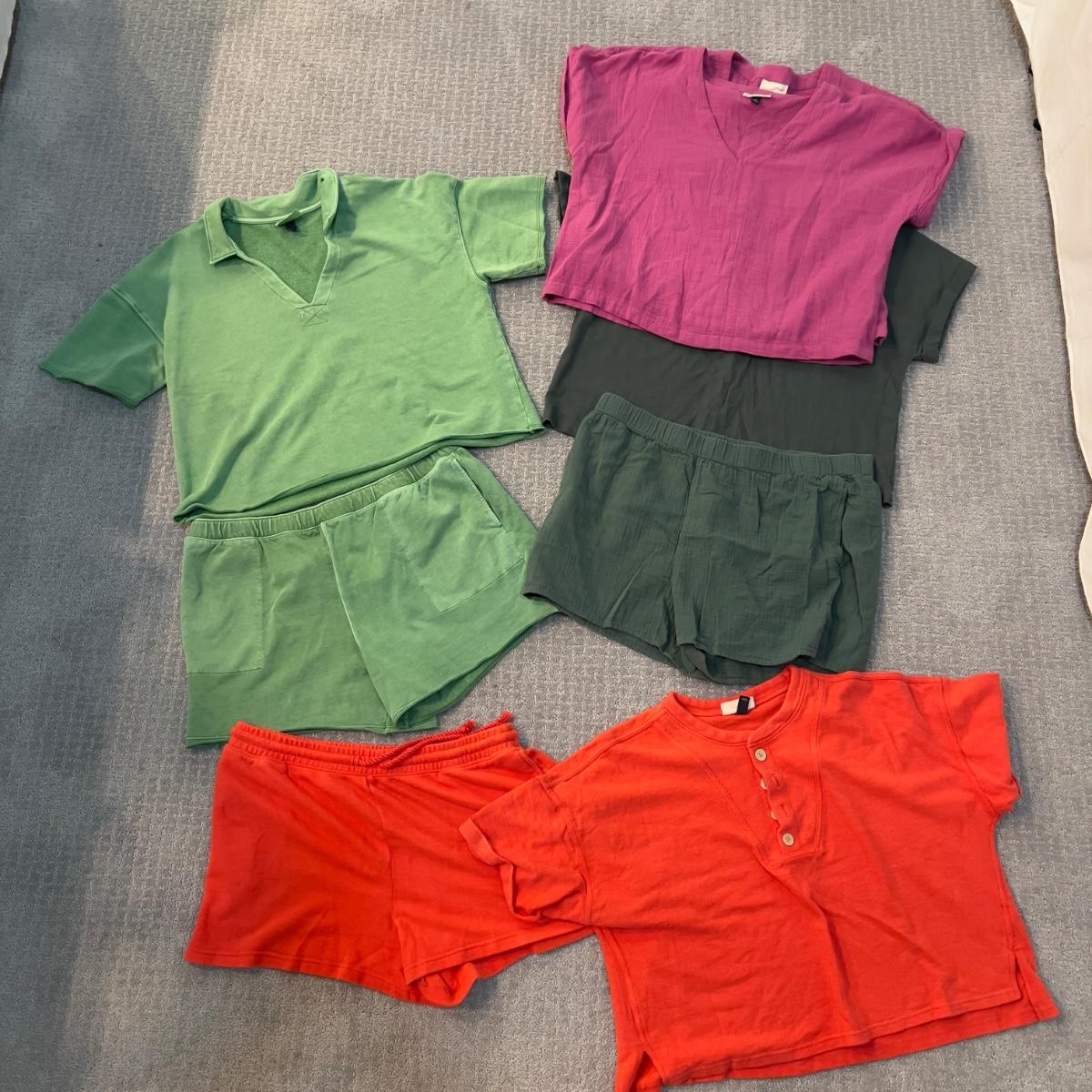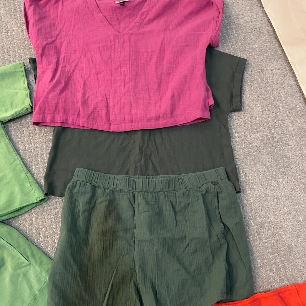 Light green cotton set XXL , dark green set, orange set, 2x identical purple tops, elastic waist, pull over tops