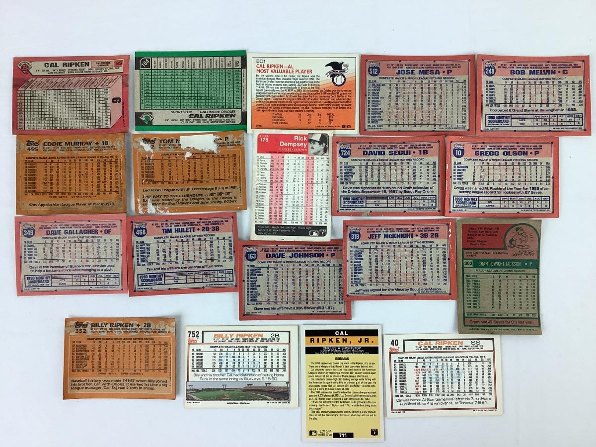 Assorted Vintage Topps, Fleer, Bowman & Donruss Baltimore Orioles Baseball Cards featuring Cal Ripken, Cal Ripken Jr., Billy Ripken, Grant Jackson, Gregg Olson, Bob Melvin, Jeff McKnight, Dave Johnson, Tim Hulett, Dave Gallagher, Dave Segui, Ricky Dempsey, Tom Niedenfuer, Eddie Murray & Jose Mesa.