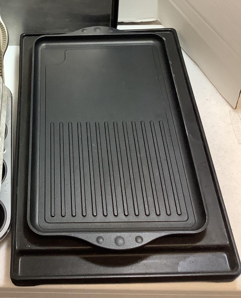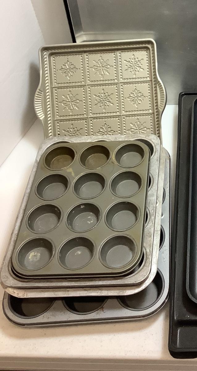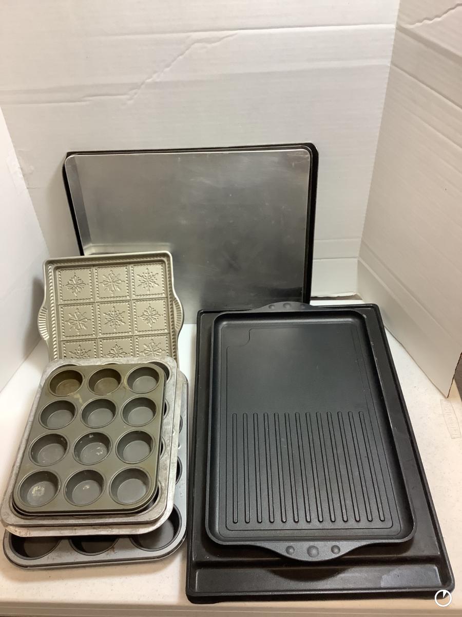 F537 Lot of Baking Sheets, Cast Iron Griddle, Muffins Pans in Various Sizes