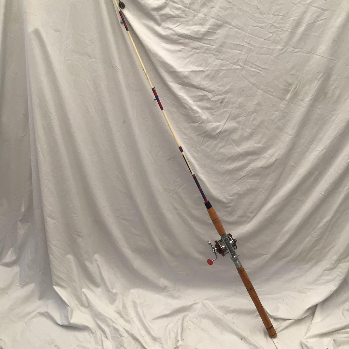 5’6” Glass light Sears and Roebuck fishing rod with a Penn peerless #9 fishing rod with red handle knob