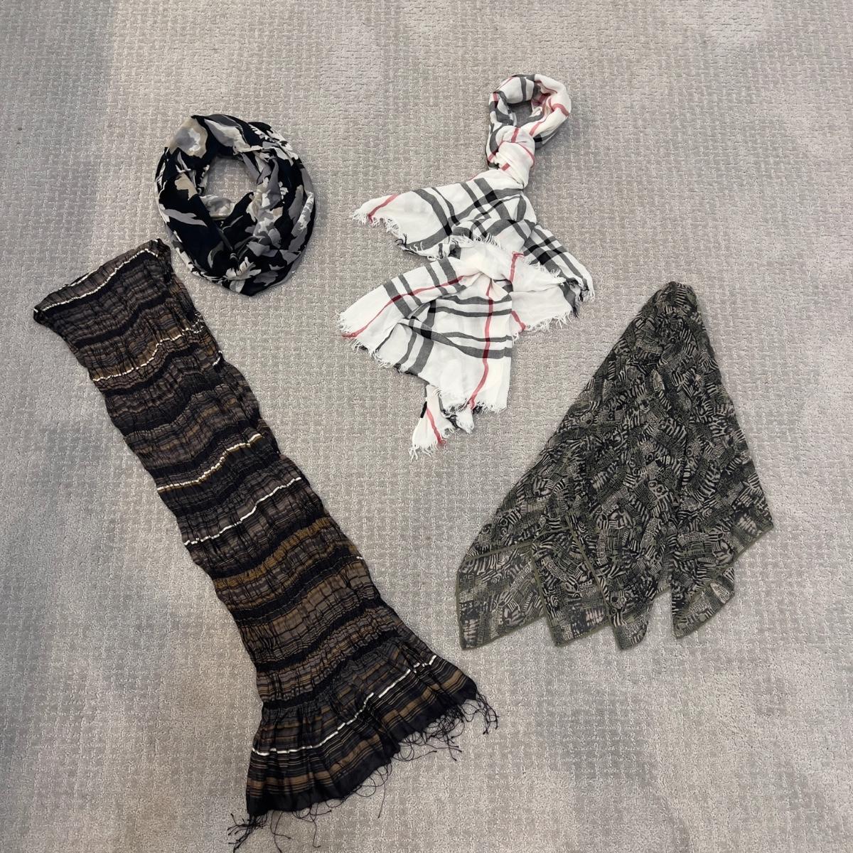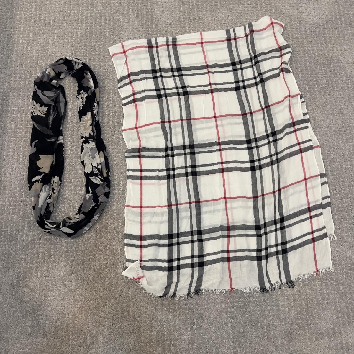Black white and red plaid scarf with infinity scarf and metallic stripes scarf by Eileen fisher