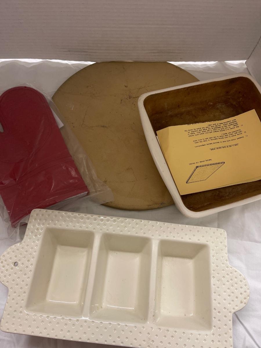 538 Lot of Pampered Chef Baking Stone, Casserole, Carrier , silicone glove and three dish by Nora Fleming