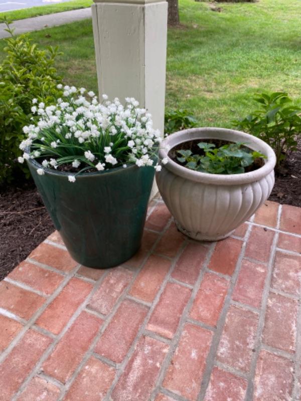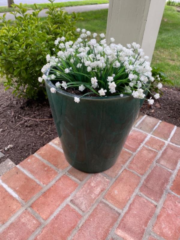 Pottery Planter with faux flowers measuring 16” round x 16.5” tall