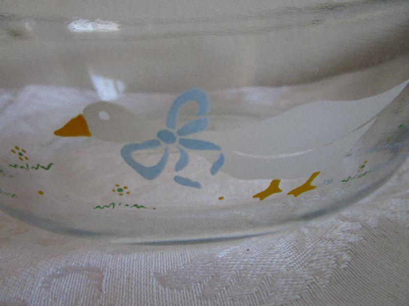 Anchor Hocking casserole/serving bowl with goose on the front, 8.25" around, 1.5 quart; 1- 9" Chateau bowl, 2- 7.5" Sierra bowls