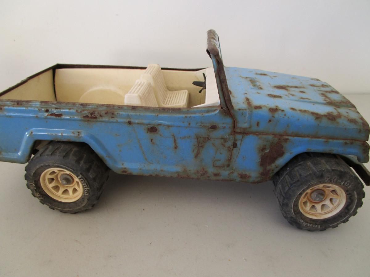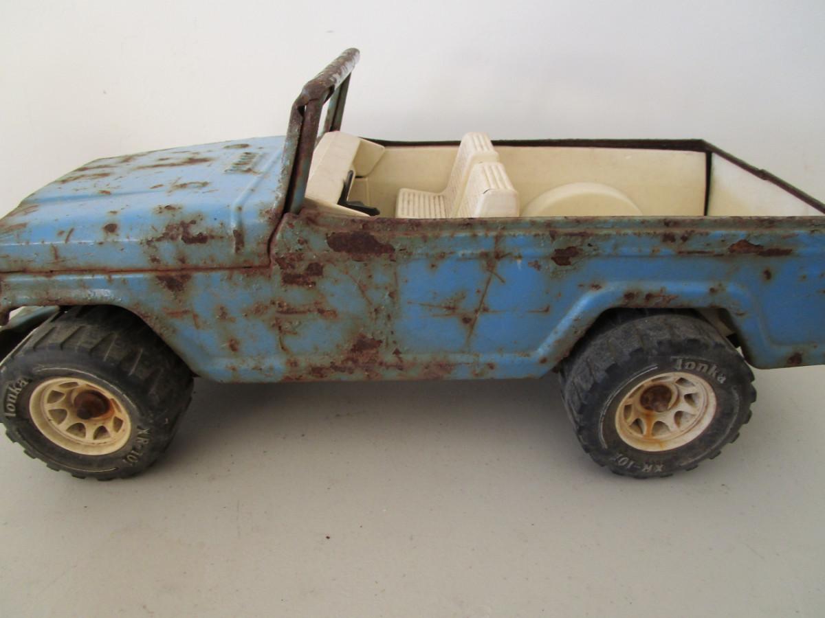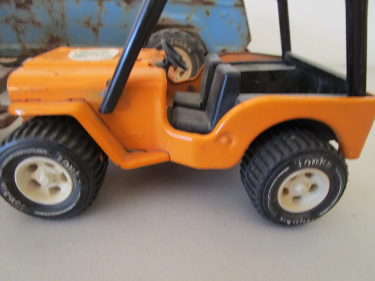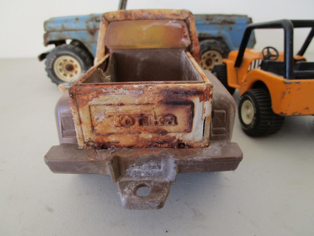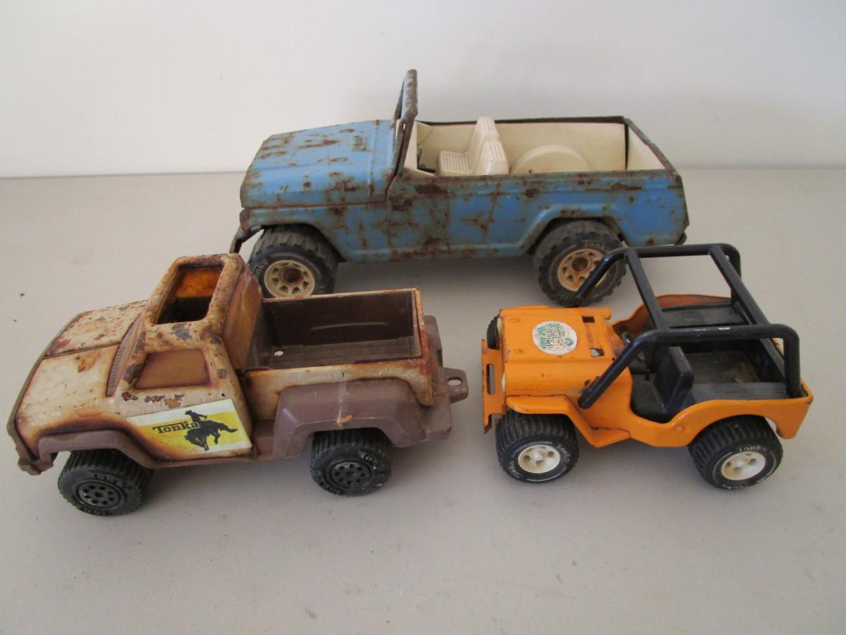 Tonka Blue Jeep 13"x5"x5"; Tonka Truck 8.5"x4"x4.5"; Yellow Jeep 6"x3.5"x3.75"