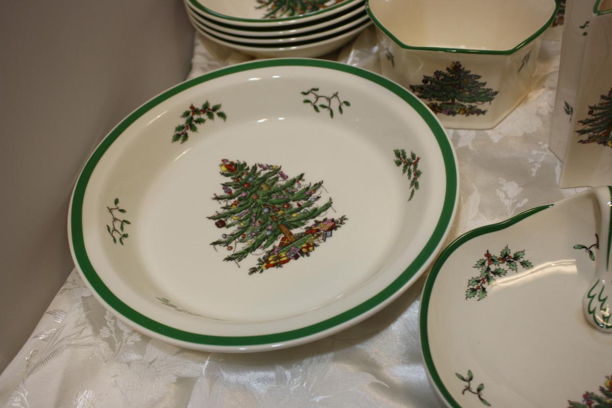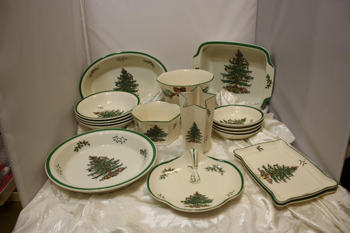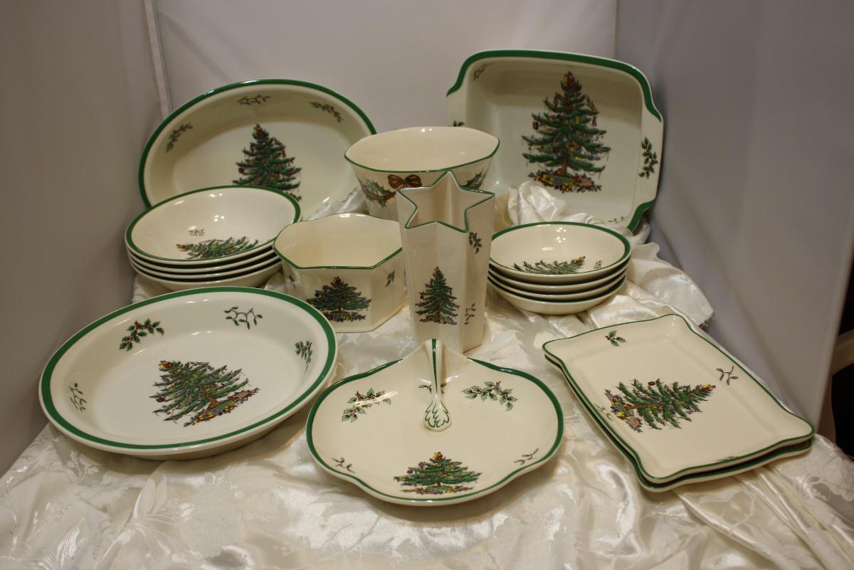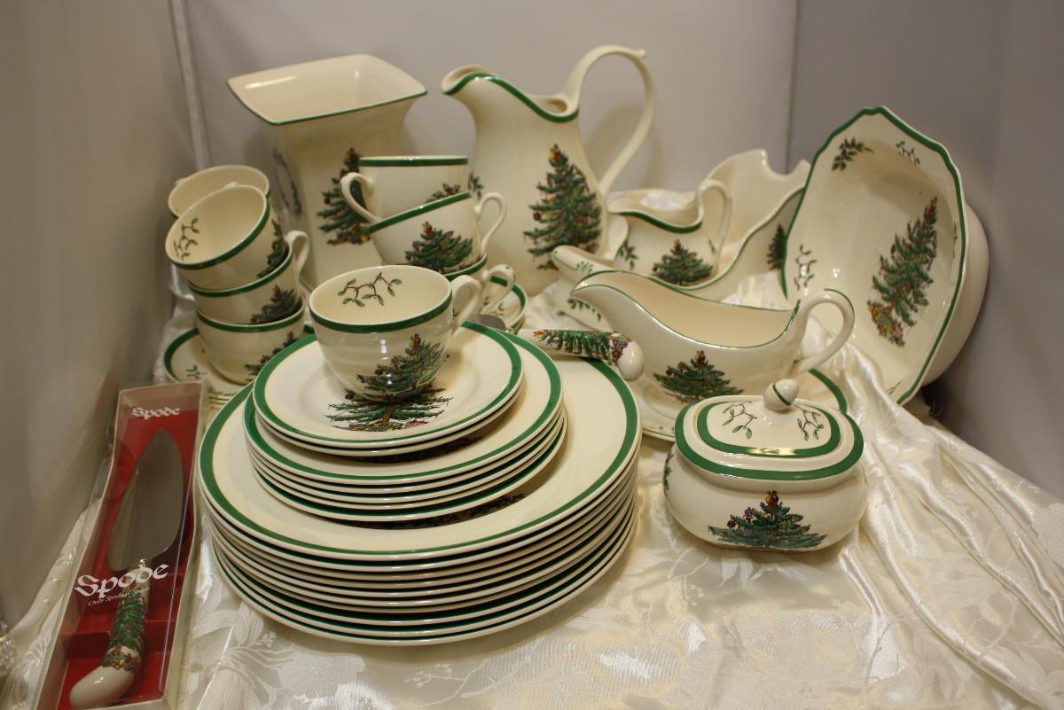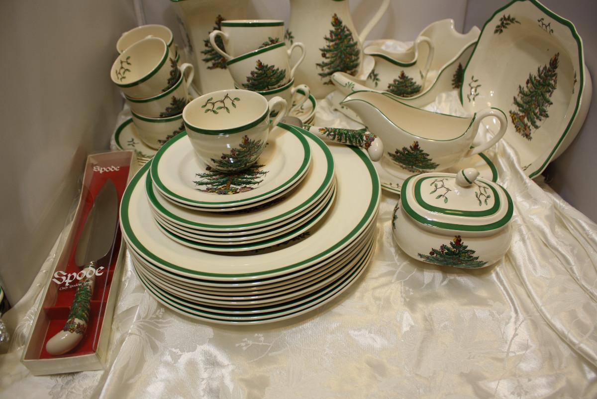 54 pieces Spode (plus 2 non-Spode Christmas pie servers) including 10 dinner plates, 10 cup & saucer sets, vases, pitcher, sugar & creamer, gravy boat, 50th Anniversary vase/bowl, trays, bowls and more. All in very good condition. I did not find any chips or cracks BUT there might be one somewhere. LOCAL PICK UP IN CORVALLIS OREGON ONLY.