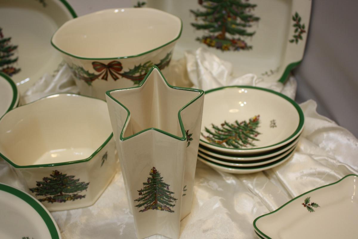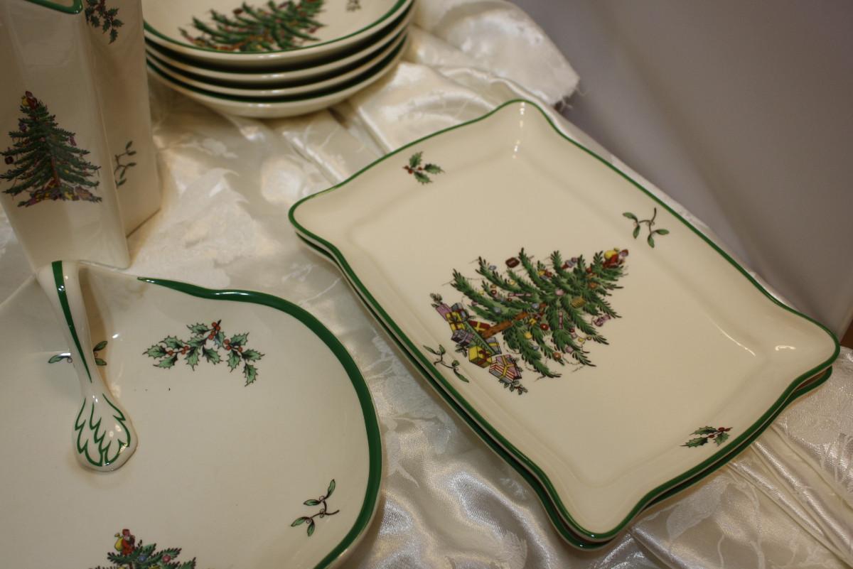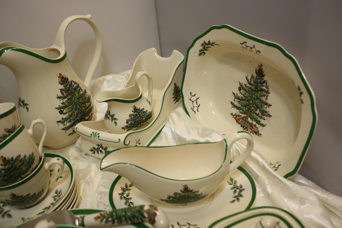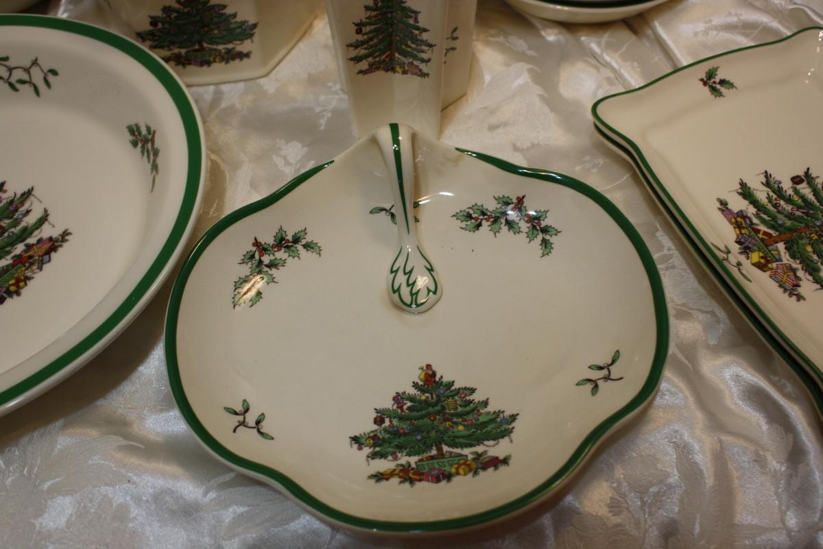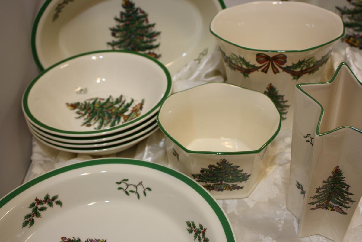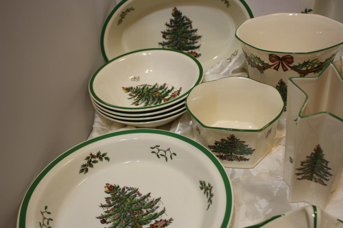 54 pieces Spode (plus 2 non-Spode Christmas pie servers) including 10 dinner plates, 10 cup & saucer sets, vases, pitcher, sugar & creamer, gravy boat, 50th Anniversary vase/bowl, trays, bowls and more. All in very good condition. I did not find any chips or cracks BUT there might be one somewhere. LOCAL PICK UP IN CORVALLIS OREGON ONLY.