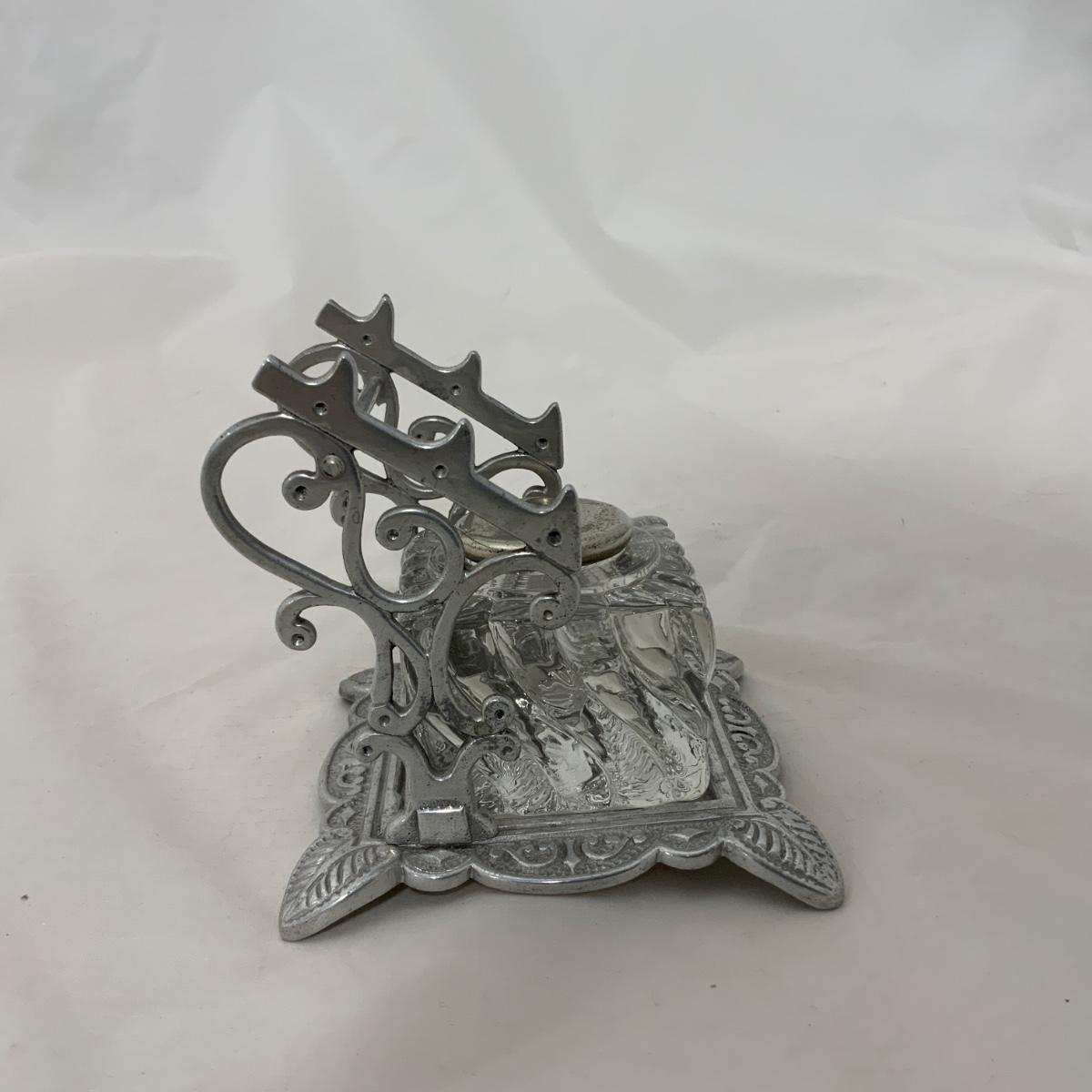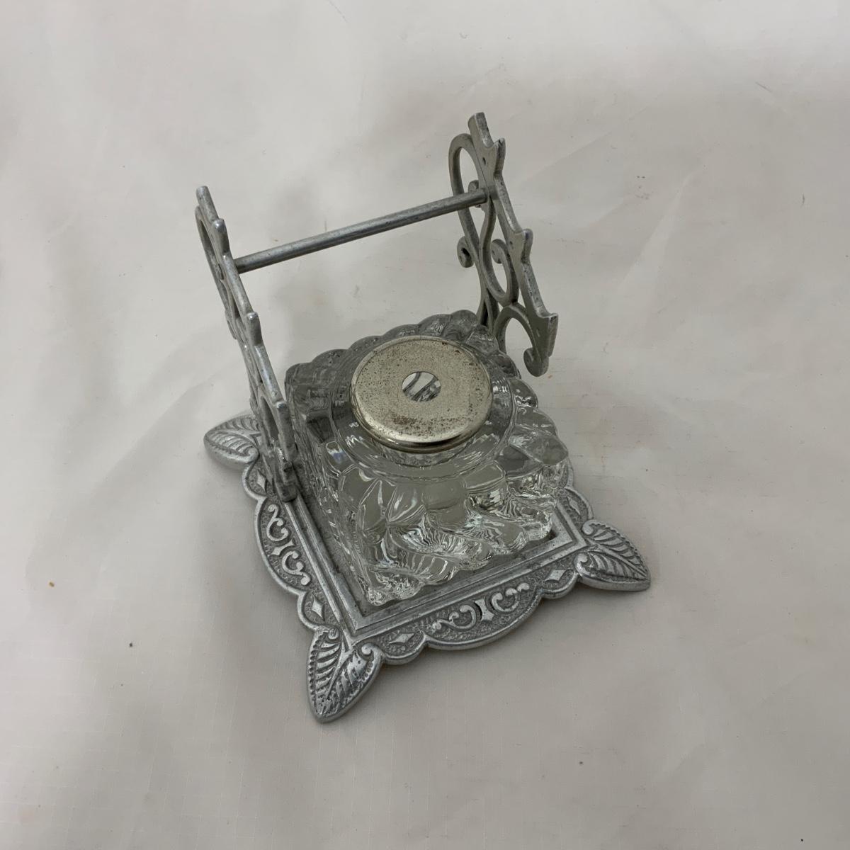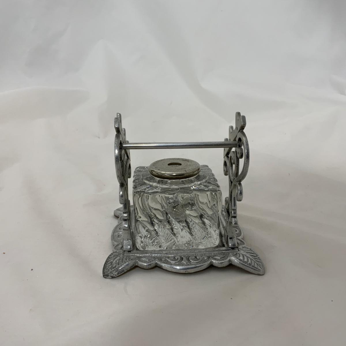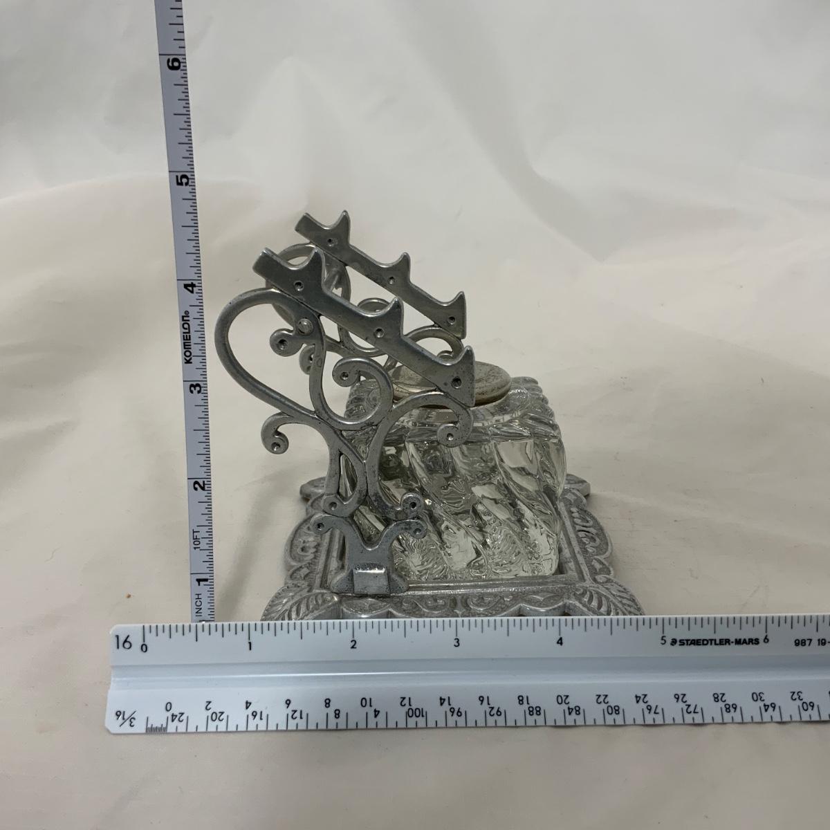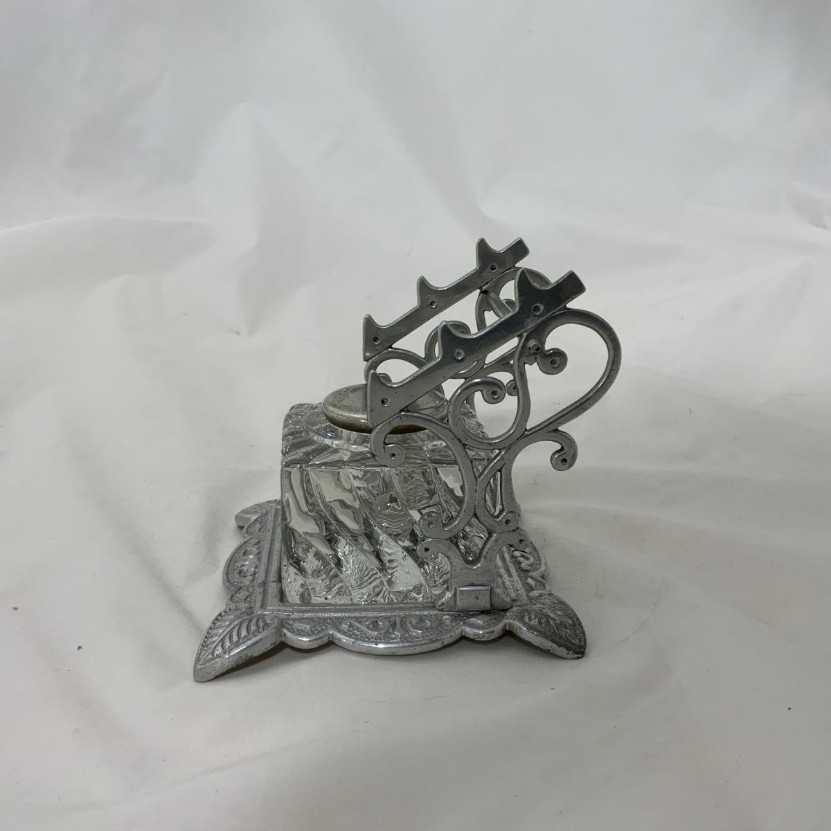 A bit antiquated, but still very attractive. This ink well is made of heavy glass and the stand has been silvered. You are able to hold two pens on the top branches, so that you are always at the ready, regardless of whether you have broken a nib. Please see photos for details and condition. ::: Shipping is available on this lot. If you require shipping you must let us know at the close of the auction. We will coordinate with you after the item has been won. Shipping fees will include insurance up to or exceeding the value of all items being mailed. If you have any questions regarding this lot please contact the auctioneer either via this website, by direct email or by phone. PICK UP TIMES and other important information can be found in the TERMS and DESCRIPTION of the auction. Please take a look for pertinent information. Thanks!