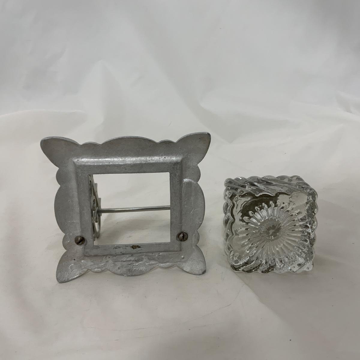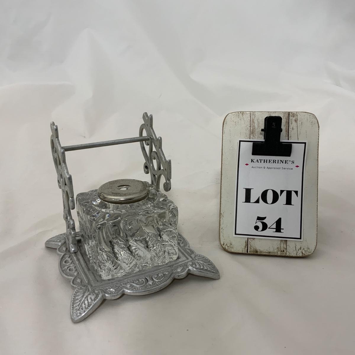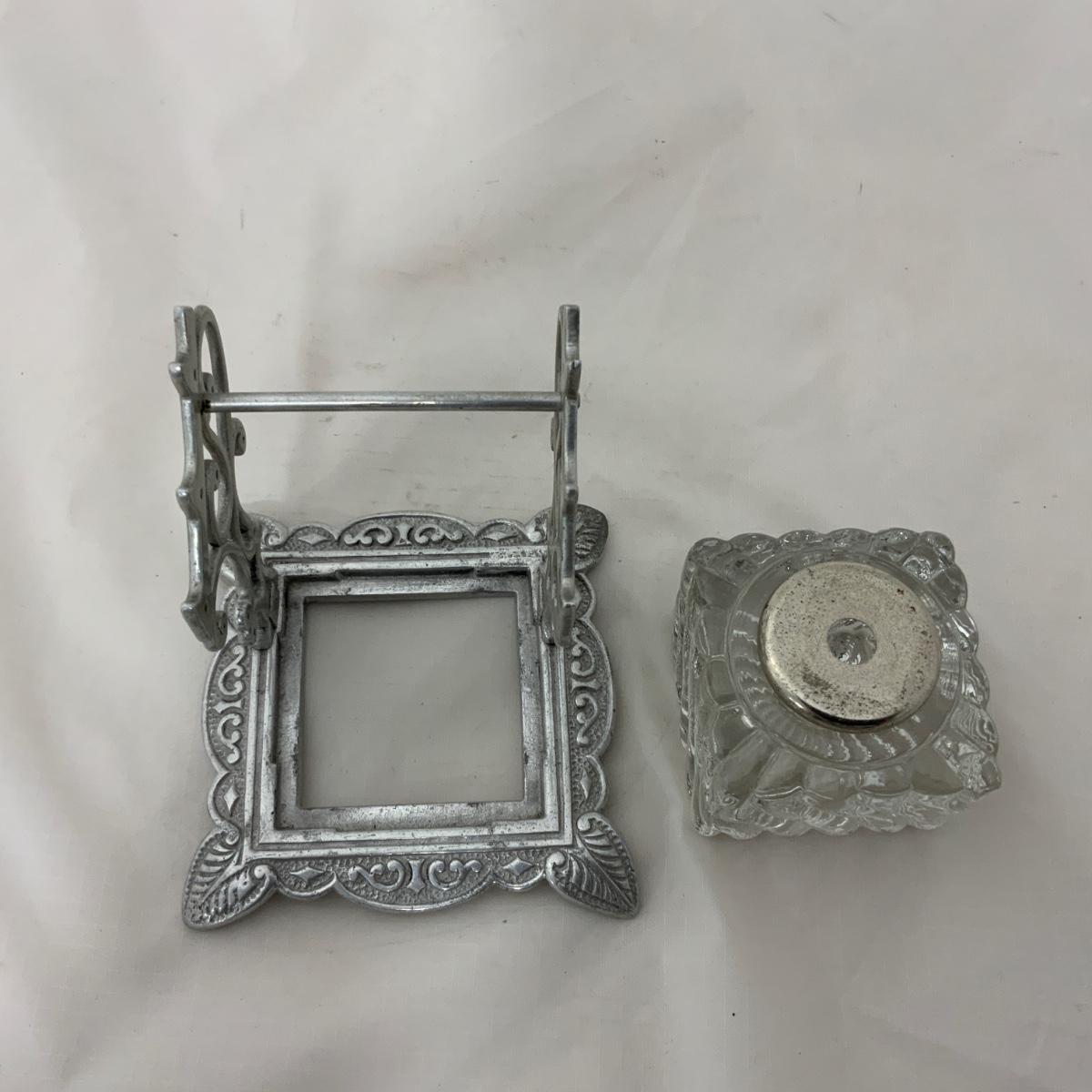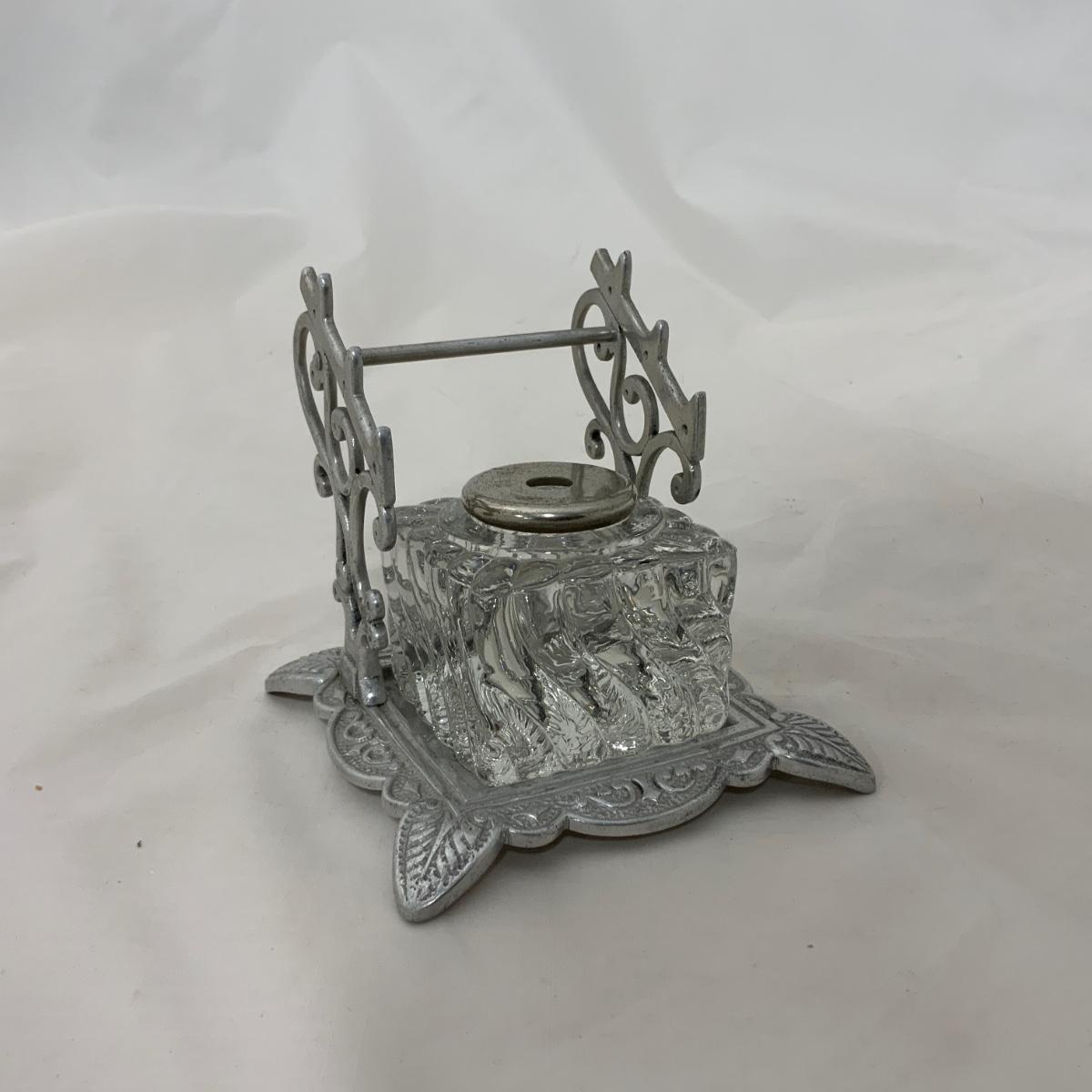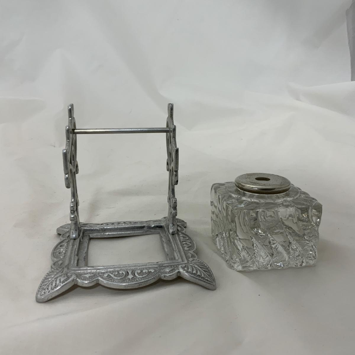 A bit antiquated, but still very attractive. This ink well is made of heavy glass and the stand has been silvered. You are able to hold two pens on the top branches, so that you are always at the ready, regardless of whether you have broken a nib. Please see photos for details and condition. ::: Shipping is available on this lot. If you require shipping you must let us know at the close of the auction. We will coordinate with you after the item has been won. Shipping fees will include insurance up to or exceeding the value of all items being mailed. If you have any questions regarding this lot please contact the auctioneer either via this website, by direct email or by phone. PICK UP TIMES and other important information can be found in the TERMS and DESCRIPTION of the auction. Please take a look for pertinent information. Thanks!
