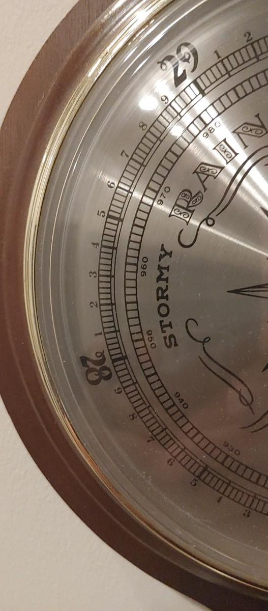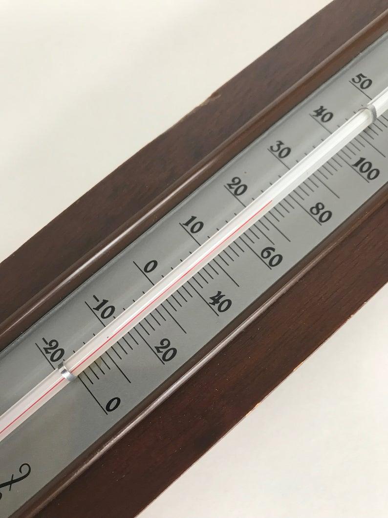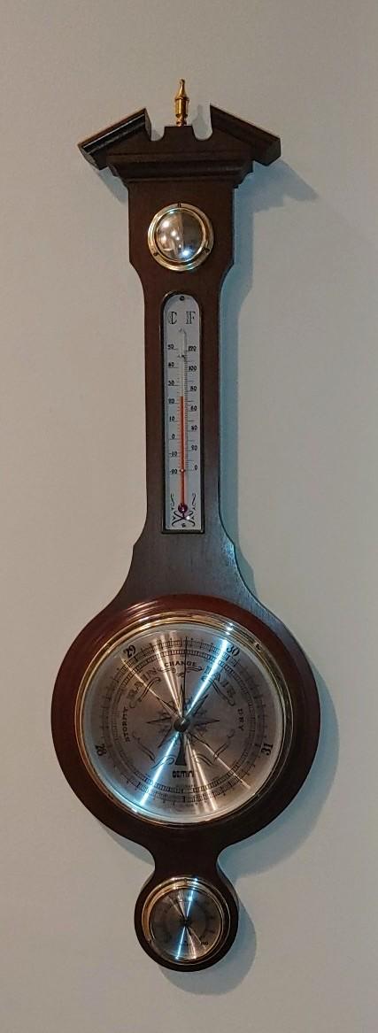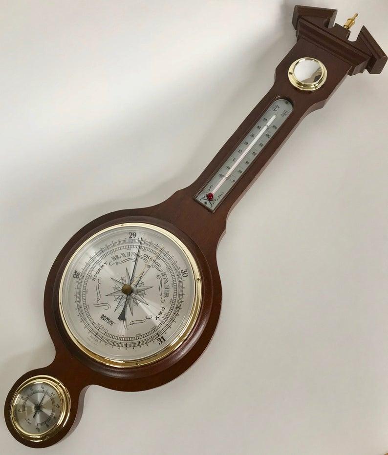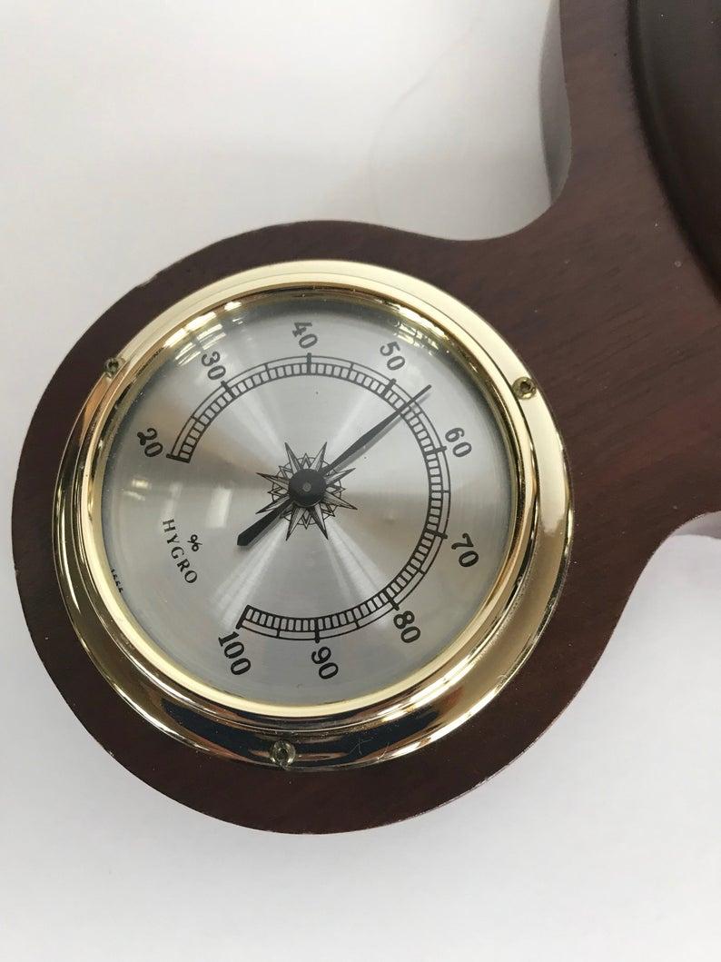 Wood finished mahogany, glass covering on hygrometer, plastic clear cover on barometer, brass