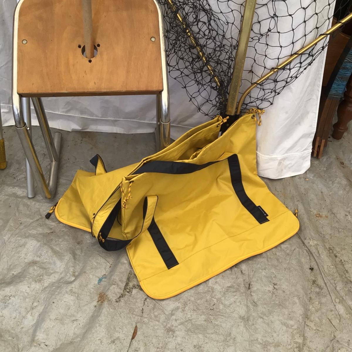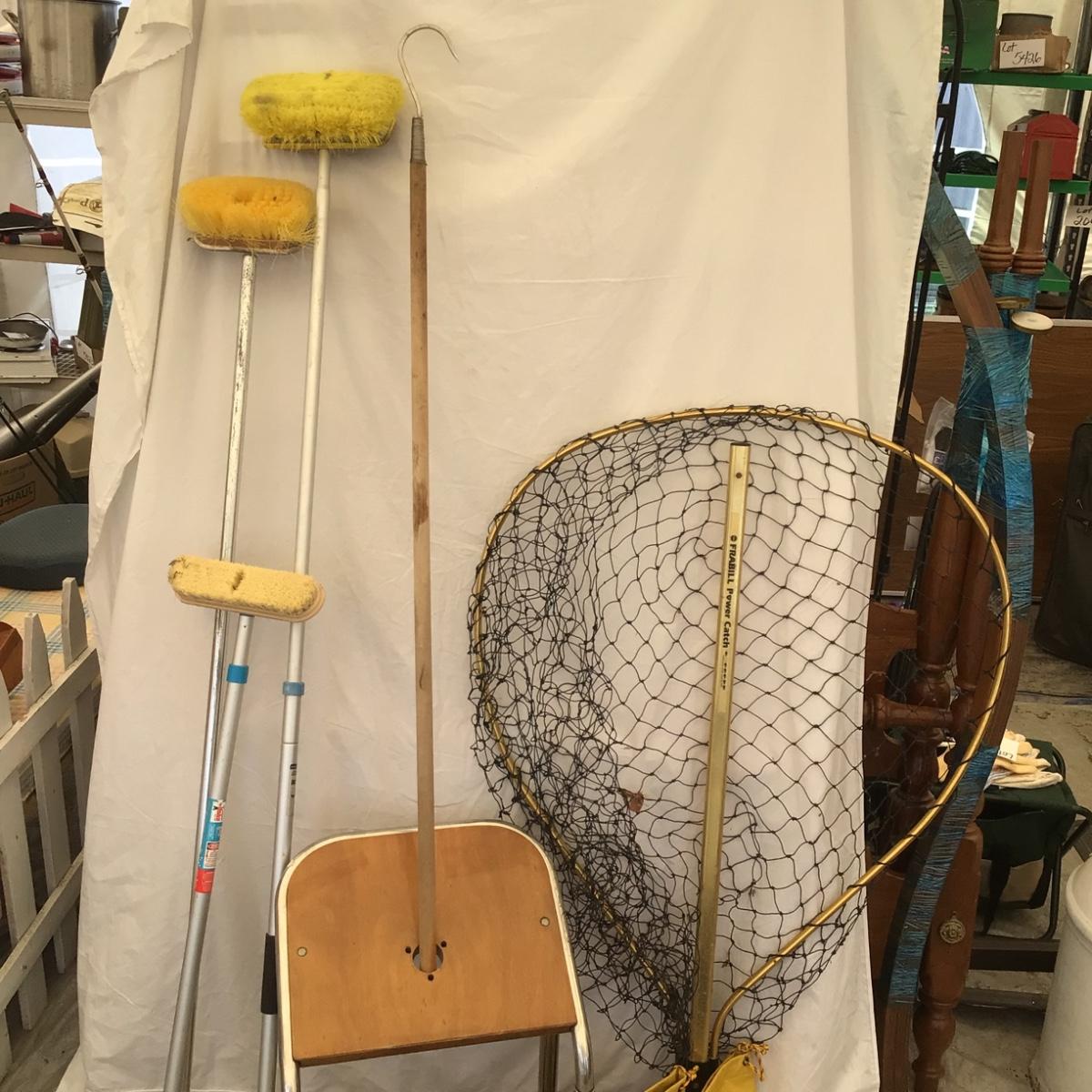 Fish hook , rod holder, three boat brushes and large fish net with two samsonite beach bags