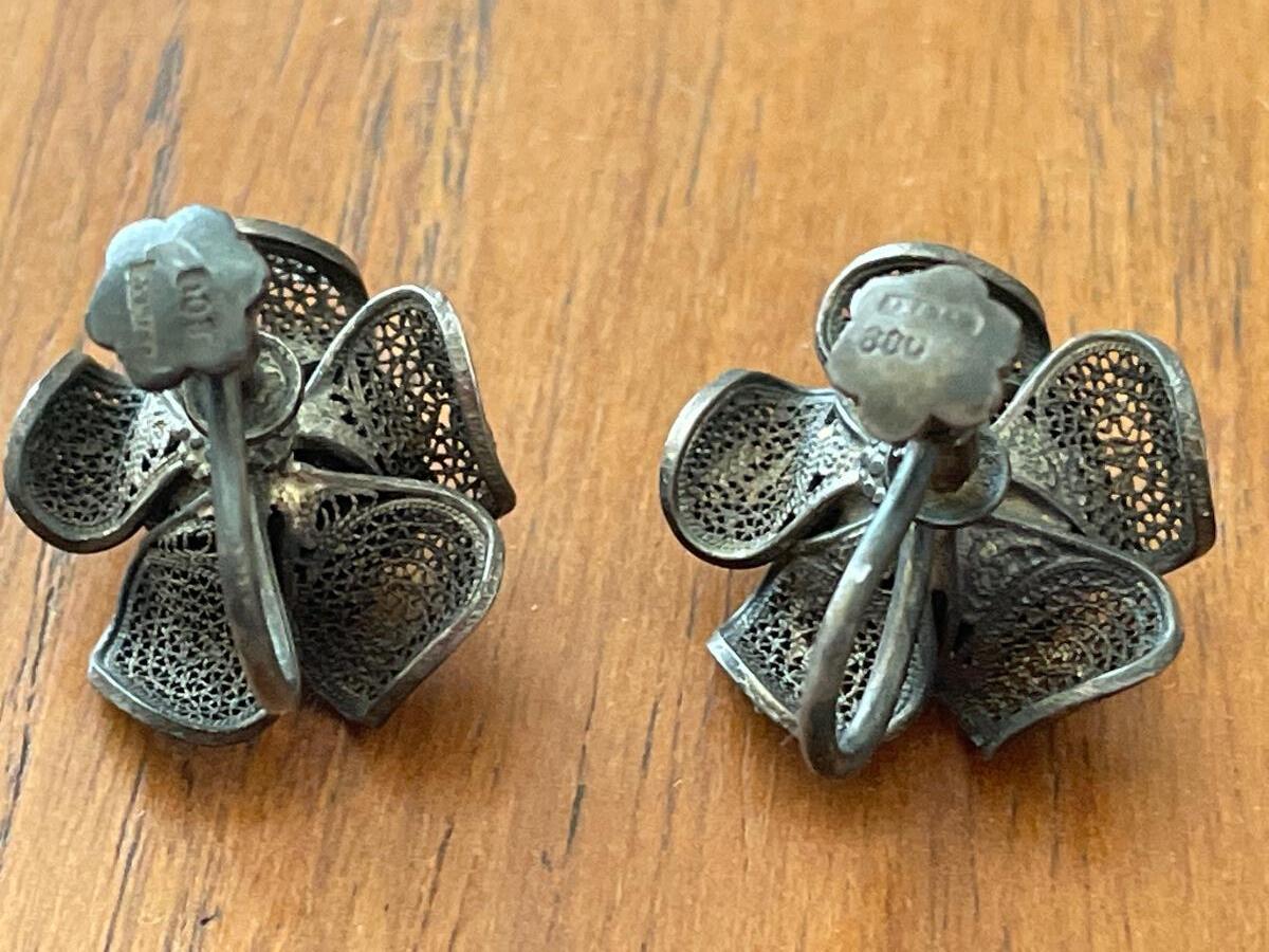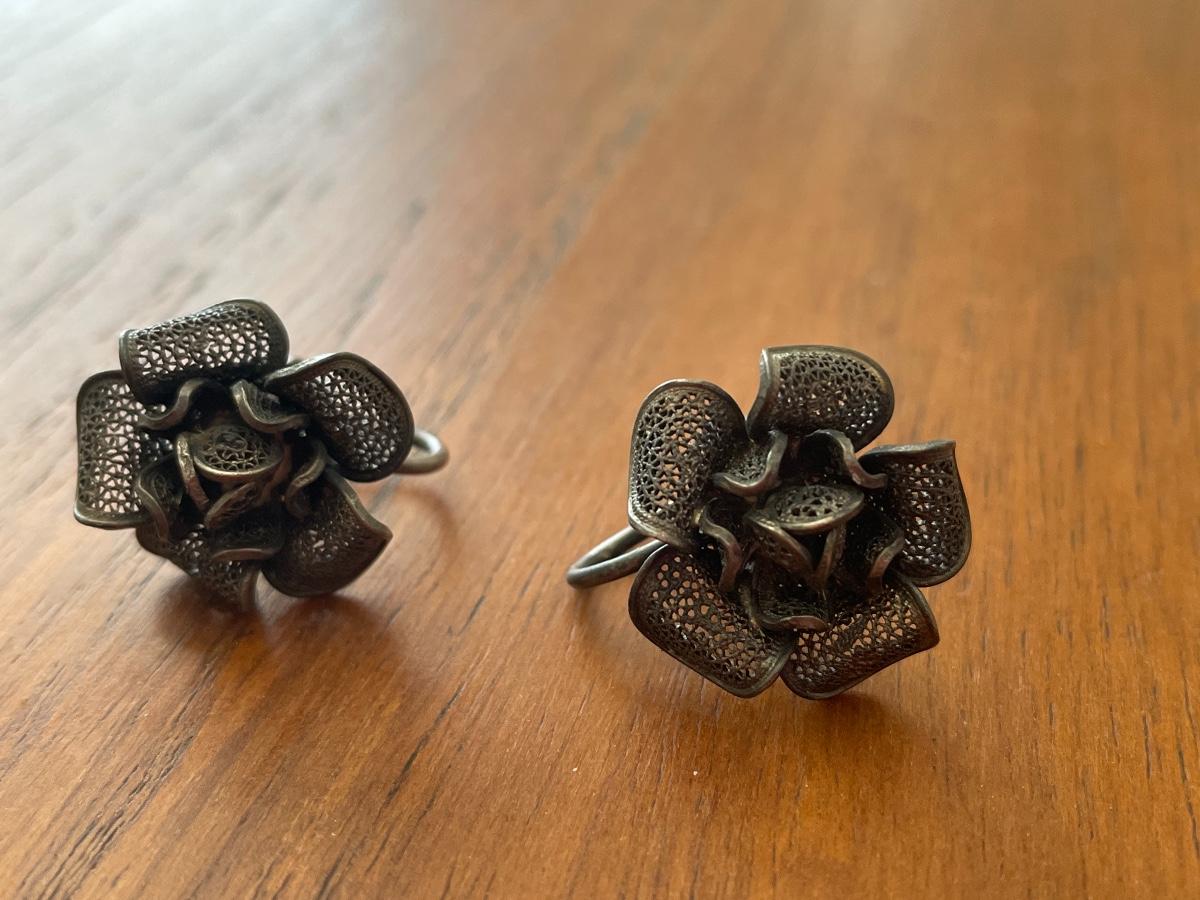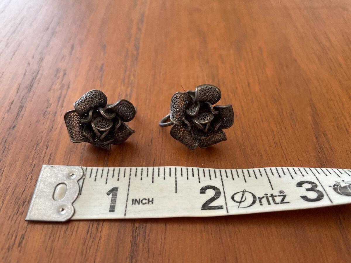 #544 Antique 800 Silver Filigree Roses Screw-back