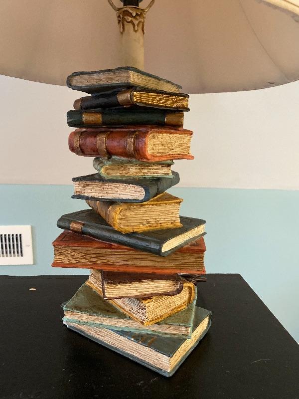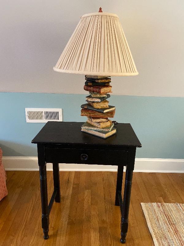 545: Single Drawer Black Painted Wooden Table with Stacked Book Lamp