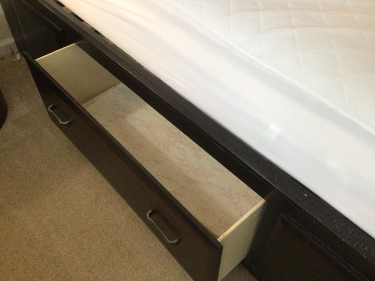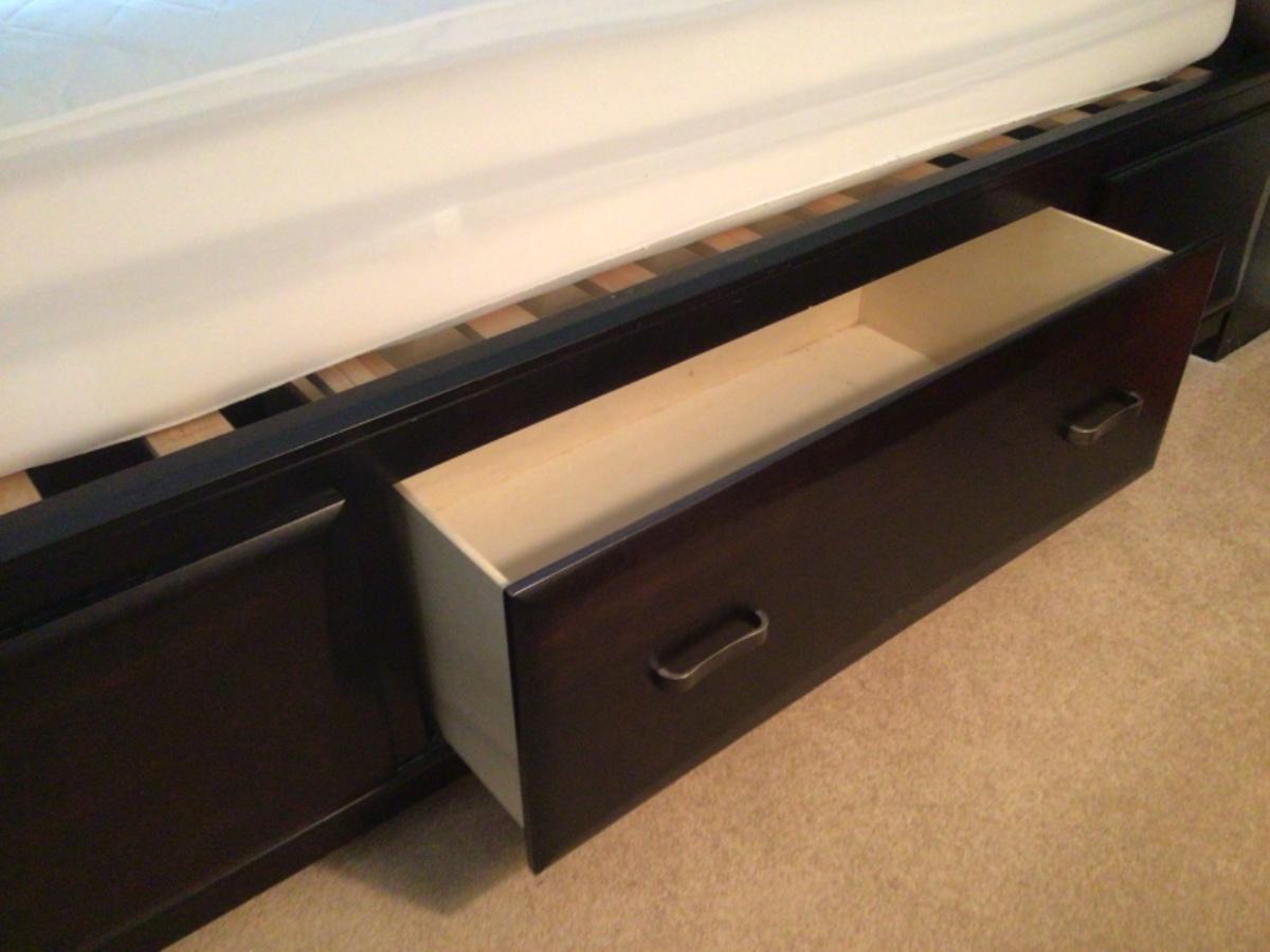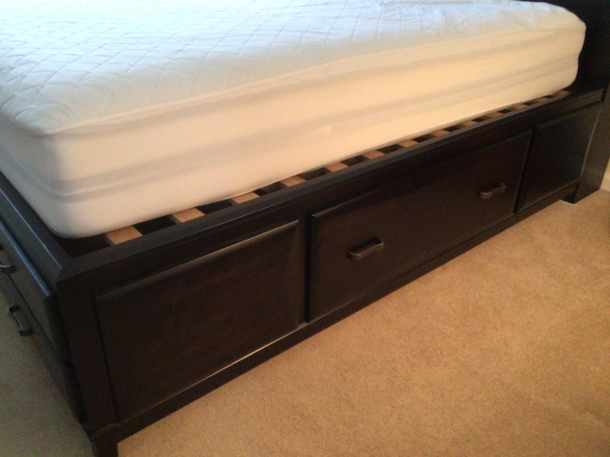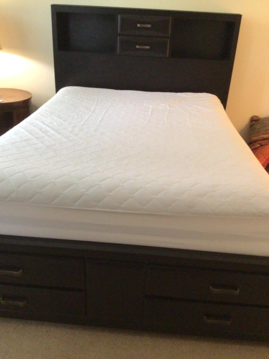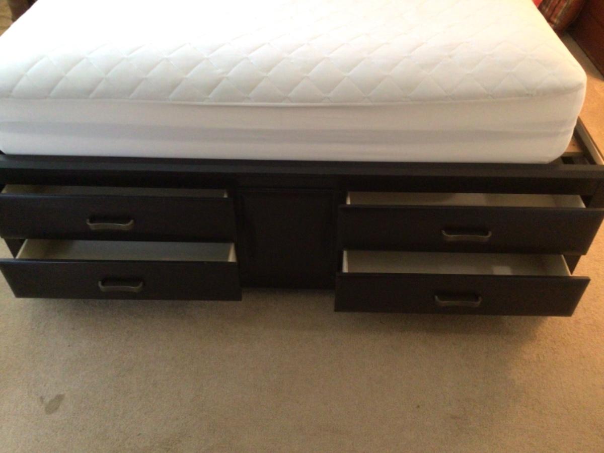 Bed has 8 drawers for storage, built in shelves, headboard 65” wide 10” deep and 57” high, bed is 7’ 10” long, mattress optional