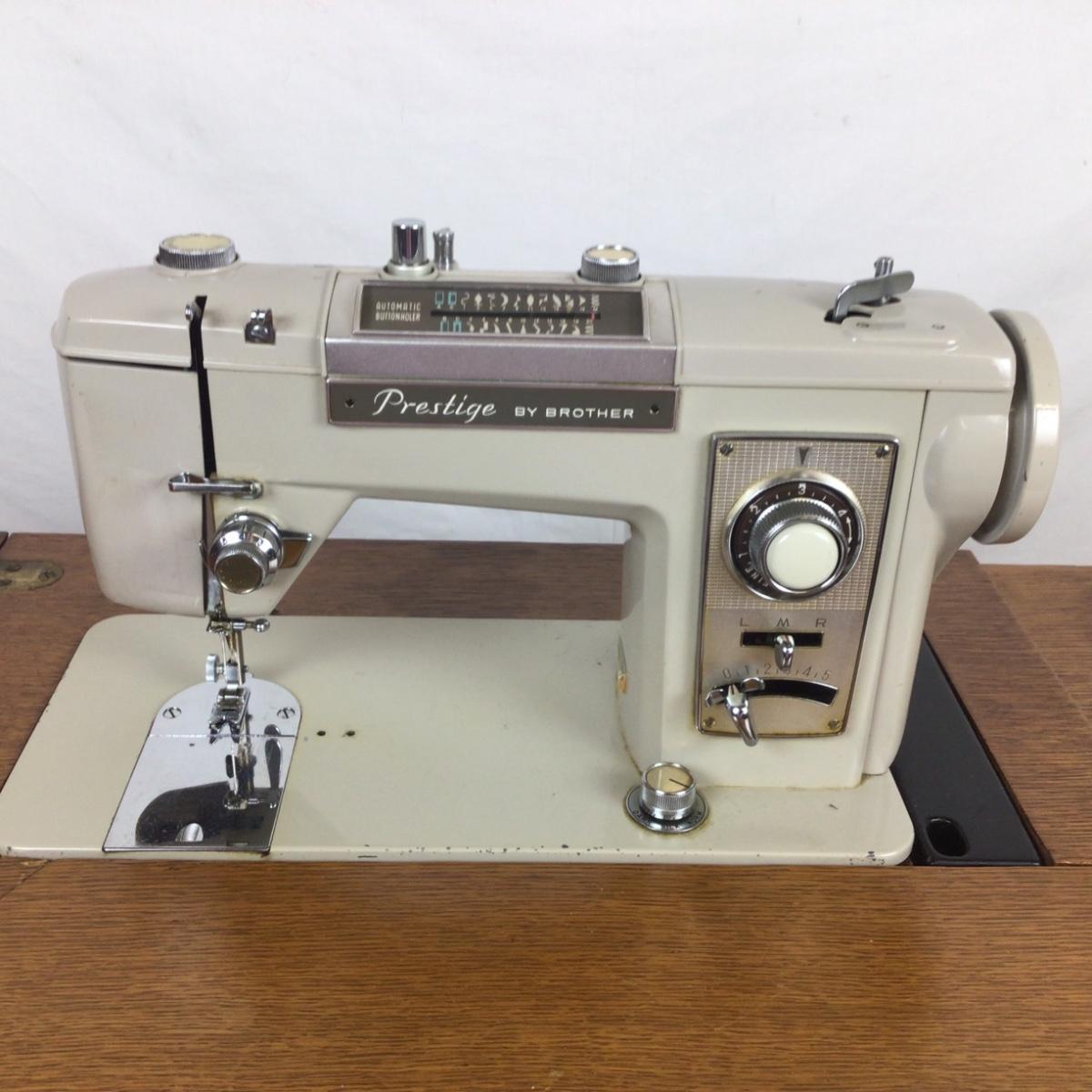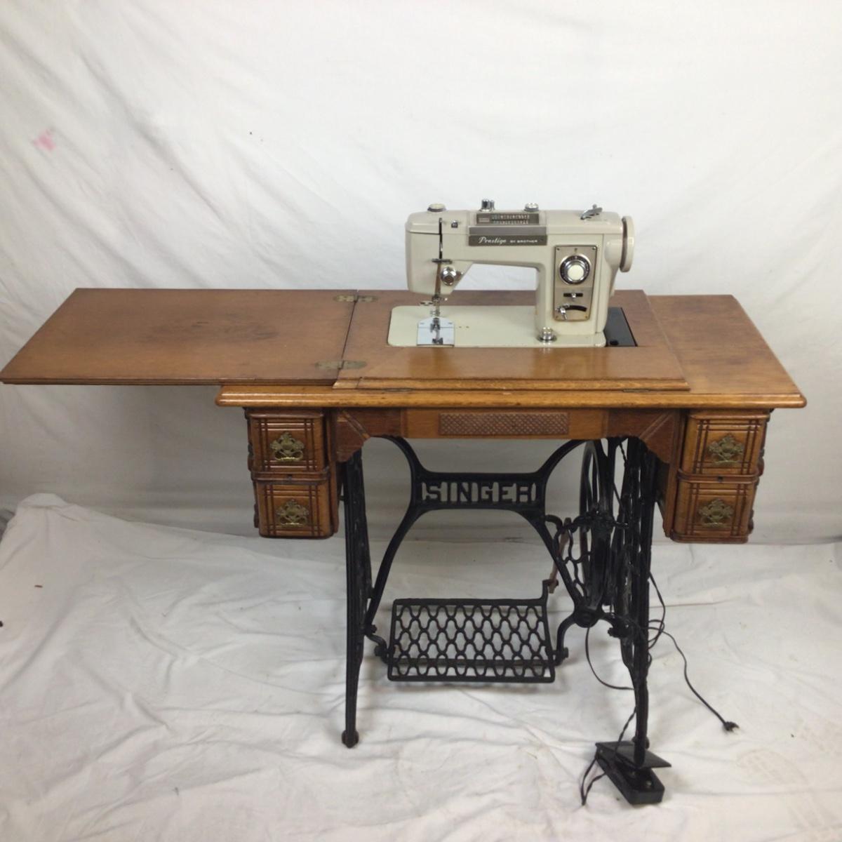 Prestige vintage electric machine by brother fitted into a singer oak stand measuring 36” wide x 18” deep x 31” high